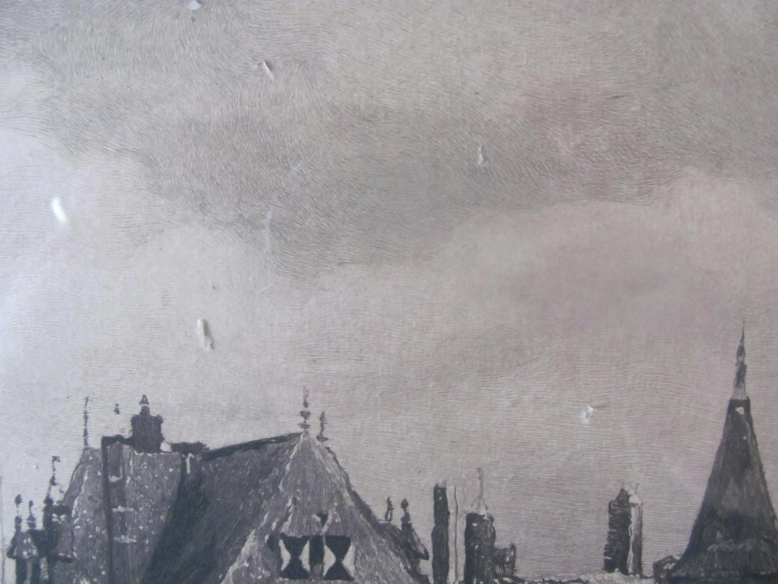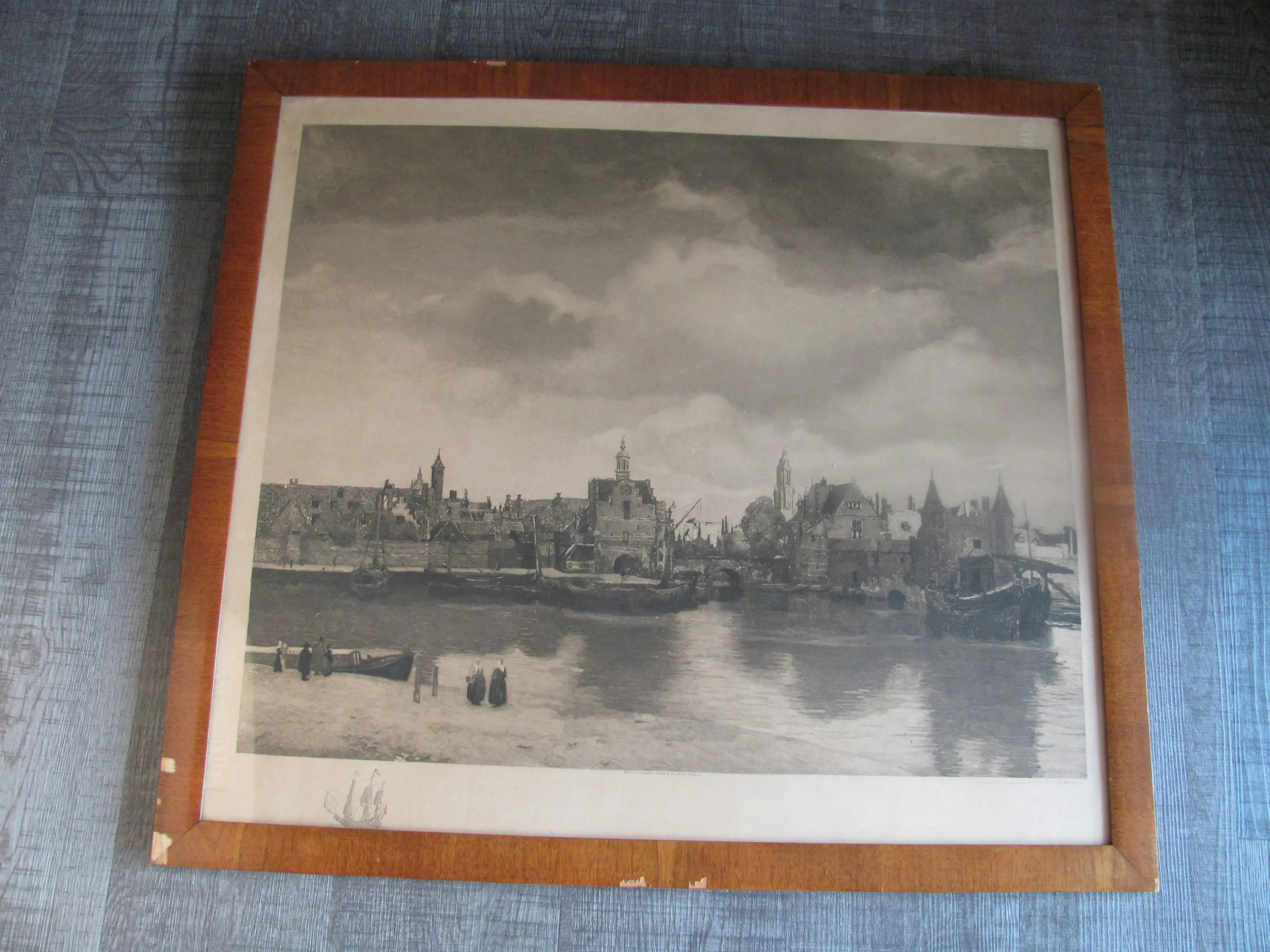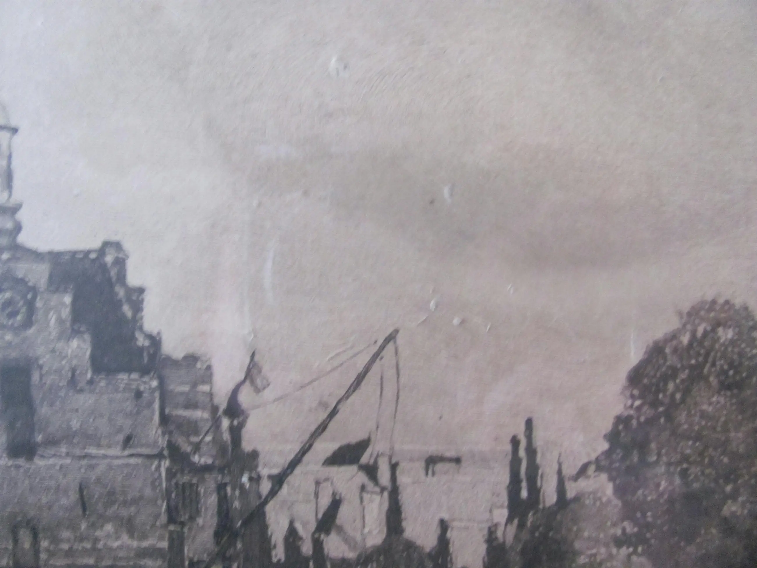 | Gezien de ouderdom van zo'n 125 jaar en de grootte van de afbeelding is deze litho in goede staat. Geen vlekken, wel een luchtbobbeltje (zie de achtste foto). Tussen de glasplaat en de ets lijken wat kleine stukjes papier te zitten, zie de zesde en zevende foto). Ook langs de randen zijn op enkele plekken wat luchtbobbeltjes onder de litho zichtbaar. De lijst vertoont de nodige ouderdomsplekken. (Zie de foto's). | |||