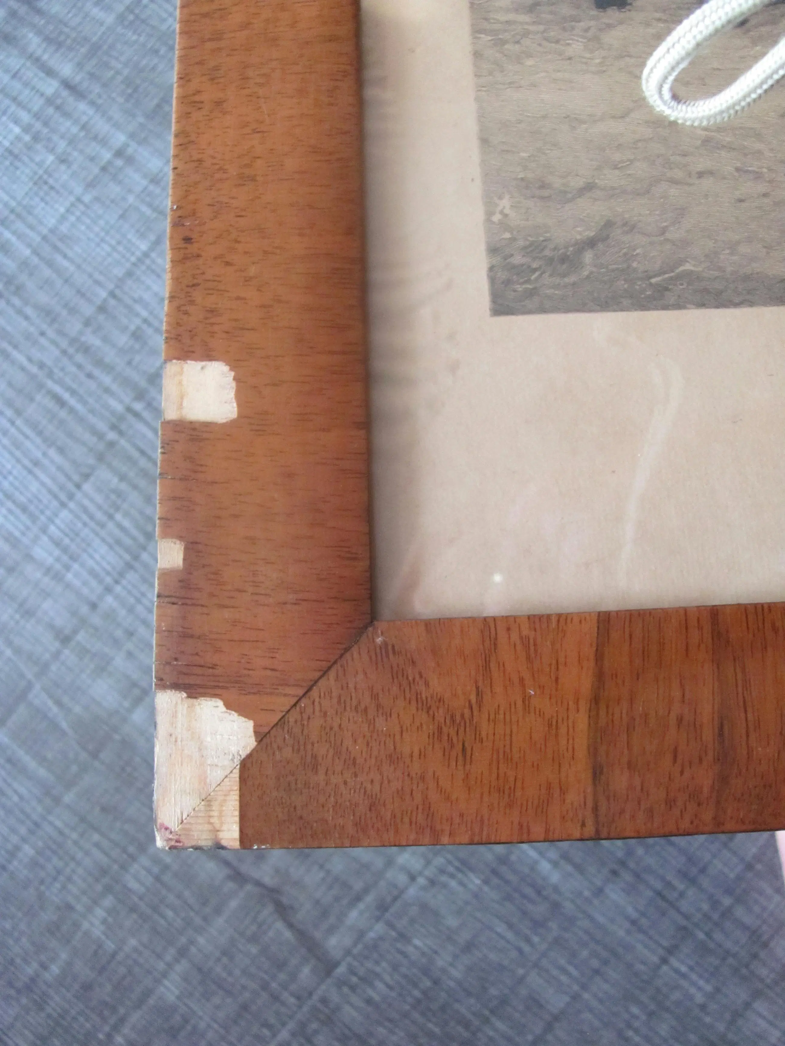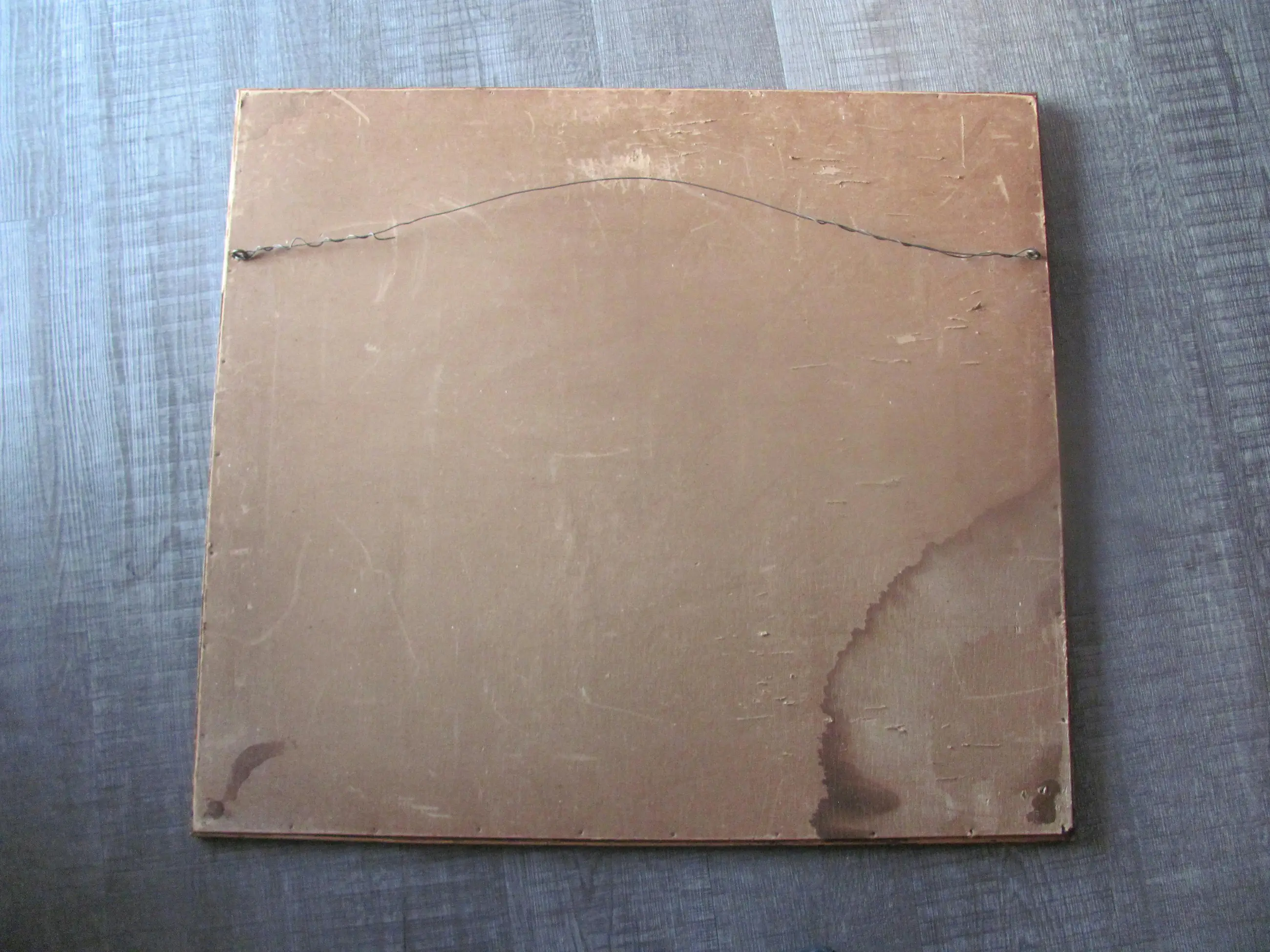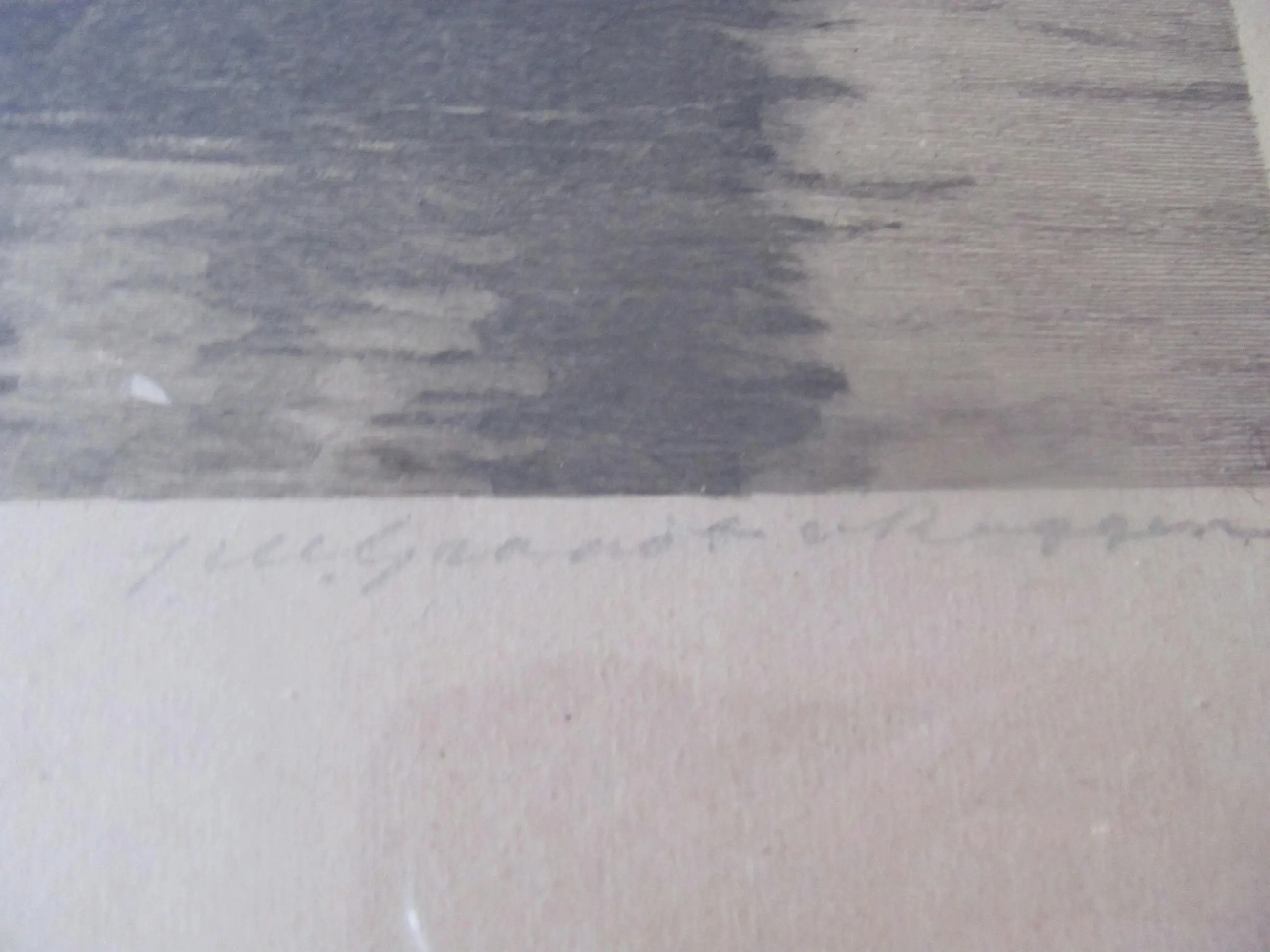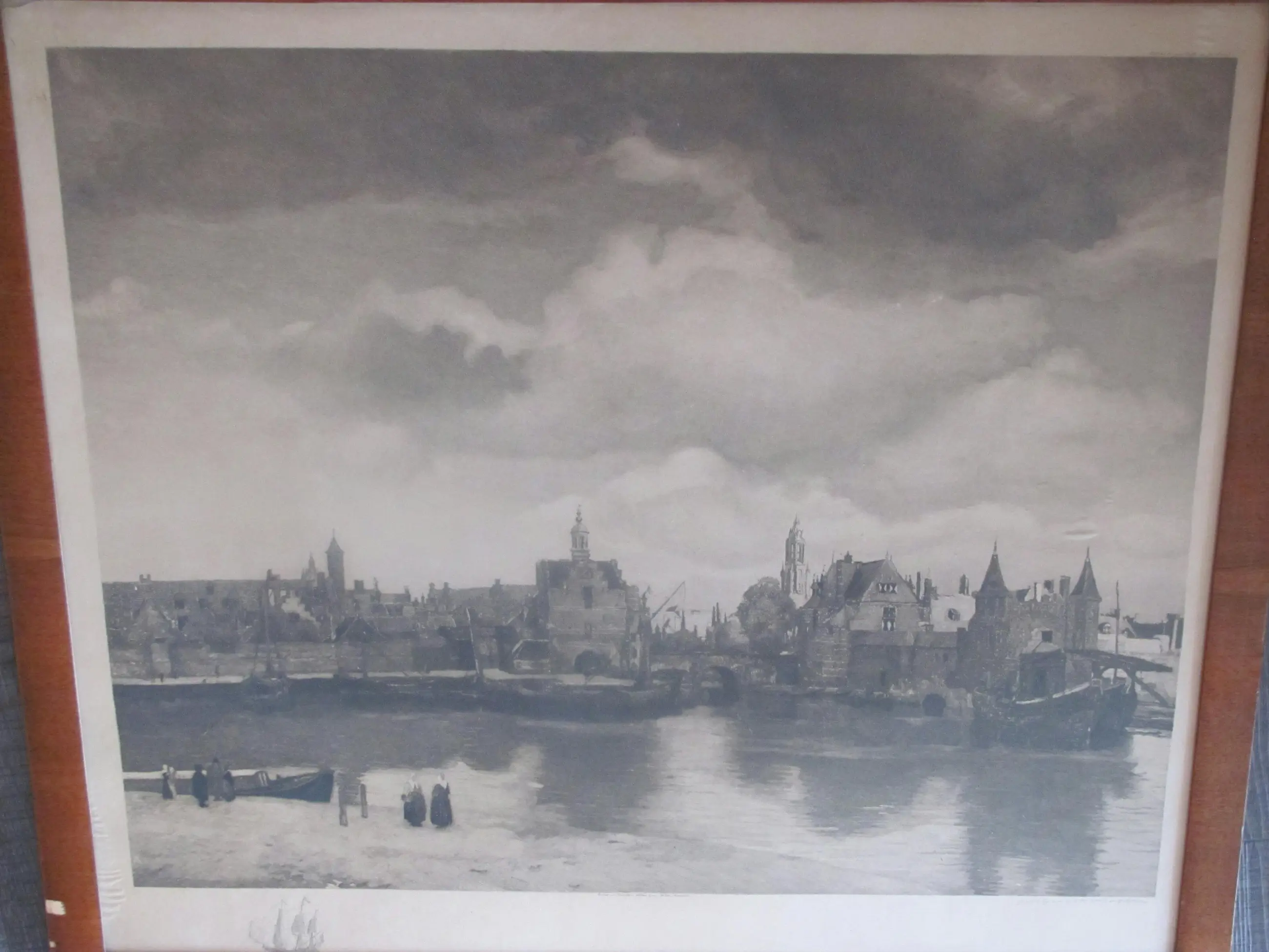 | Gezien de ouderdom van zo'n 125 jaar en de grootte van de afbeelding is deze litho in goede staat. Geen vlekken, wel een luchtbobbeltje (zie de achtste foto). Tussen de glasplaat en de ets lijken wat kleine stukjes papier te zitten, zie de zesde en zevende foto). Ook langs de randen zijn op enkele plekken wat luchtbobbeltjes onder de litho zichtbaar. De lijst vertoont de nodige ouderdomsplekken. (Zie de foto's). | |||