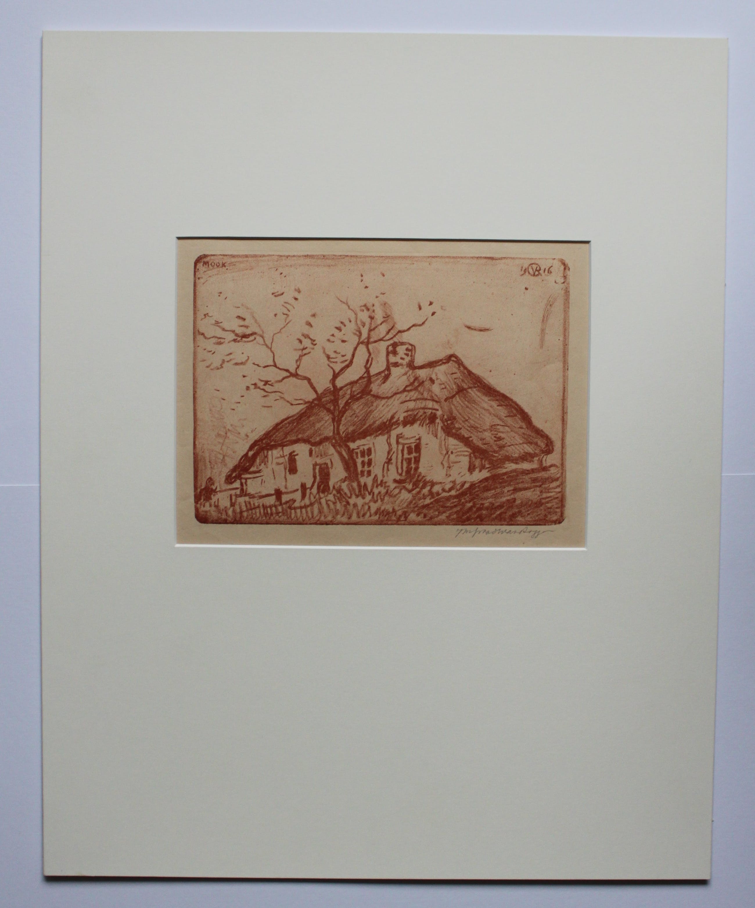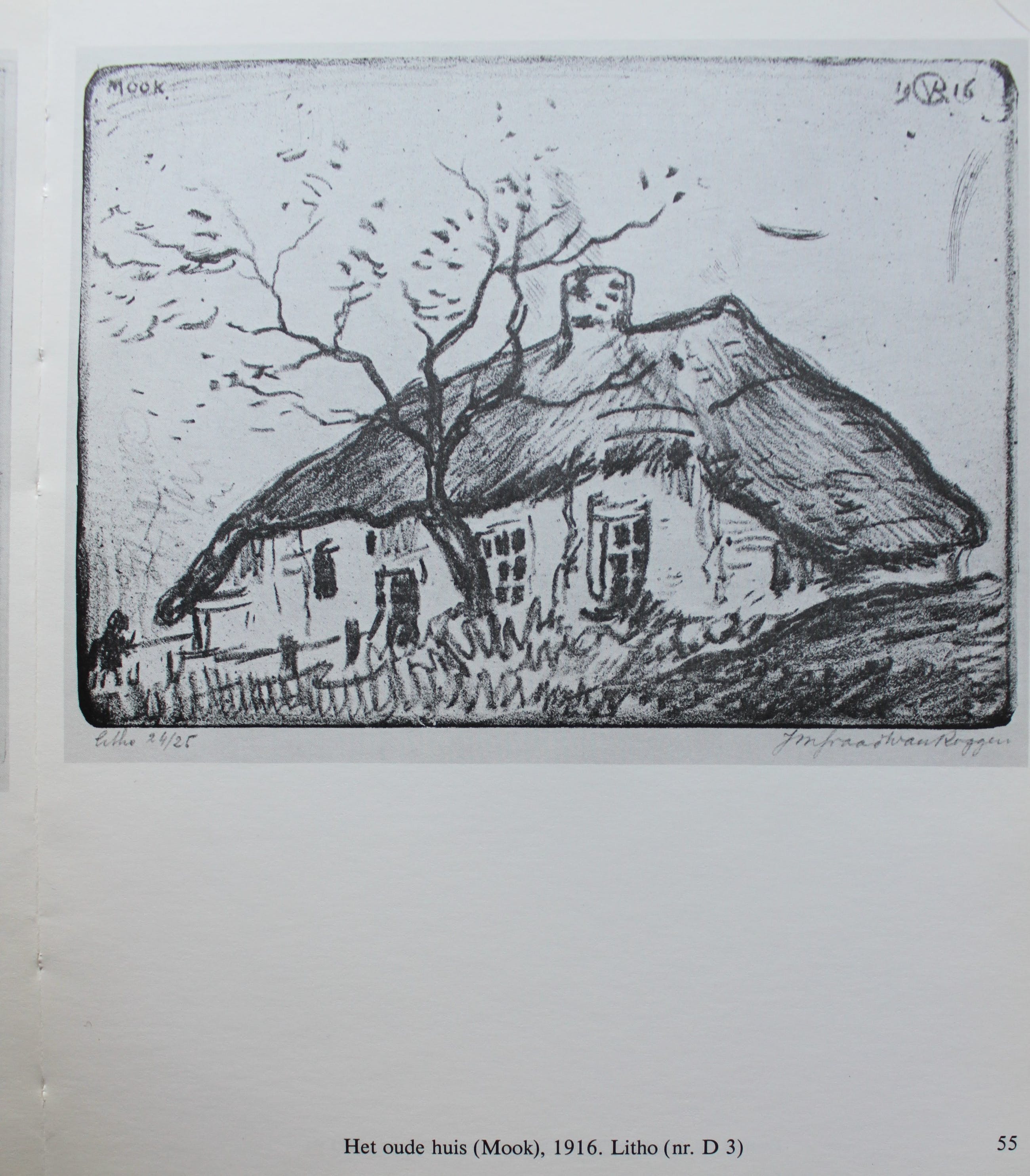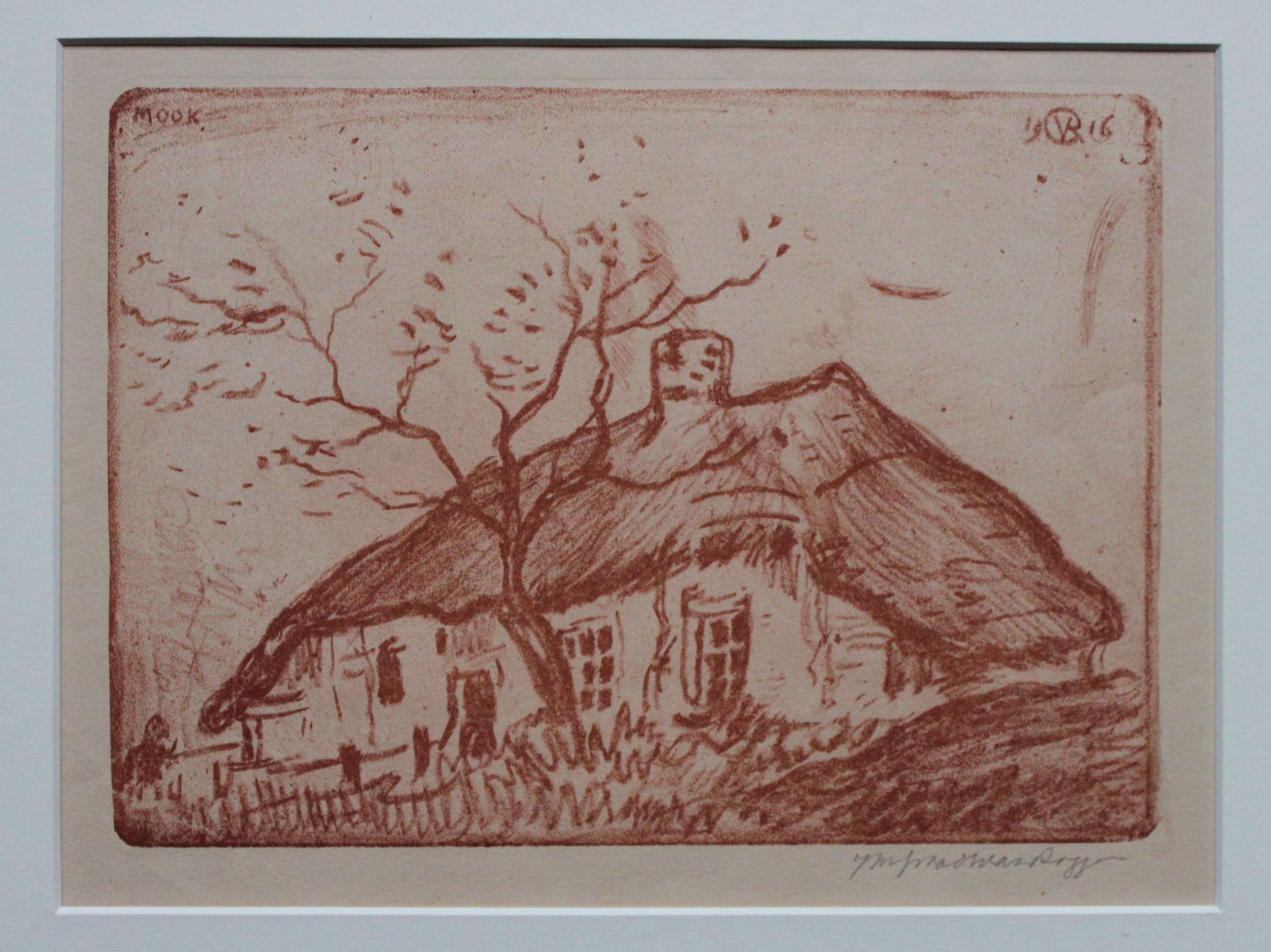 Litho van het oude huis in Mook. Dit is de zeer zeldzame rode uitgave. De litho is ook in het zwart en bruin door Graadt van Roggen gedrukt.