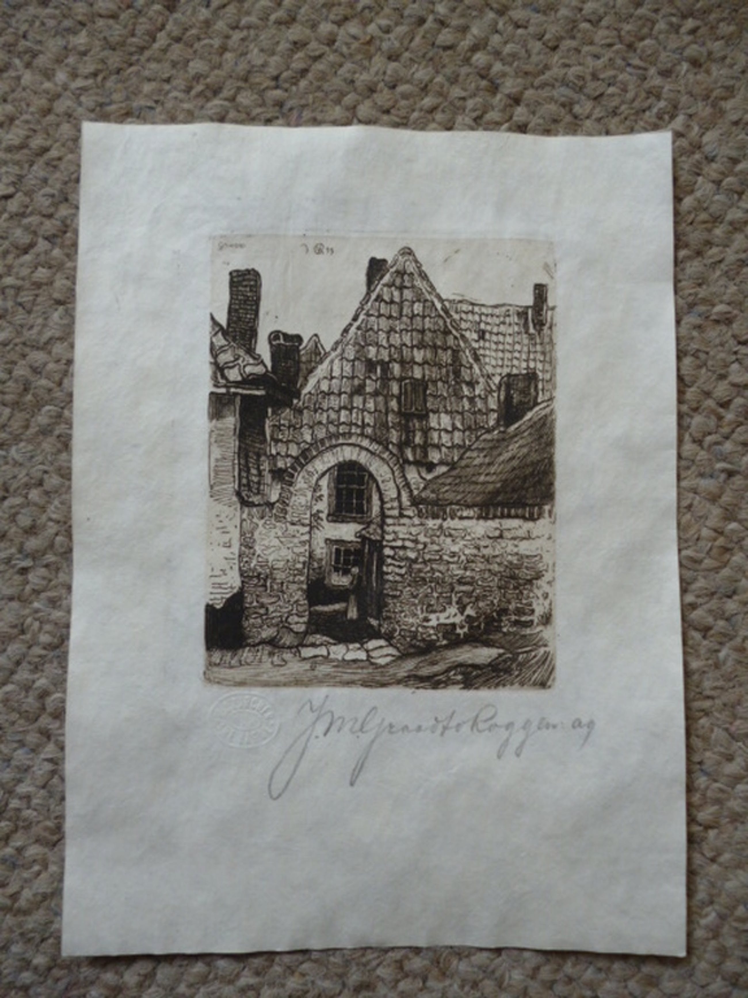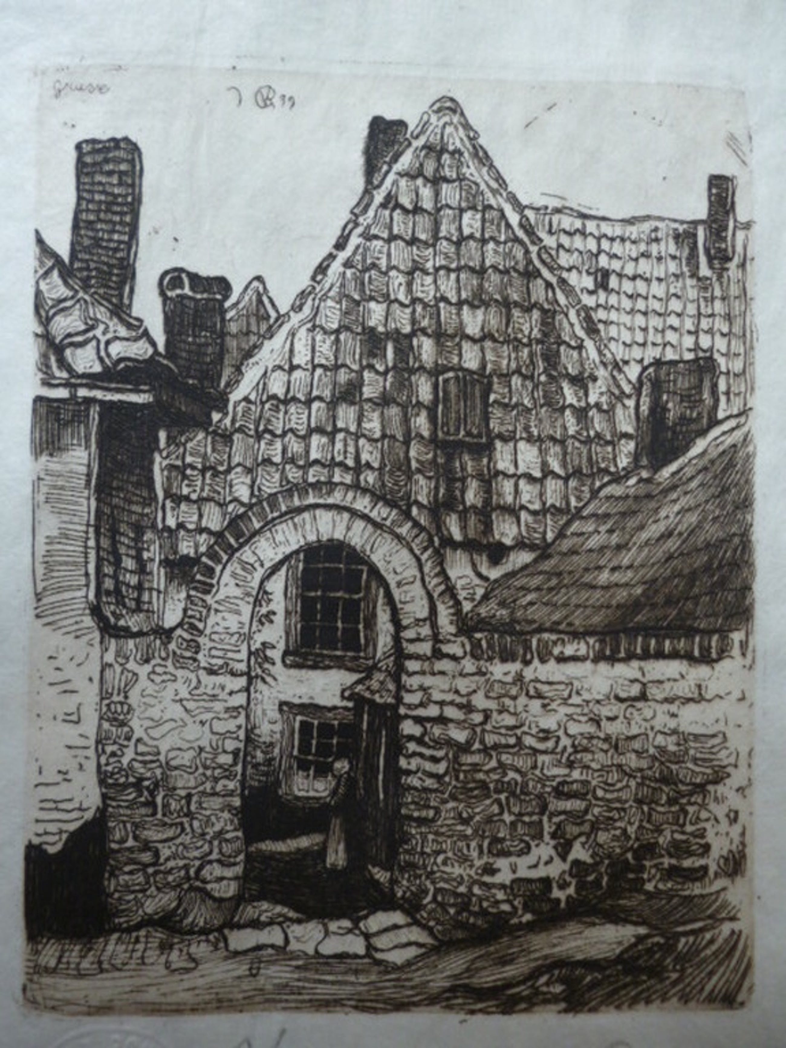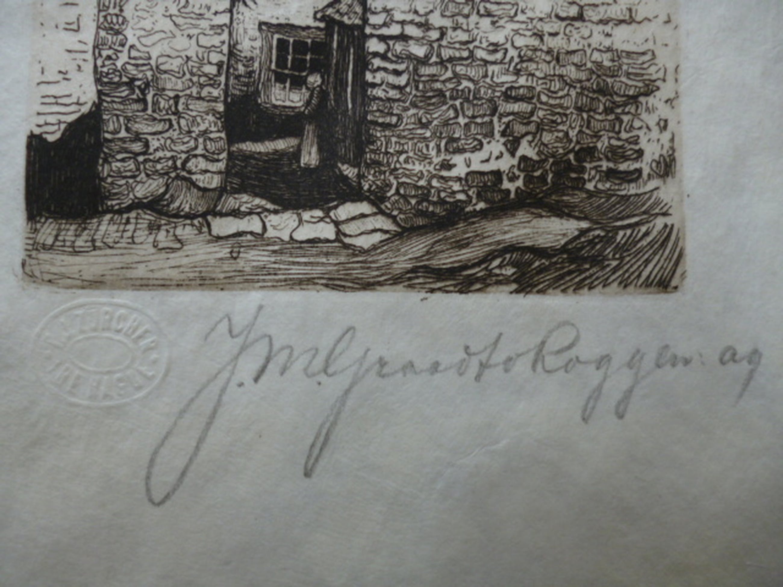 Ets, potlood gesigneerd rechtsonder. In de plaat getiteld, gemonogrammeerd en gedateerd '99 linksboven.