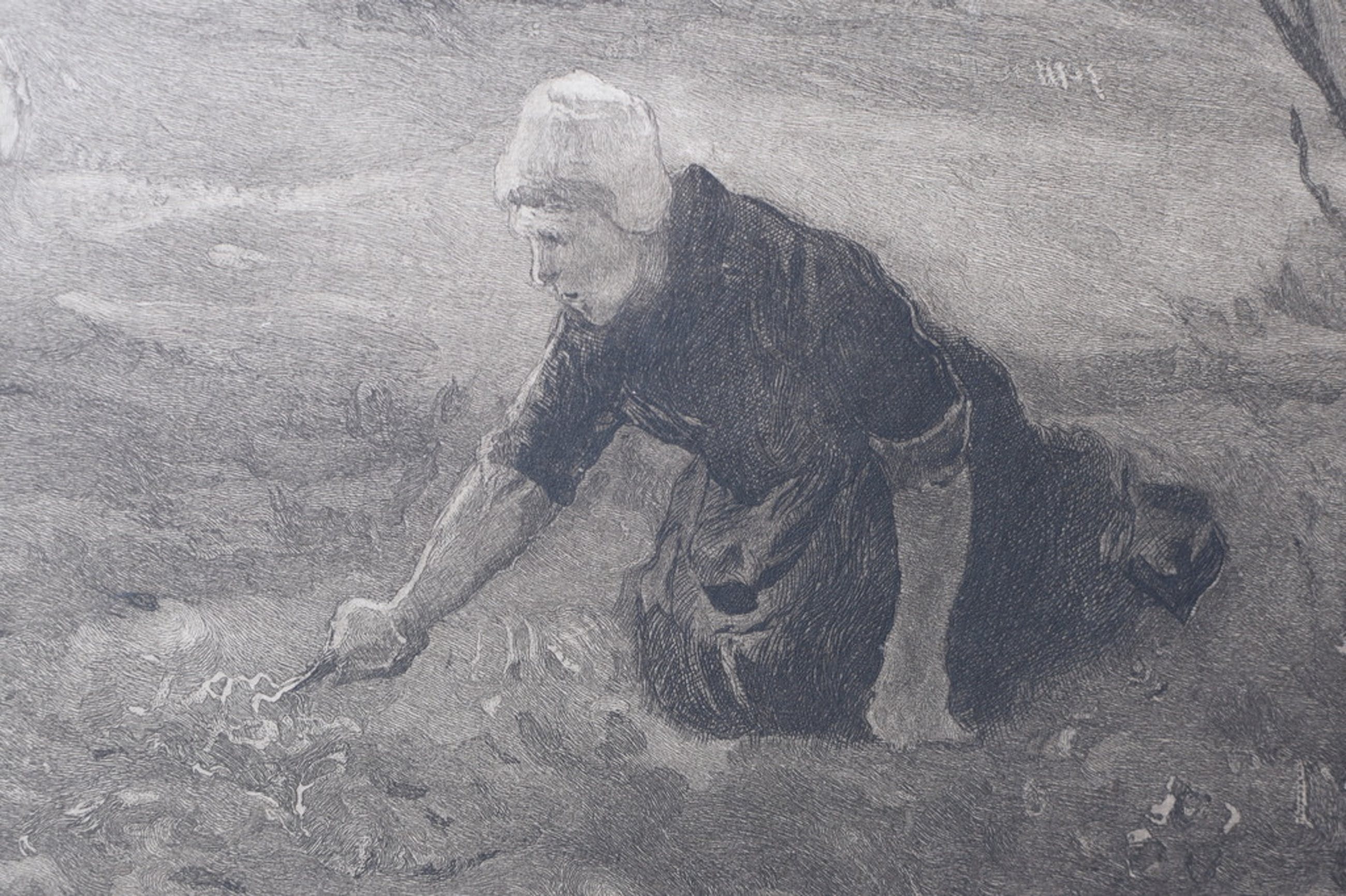 Mooie ets in zeer goede staat van een werkende boerin op het platteland met op de achtergrond een geit en de boerderij.