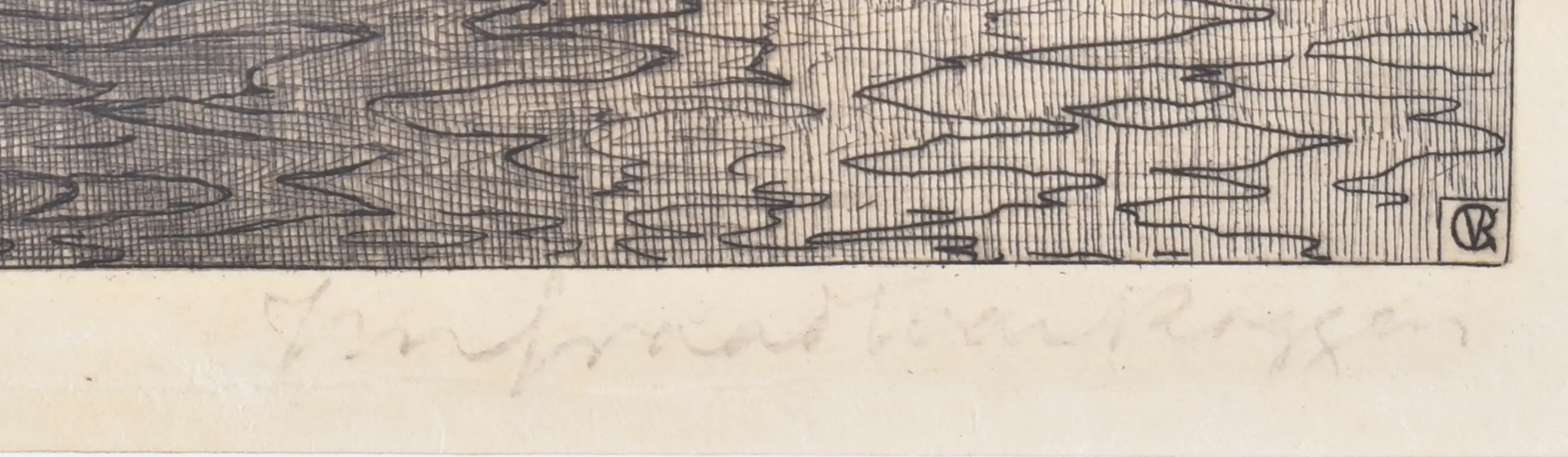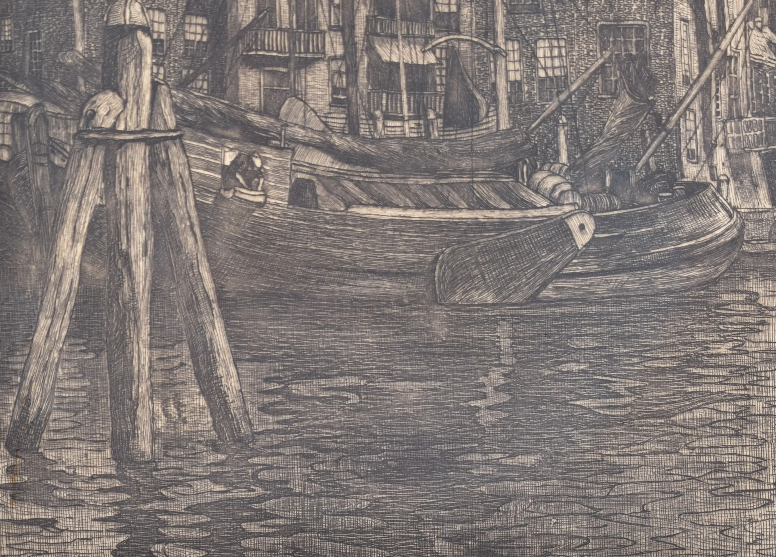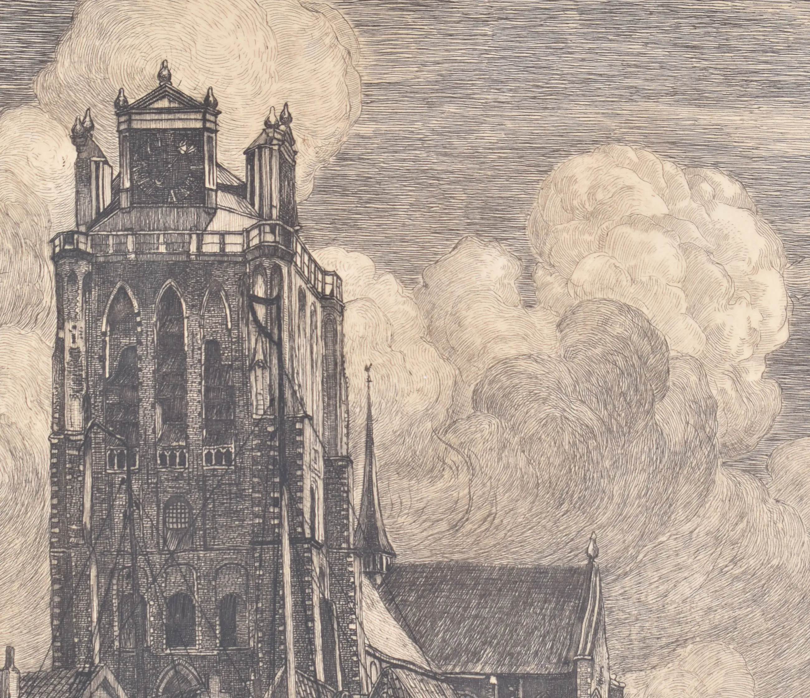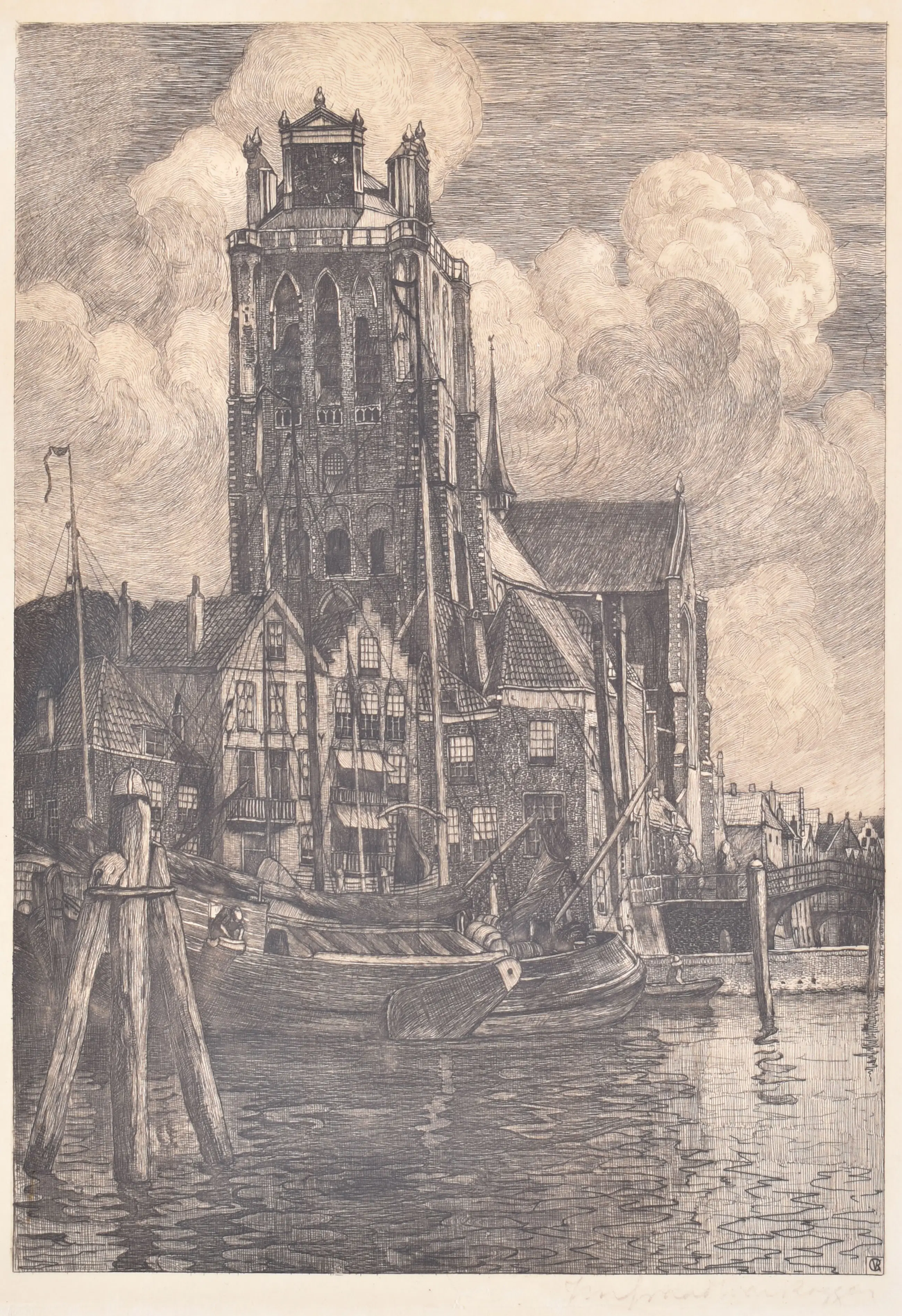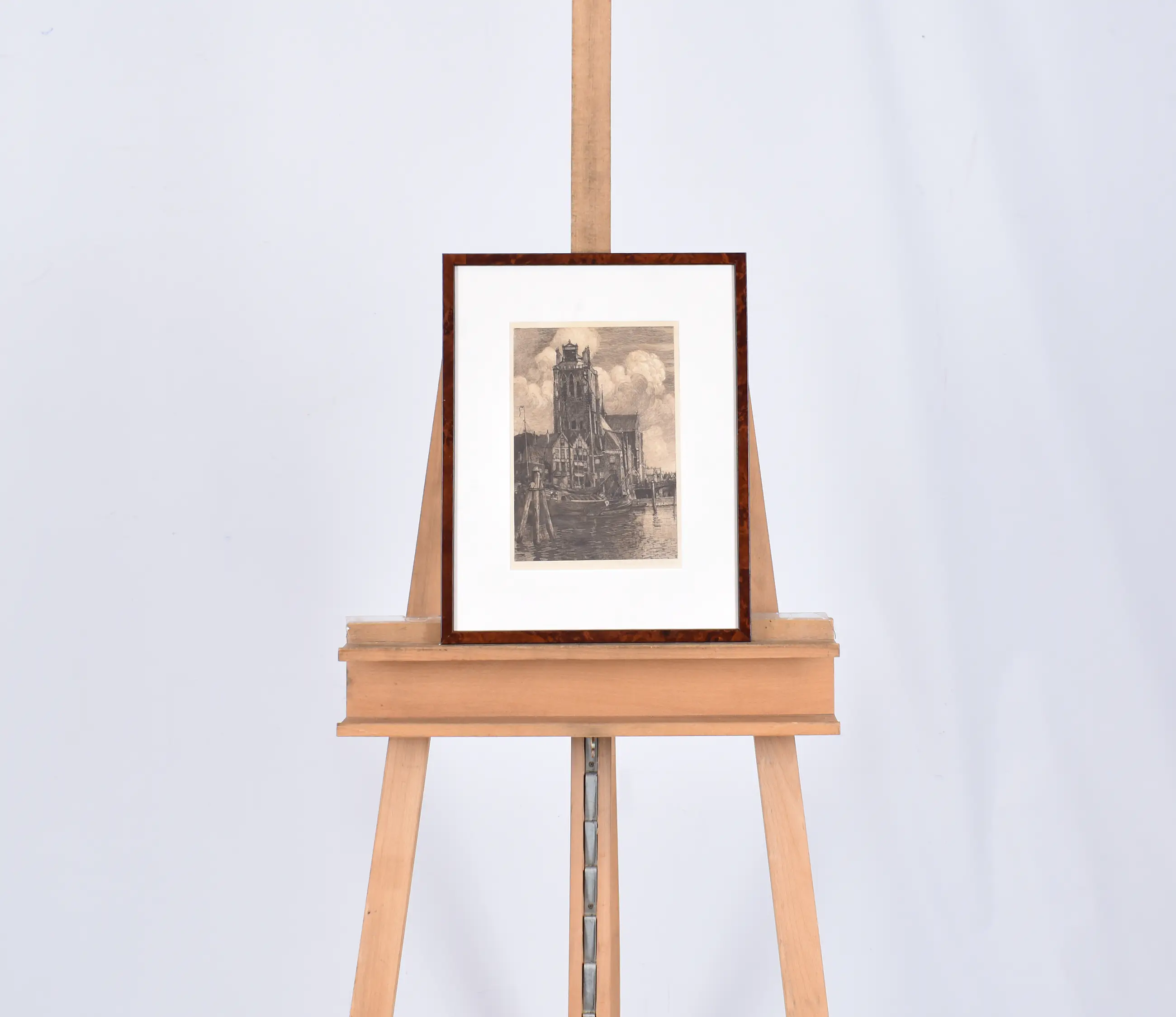 Op deze ets is een haven met een boot zichtbaar, met op de achtergrond een markante kerktoren. Het werk ademt de rust en helderheid van een pleinair geschilderd tafereel.