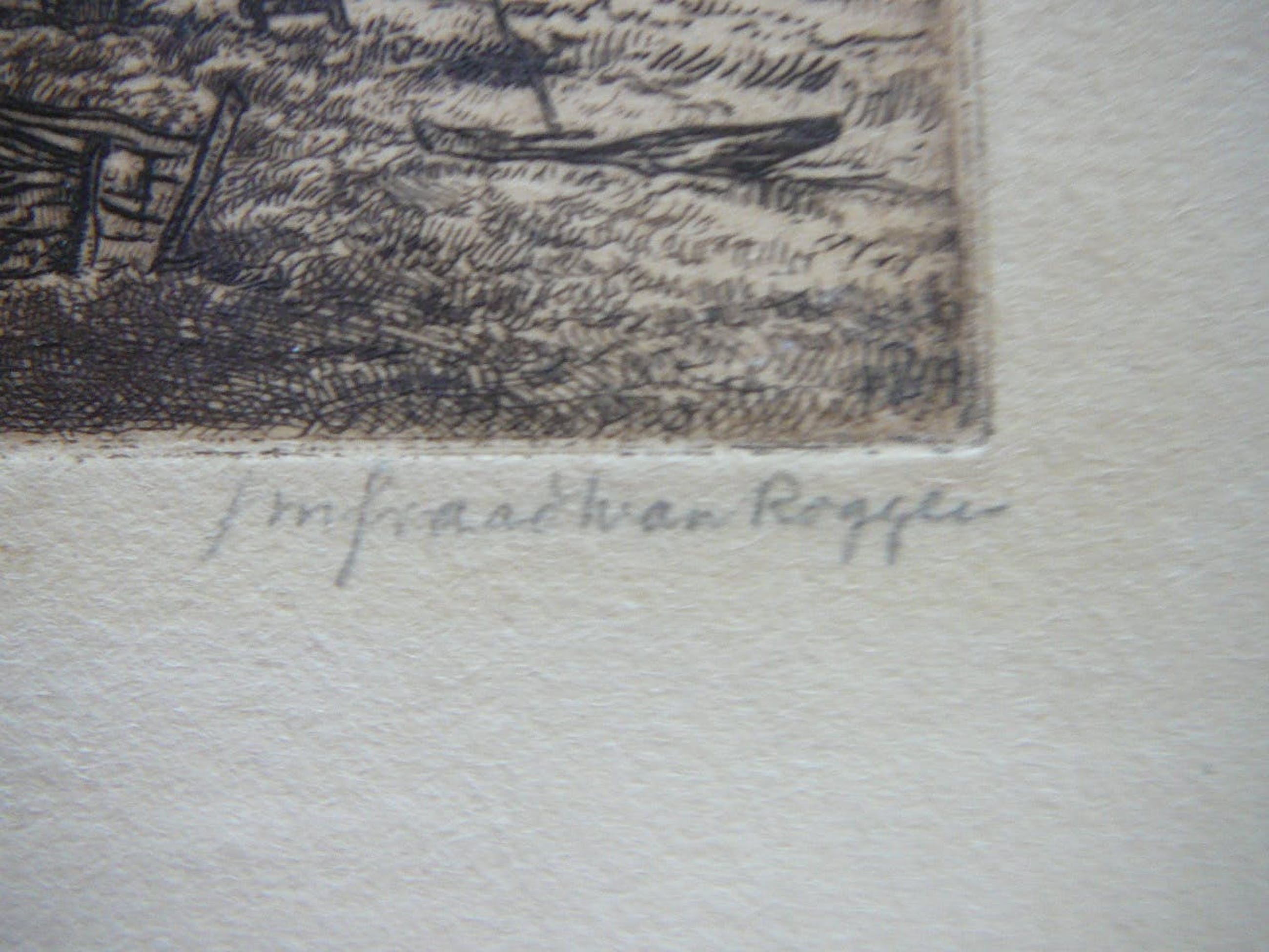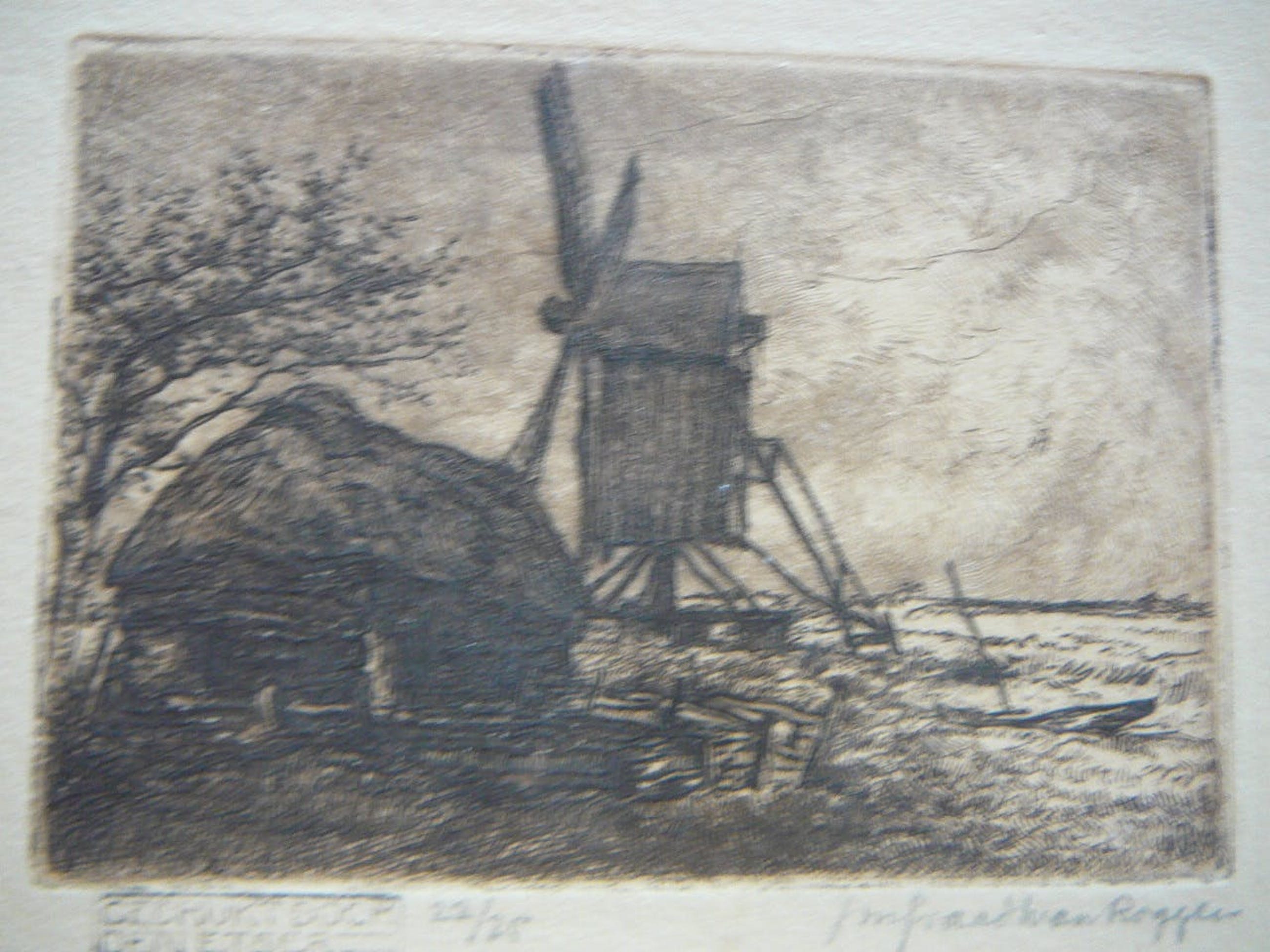 Zeer mooie ets van de standerdmolen te Wanneperveen,een dorp nabij Giethoorn met er langs een oude stal afmeting papier hoog 13 cm breed 17 cm afmeting ets 68 x 97 mmets 22/25Gedrukt door den etser