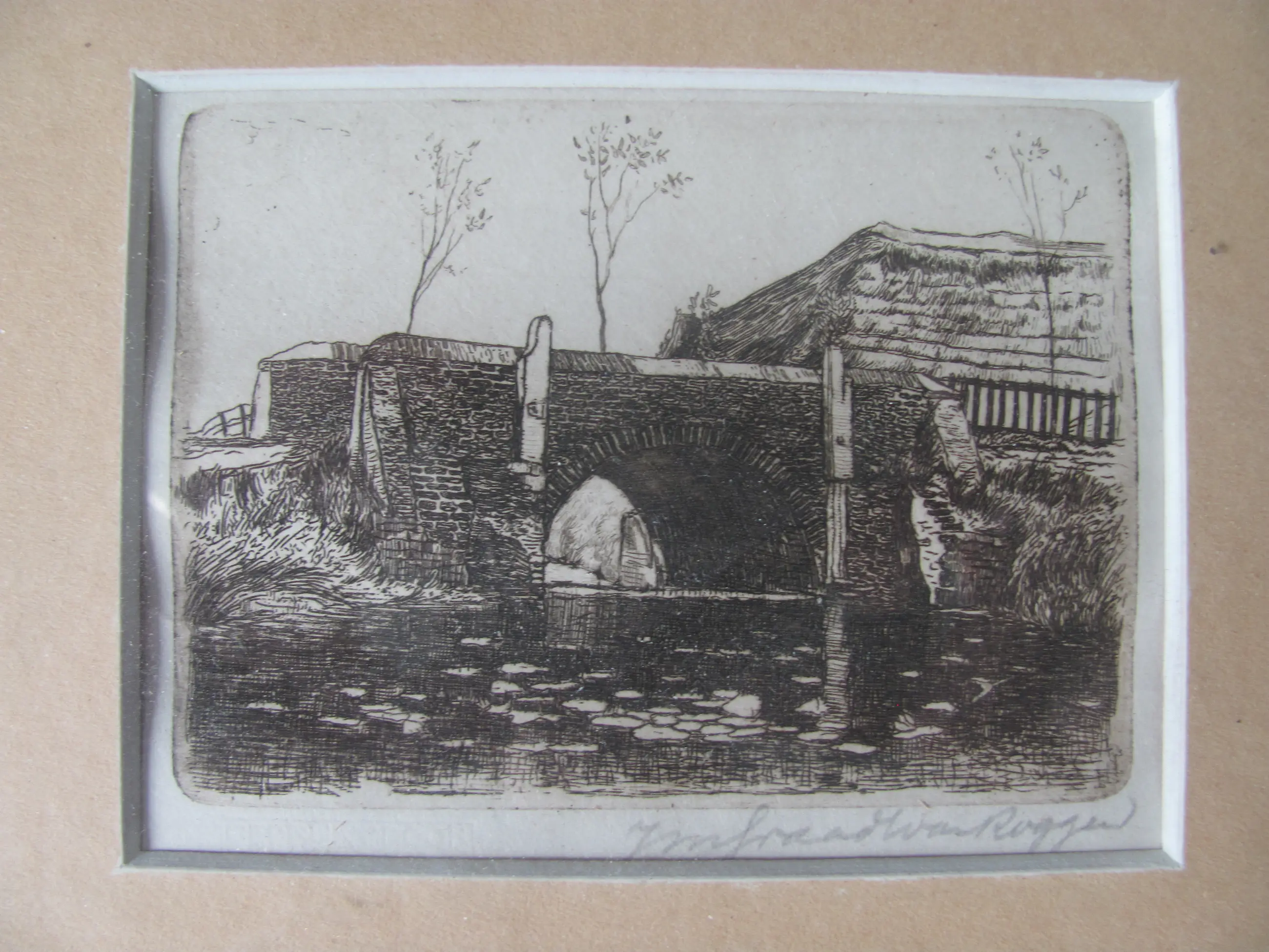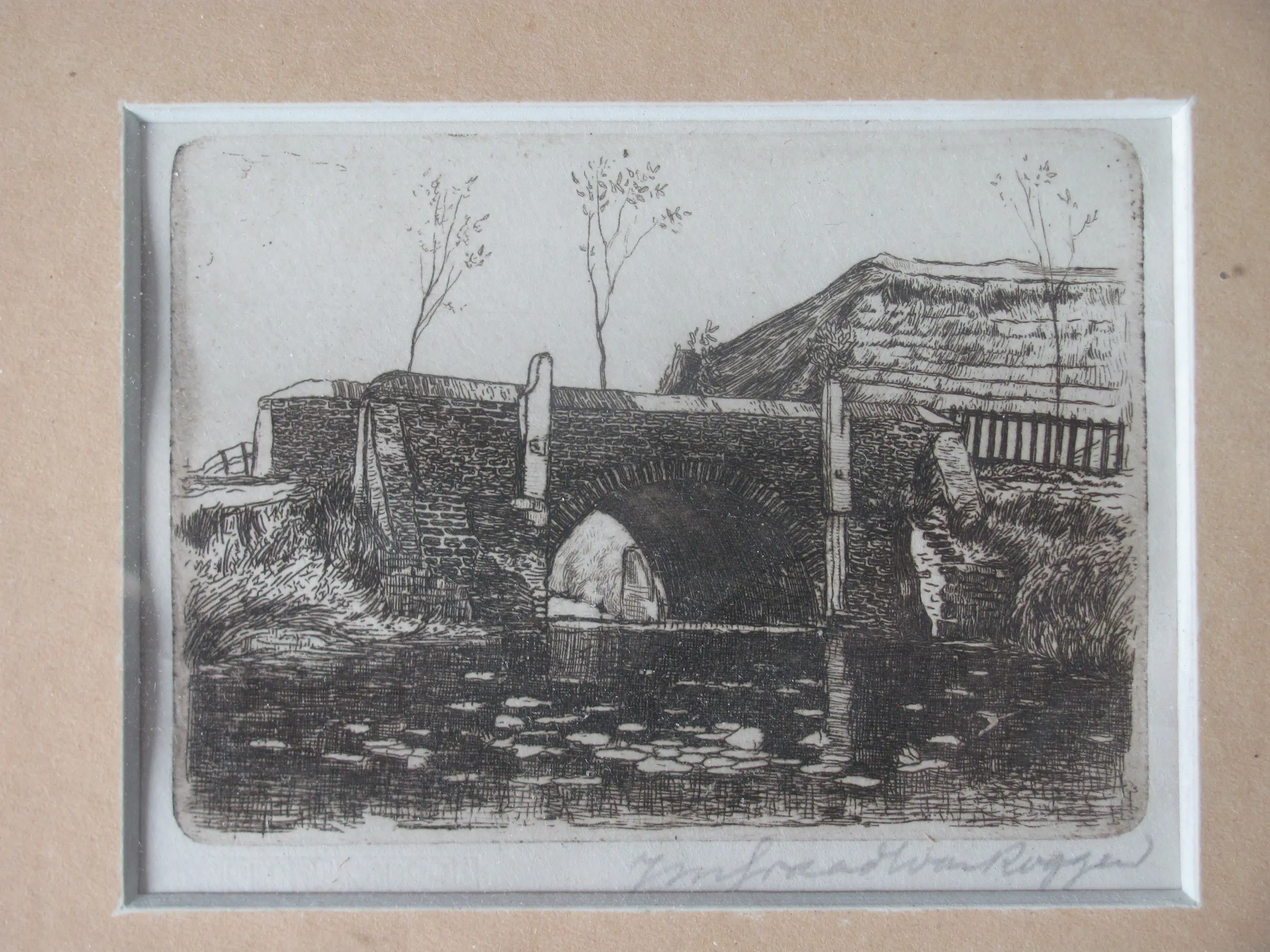 Ets van J.M. Graadt van Roggen. Met potlood ondertekend. Vijver of sloot voor een brug en boerderij? Ondanks de ouderdom in goede staat.