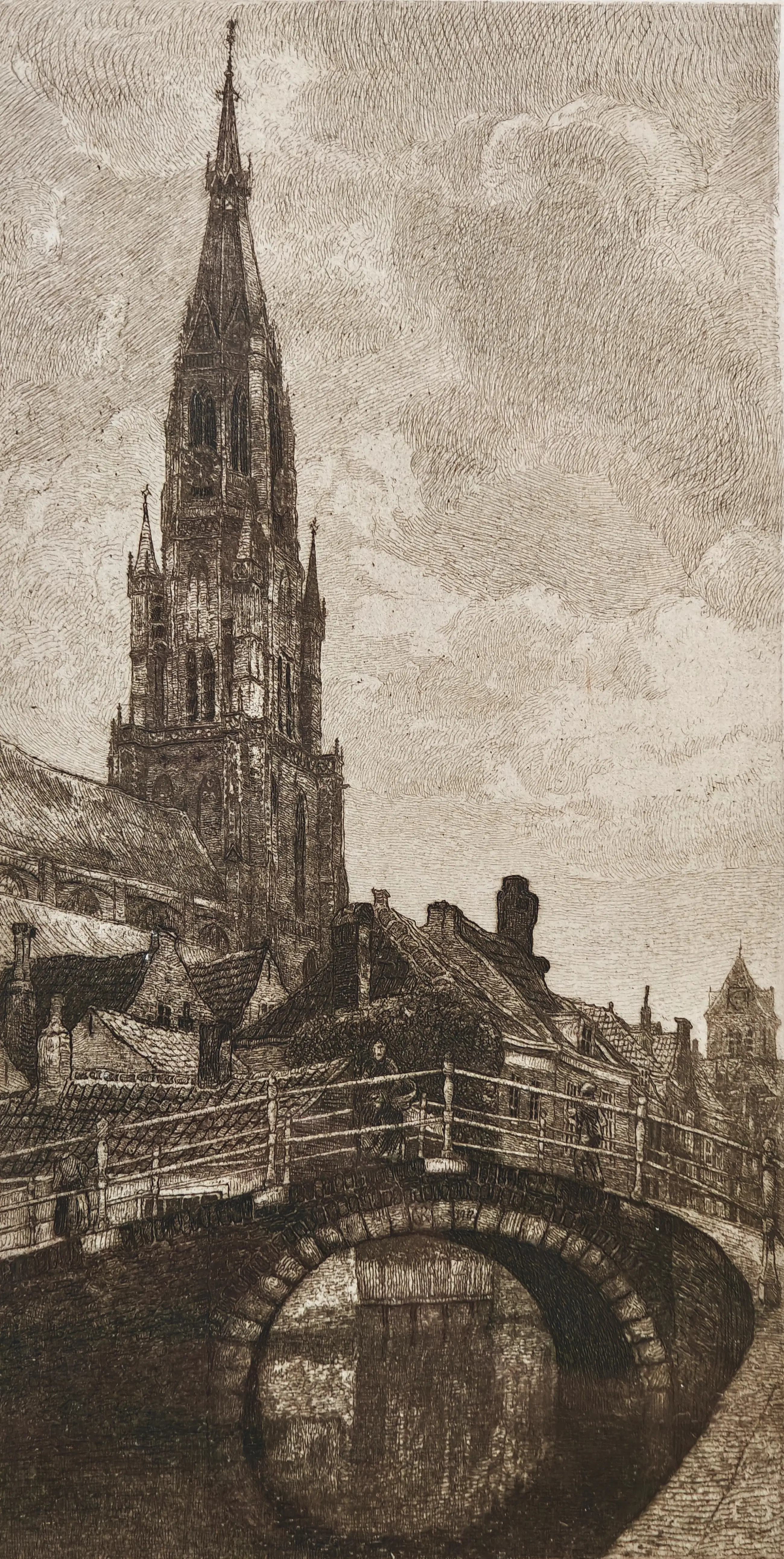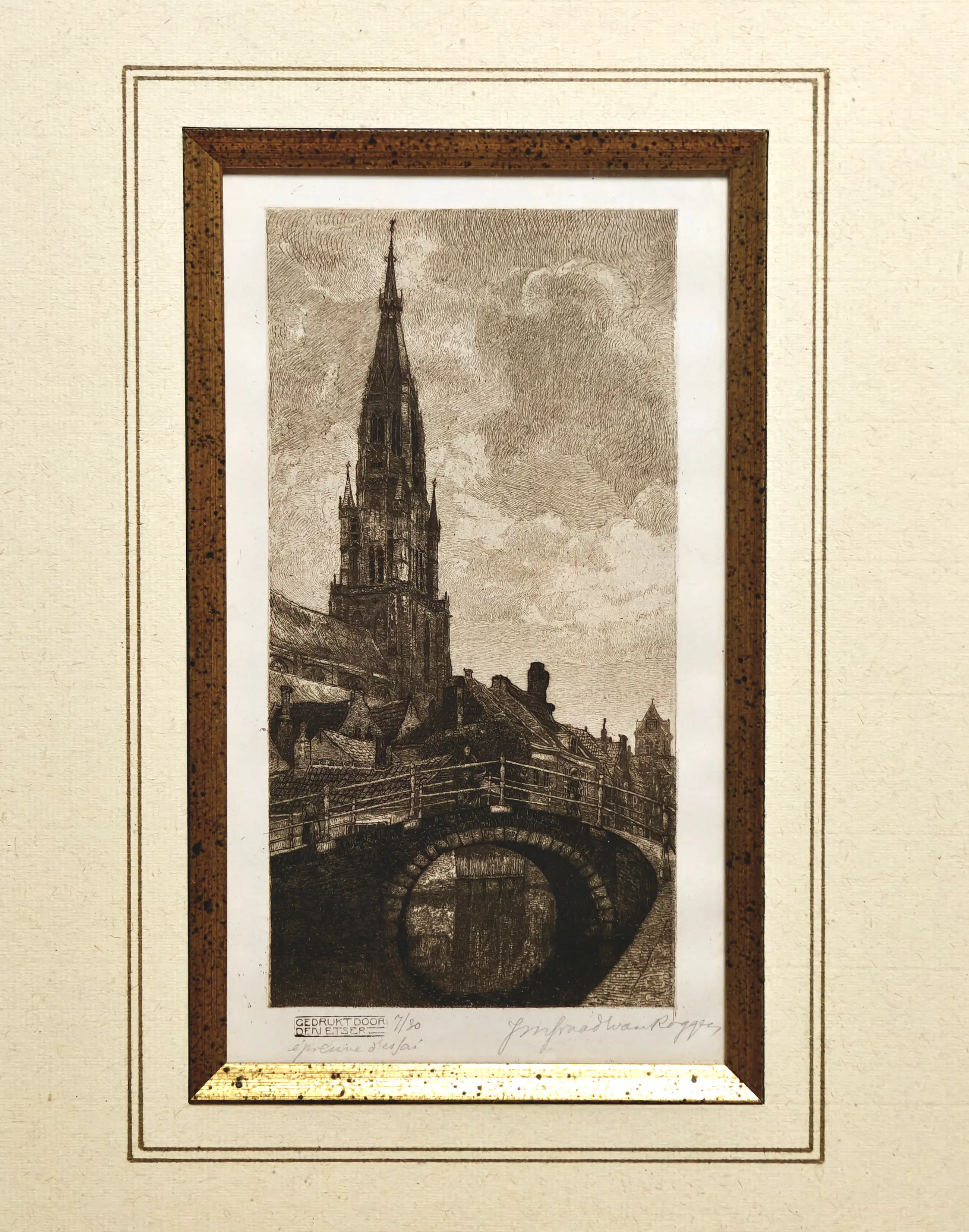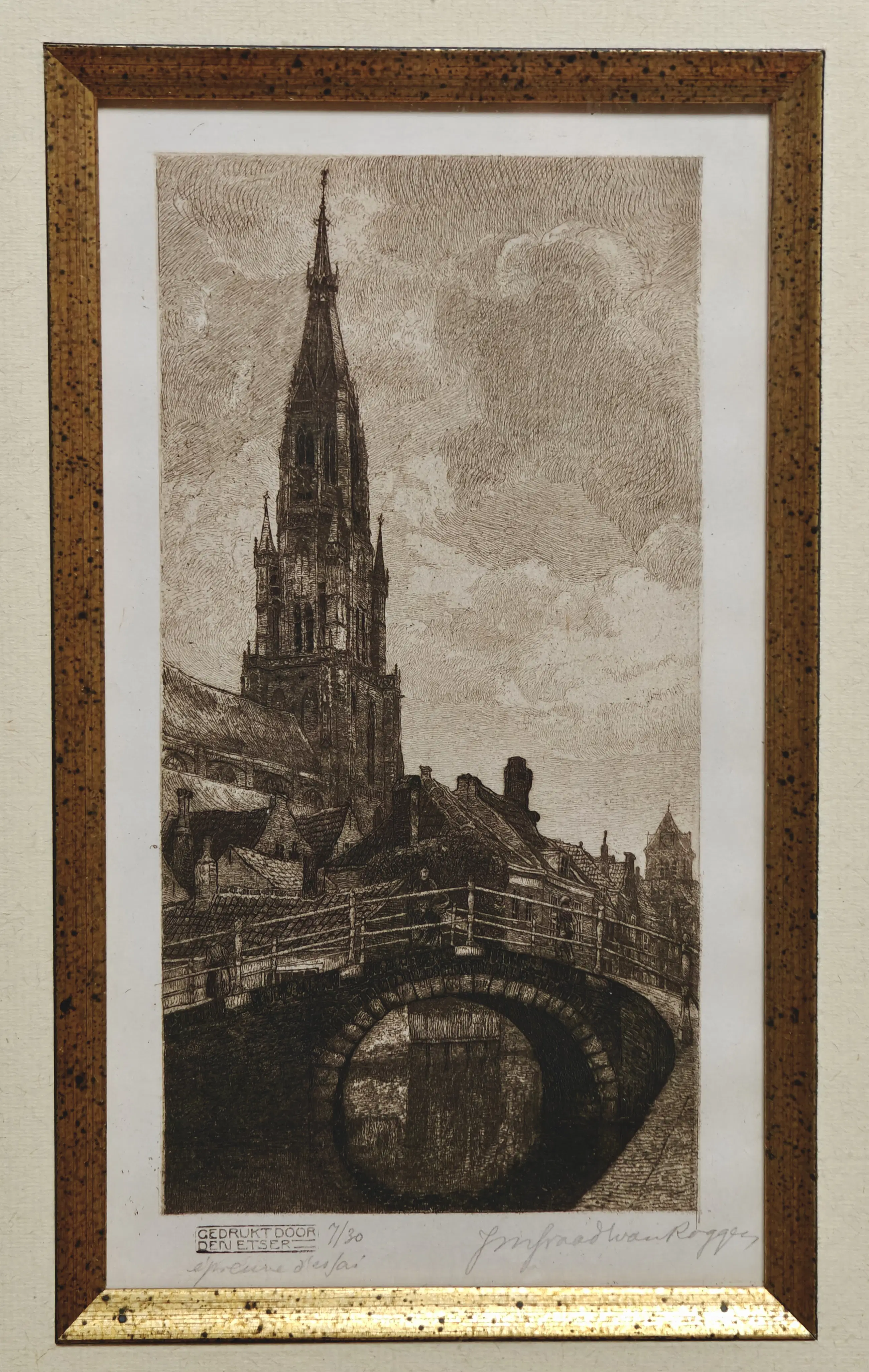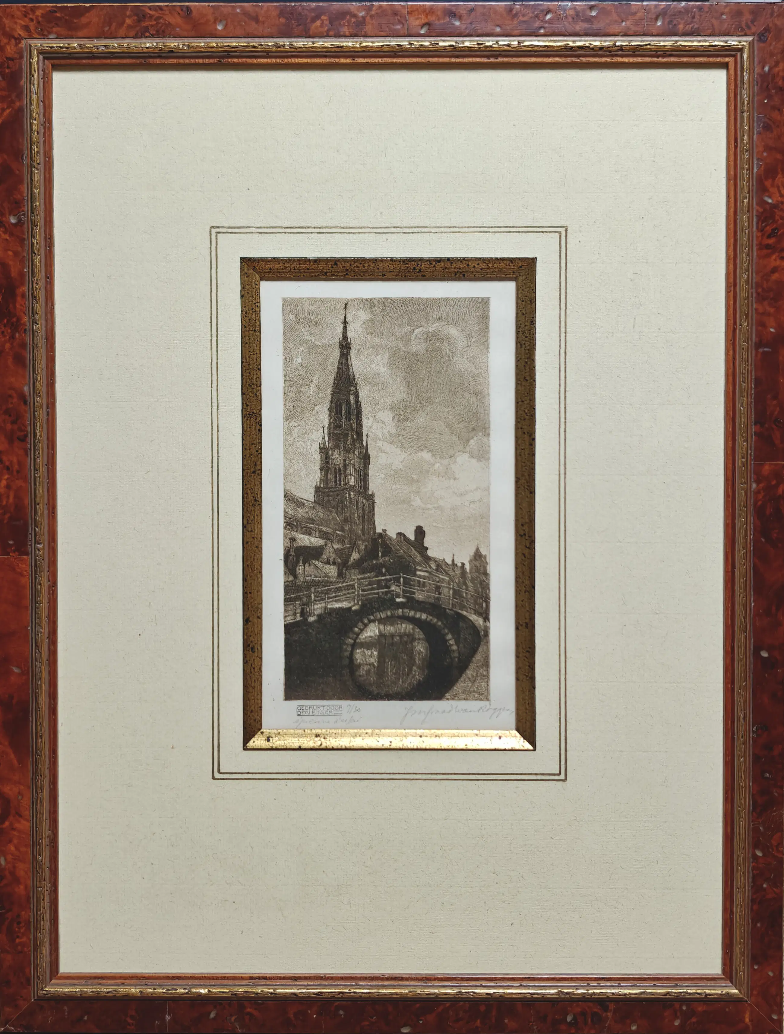 Fraaie ets van J.M. Graadt van Roggen (1867-1959) met een afbeelding van de Onze-Lieve-Vrouwekerk te Brugge. Het betreft nummer 7/30 De ets heeft afmetingen van 10,5x20,5cm en is omgeven door een prachtige lijst, wat de totale afmetingen op 40x52cm brengt.