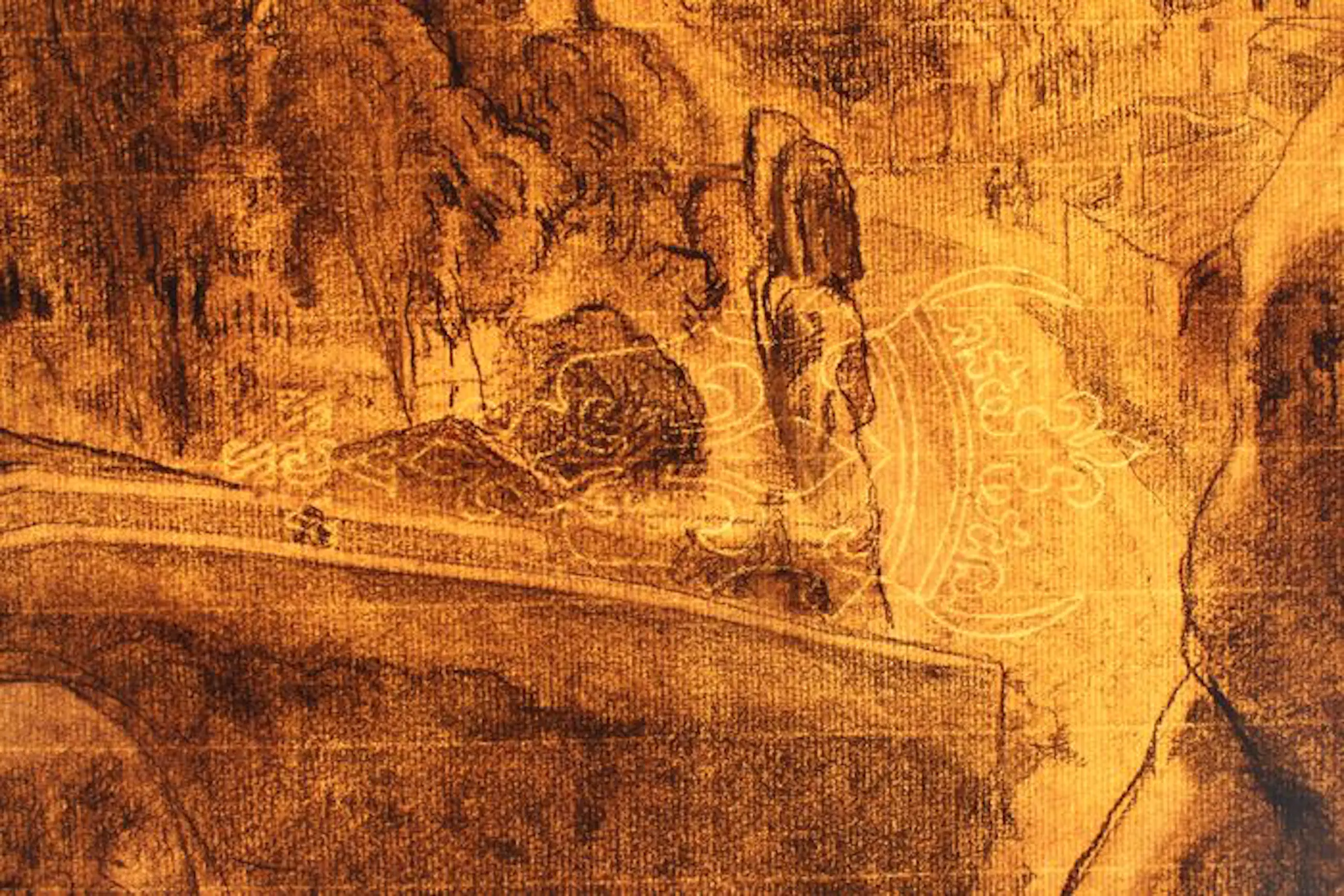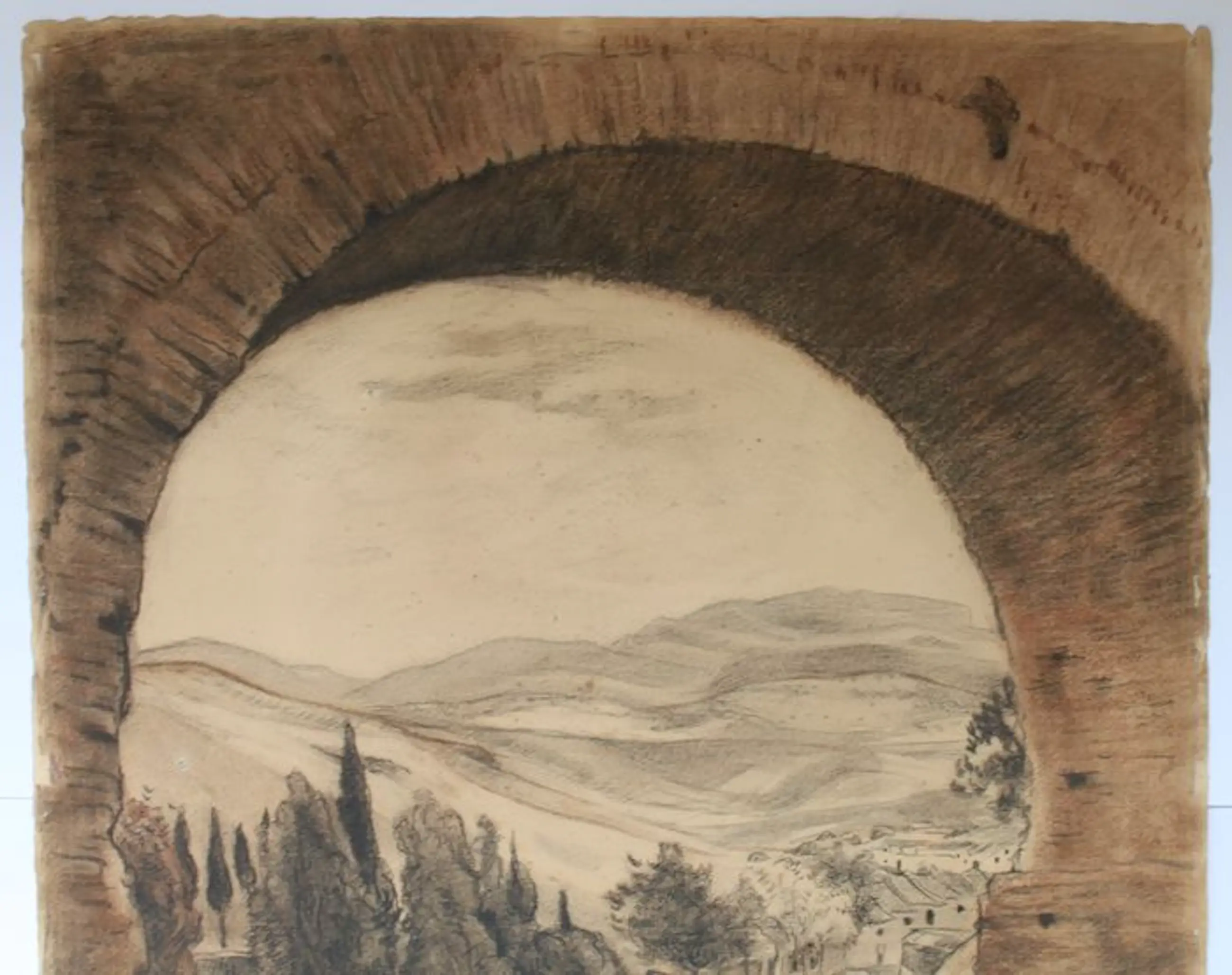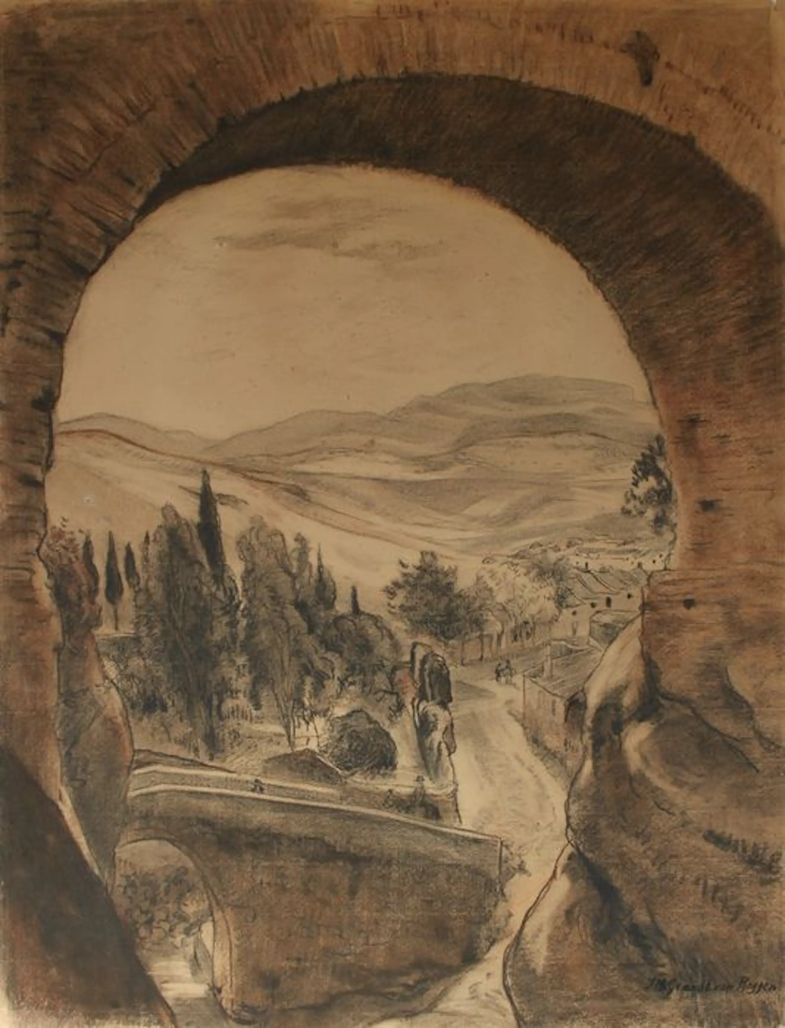 Fraaie krijttekening ca. 1920 voorstellende de Puentes Romano y Arabe bij Ronda. Puente Romano (betekenis: Romeinse brug) of Puente Arabe is een oude stenen brug die als een van de drie bruggen de diepe kloof Tajo de Ronda met daarin de rivier de Guadalevín overspant in de autonome regio Andalusië in Zuid-Spanje.