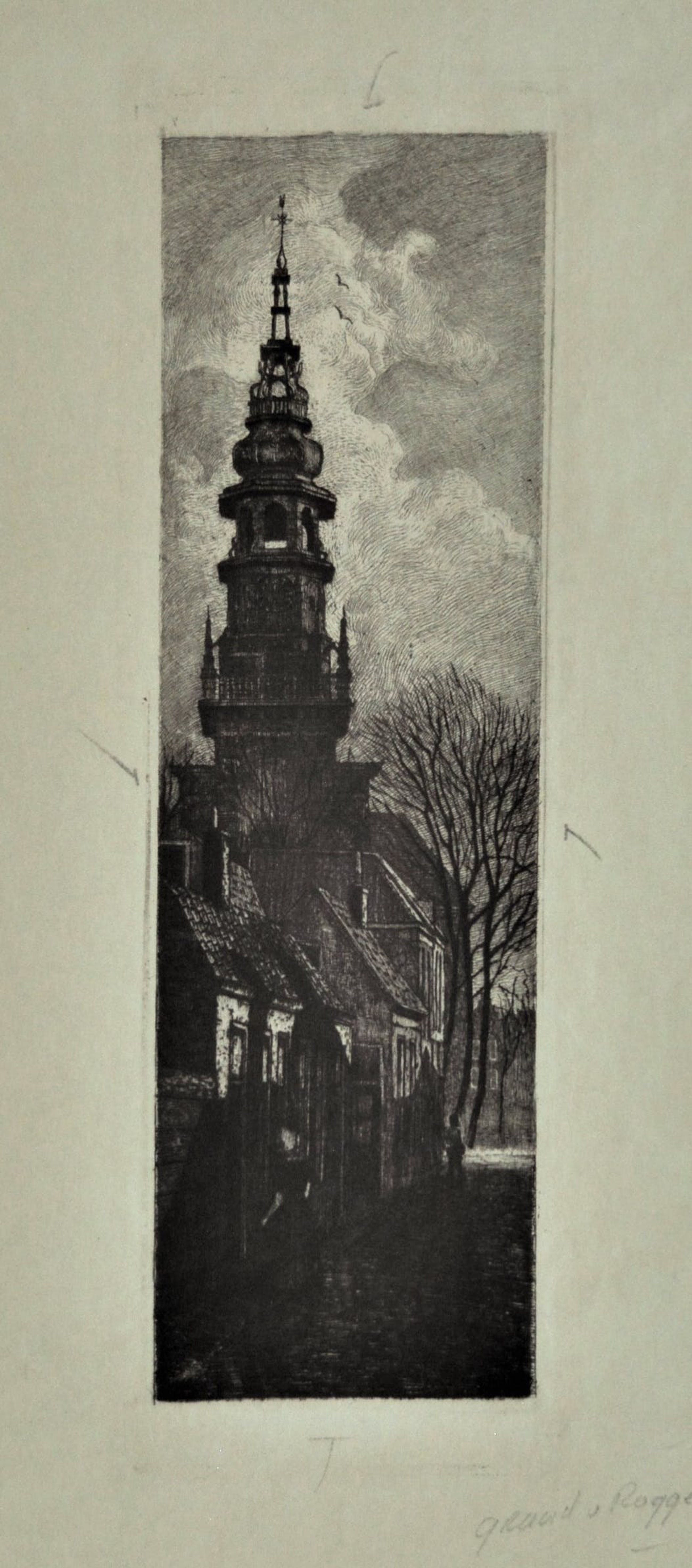 De grote van de afbeelding is: 21,2 x 6,4 cm. Op de voorkant van de ets staat graad van Rogge in potlood geschreven. Aan de achterkant van de prent staat "Nieuwe kerk cat. Nijmegen 52".In het boekje " Het grafichse werk van J.M.Graadt van Roggen " staat deze ets vermeld onder nr. 52. Toren van de Nieuwe Kerk ( album Haarlem nr. 6) uit het jaar1897.