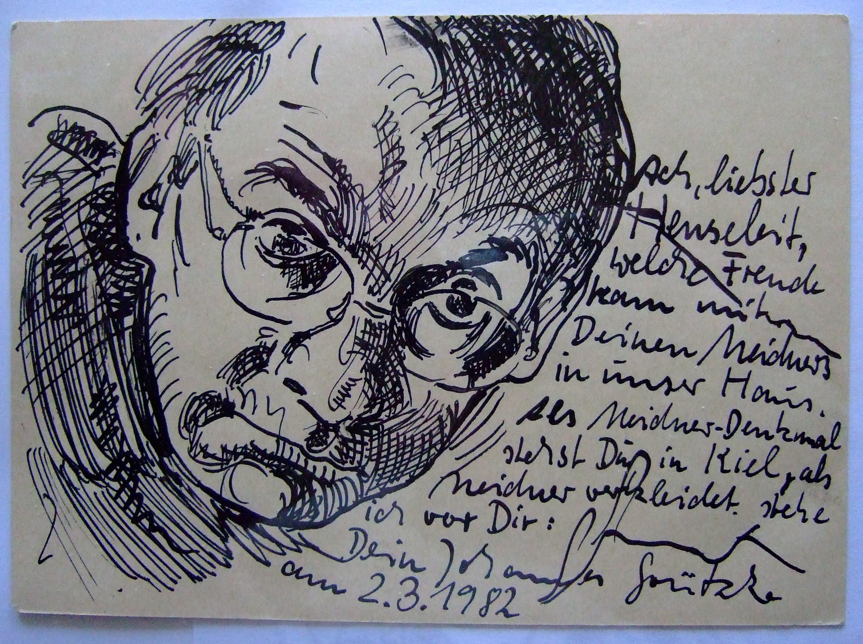 Original Federzeichnug mit Selbstbildnis und Text auf gelaufener Postkarte (1982).
