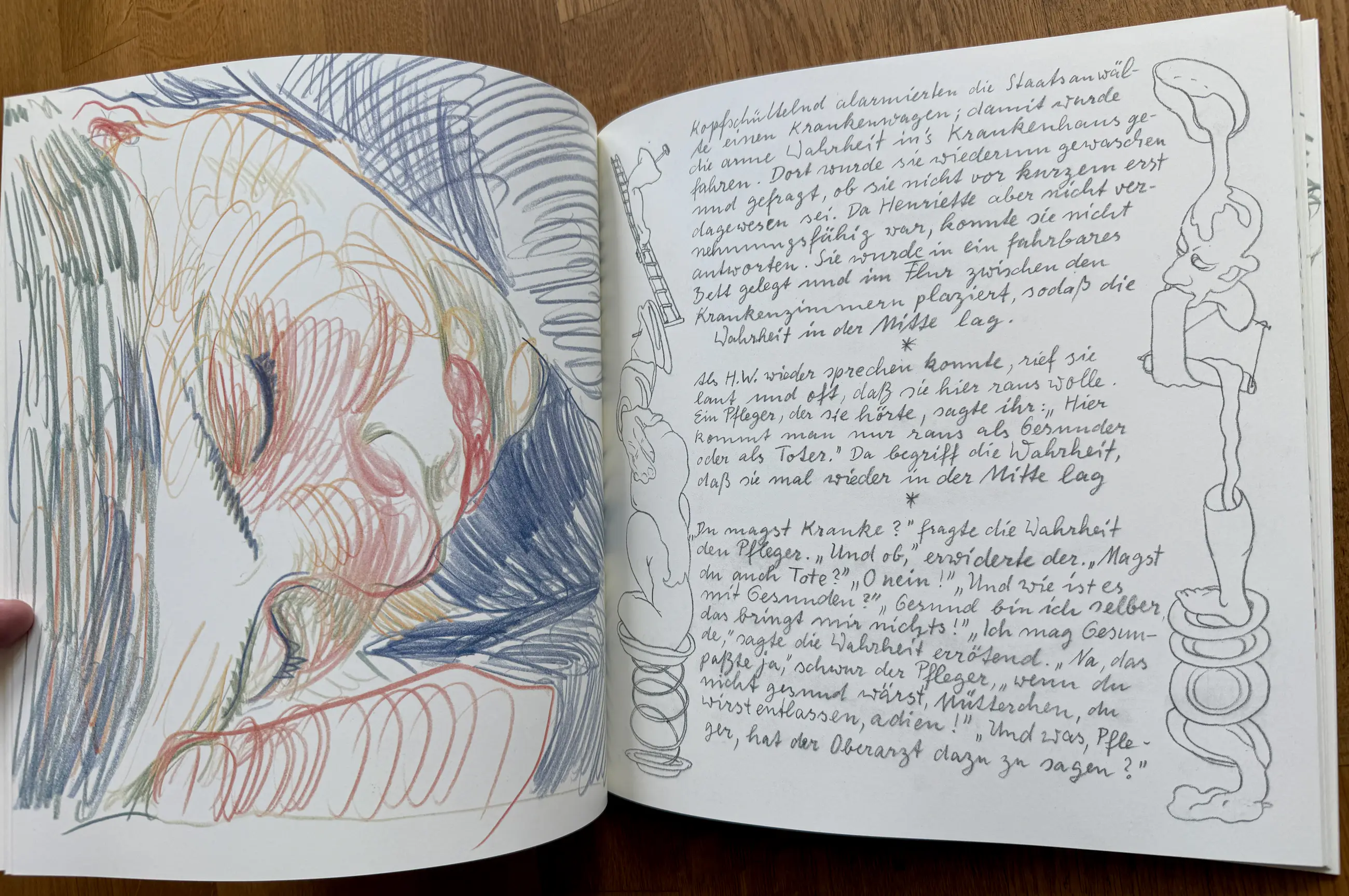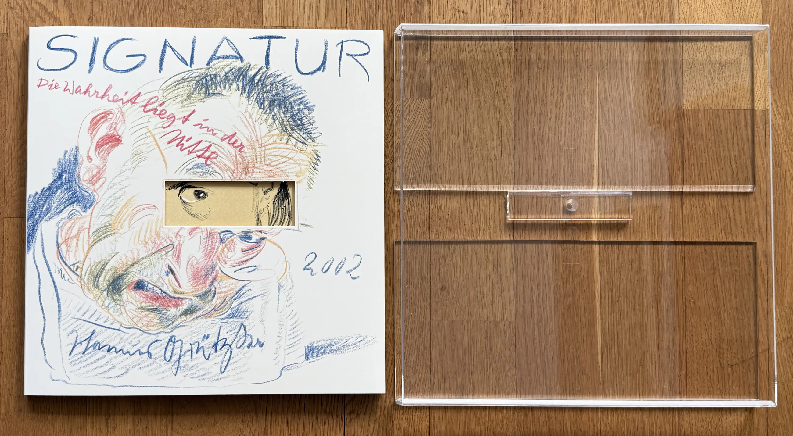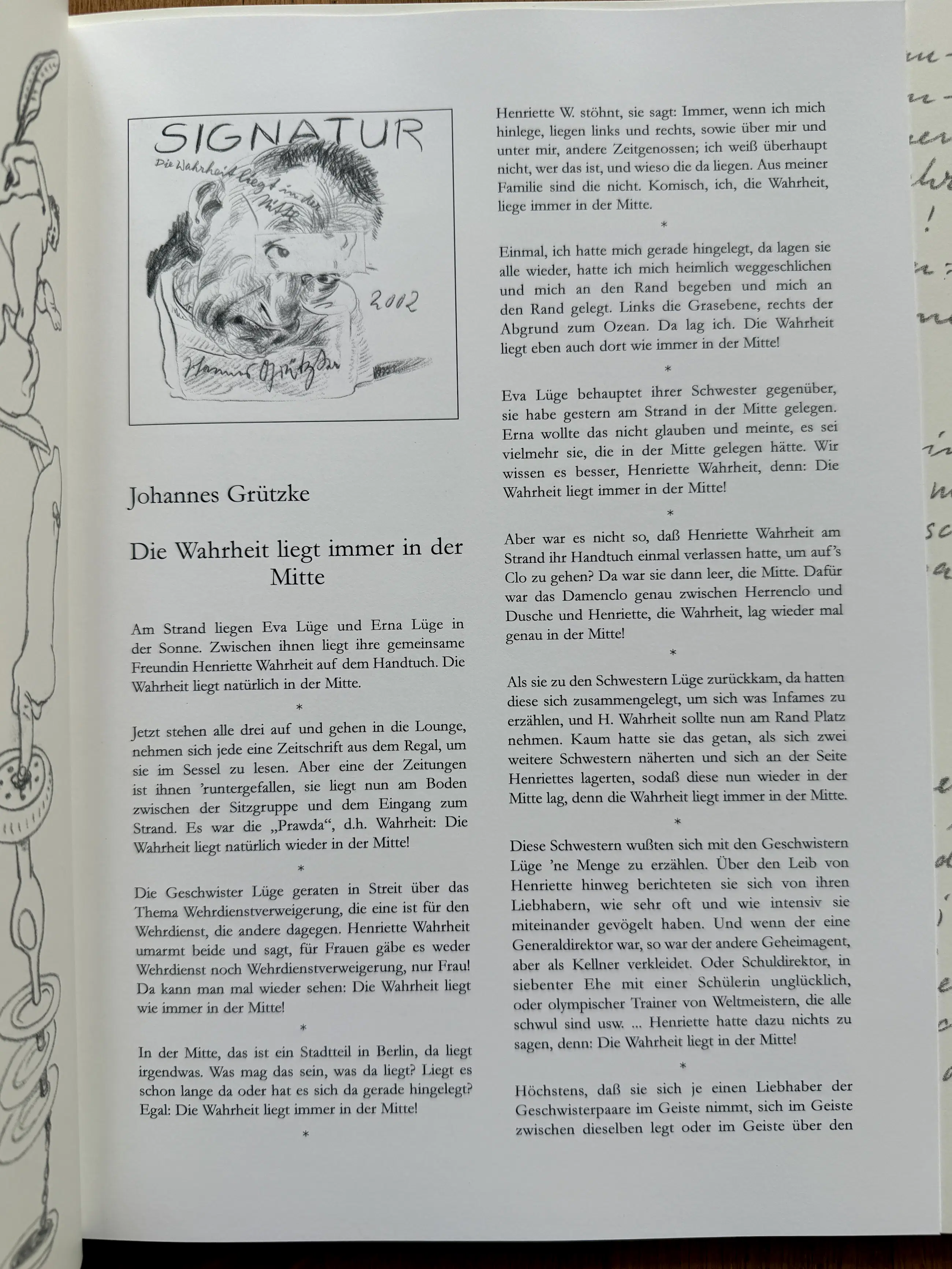 Het kunstenaarsboek "The Truth Lies in the Middle" van Johannes Grützke werd in 2002 gepubliceerd als onderdeel van de bibliofiele tijdschriftenreeks "SIGNATUR. Zeit. Schrift. Bild. Klang Objekt" (nr. 37) van Rommerskirchen Verlag. Deze editie is gelimiteerd en bevat een originele afbeelding en de handtekening van Johannes Grützke. Het boek is een van de 990 genummerde exemplaren en wordt beschouwd als een zeldzaam verzamelobject. In originele verpakking, met CD, inclusief acryl lijst en ophangsysteem. In nieuwstaat.