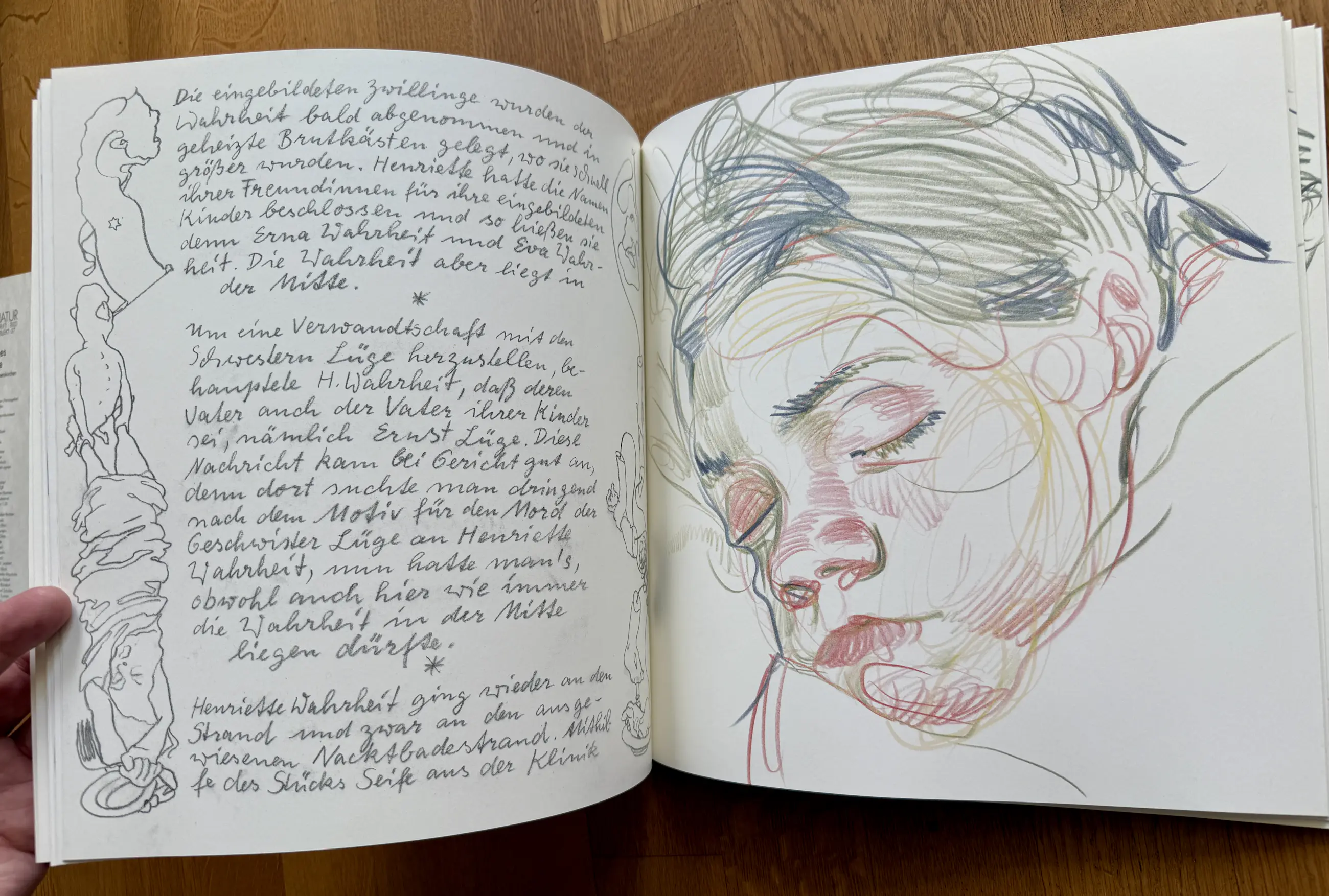 Eva Lüge en Erna Lüge liggen in de zon op het strand. Tussen hen in ligt hun gemeenschappelijke vriendin Henriette Wahrheit op de handdoek. De waarheid ligt natuurlijk ergens in het midden.