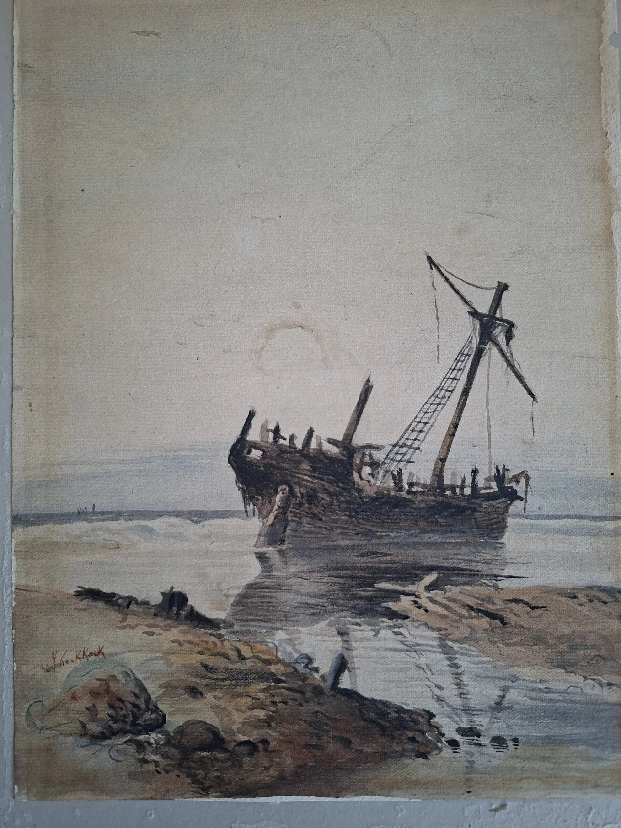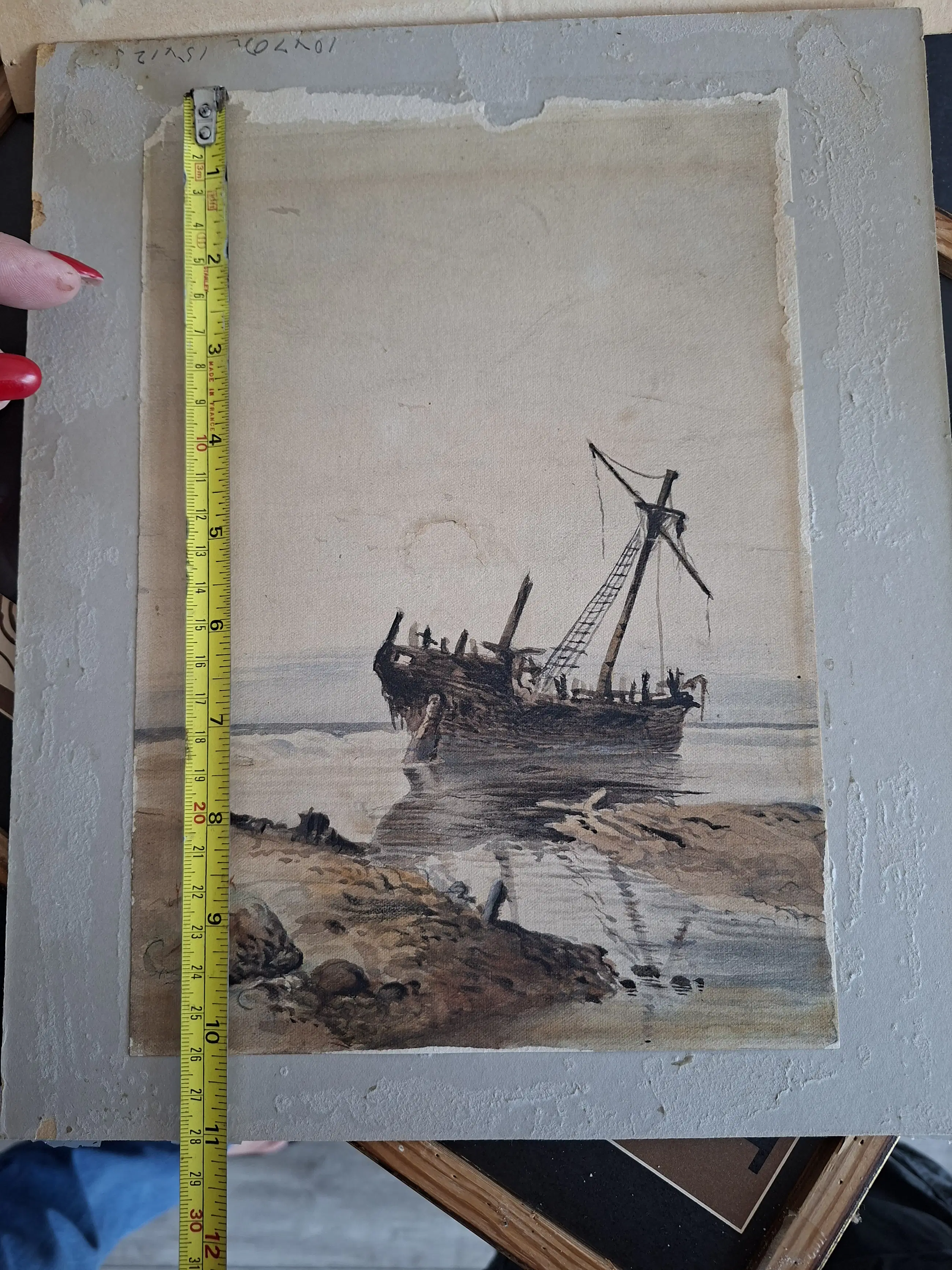 Een melancholieke aquarel of gouache van een gestrande zeilboot op een stille kust, met een zachte horizon en een verlaten, haast poëtische sfeer.