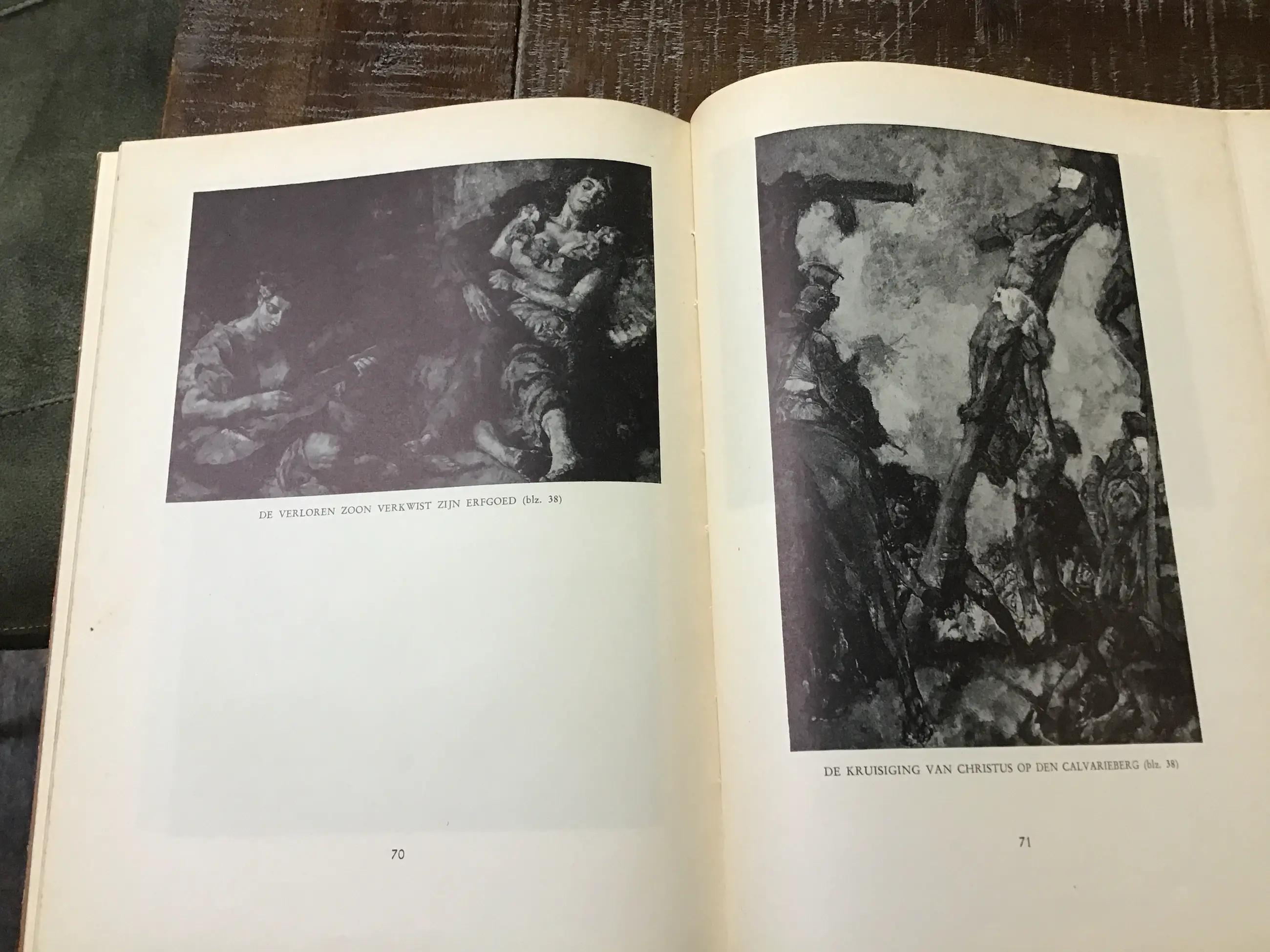 ‘Geschenk uit hoogachting en vriendschap van den kunstschilder J.H. Jurres, oud-professor aan de Rijksacademie voor Beeldende Kunsten in Amsterdam.’ Het boek bestaat uit een inleiding door de schrijver Henri H. van Calker en 39 zwart-wit afbeeldingen met een beschrijving per afbeelding. Het boek is prima in orde. Het is aan de buitenkant wel zichtbaar veel gebruikt zonder dat er iets van de inhoud beschadigd is.