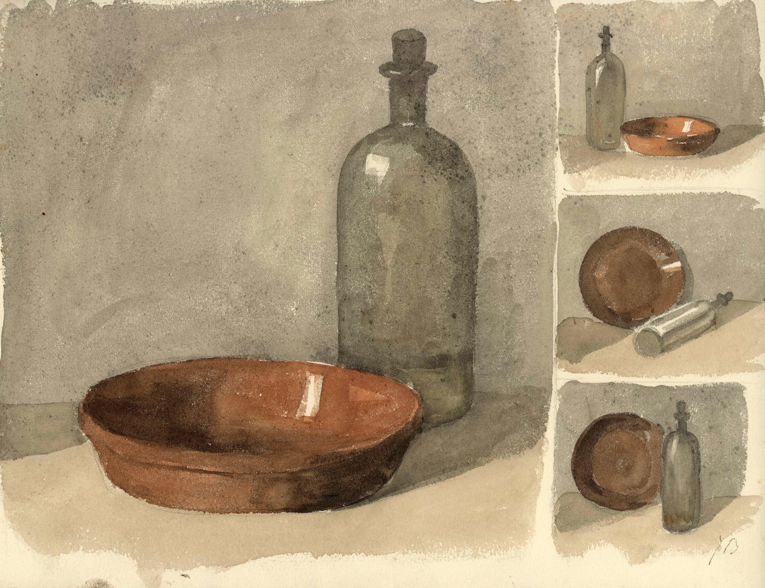 Gemonogrammeerd met J.B. Brolsma was leraar en gebruikte dit werk als lesmateriaal: Studie stilleven. Contrast kleuren. Alle kleuren zijn op het oranje afgestemd.