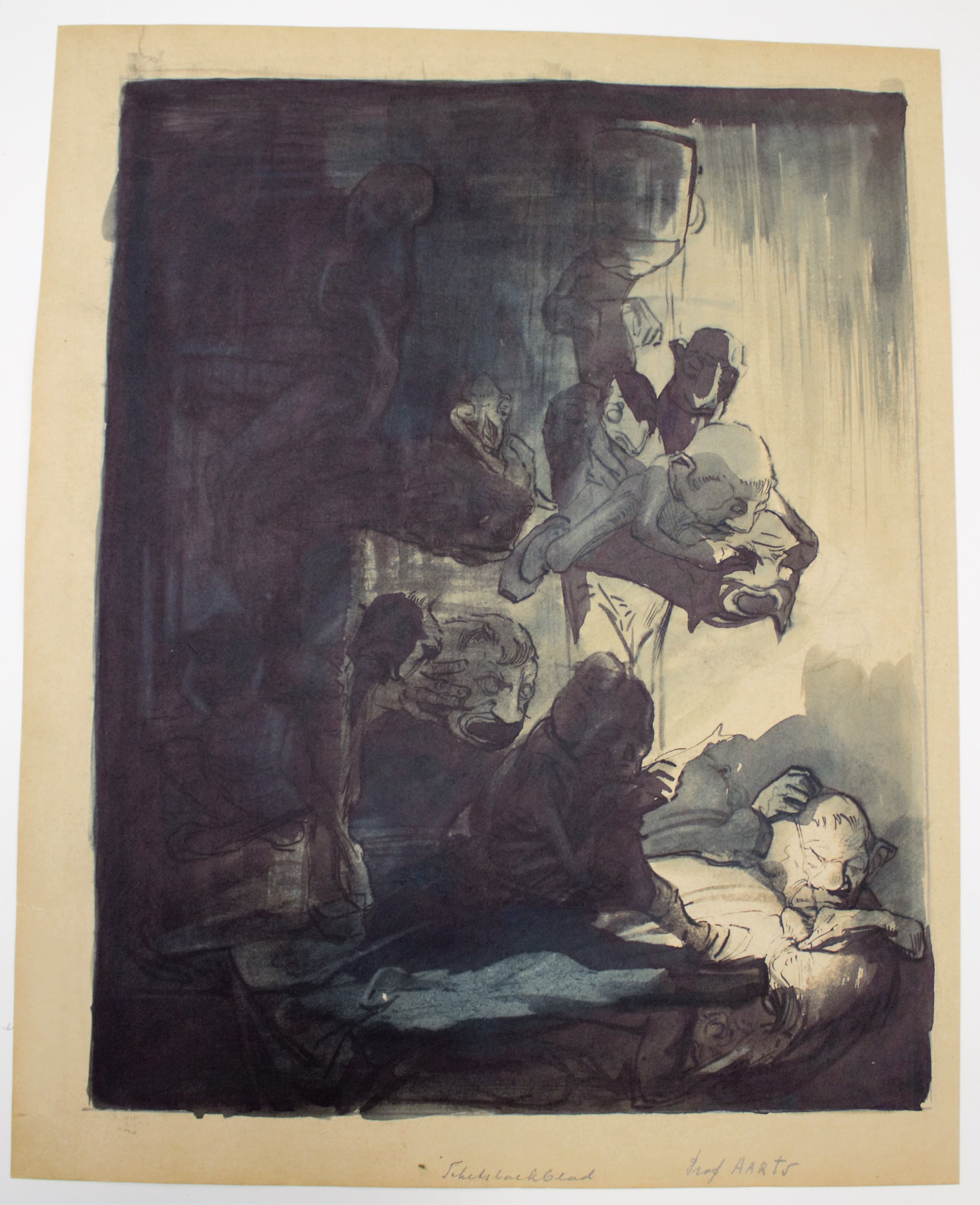 Een groot schetsboekblad van Johannes Josephus Aarts (Den Haag 1871-1934 Amsterdam) met een (gewassen) inkttekening van fantasiefiguren. Het werk heeft een surrealistisch karakter.