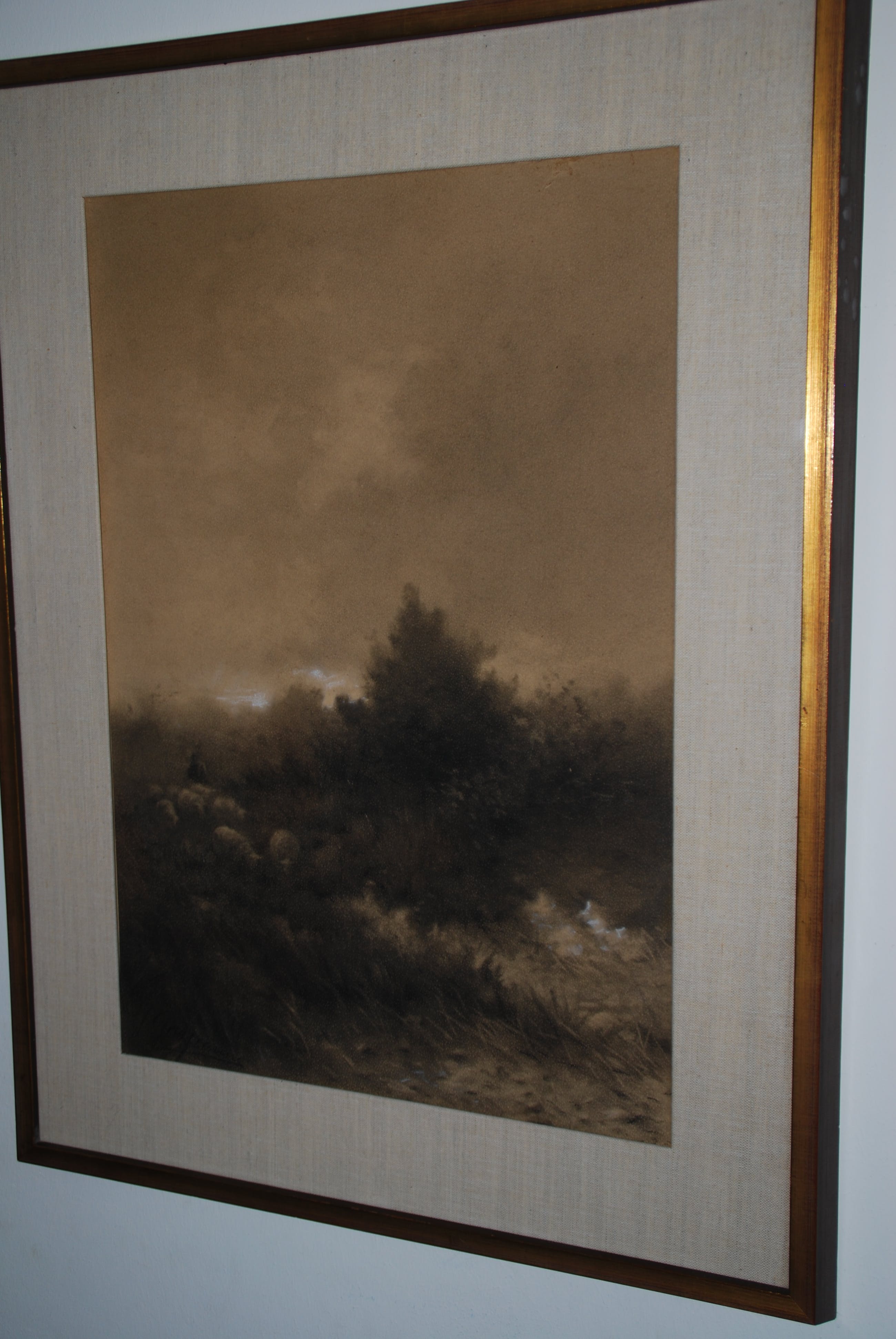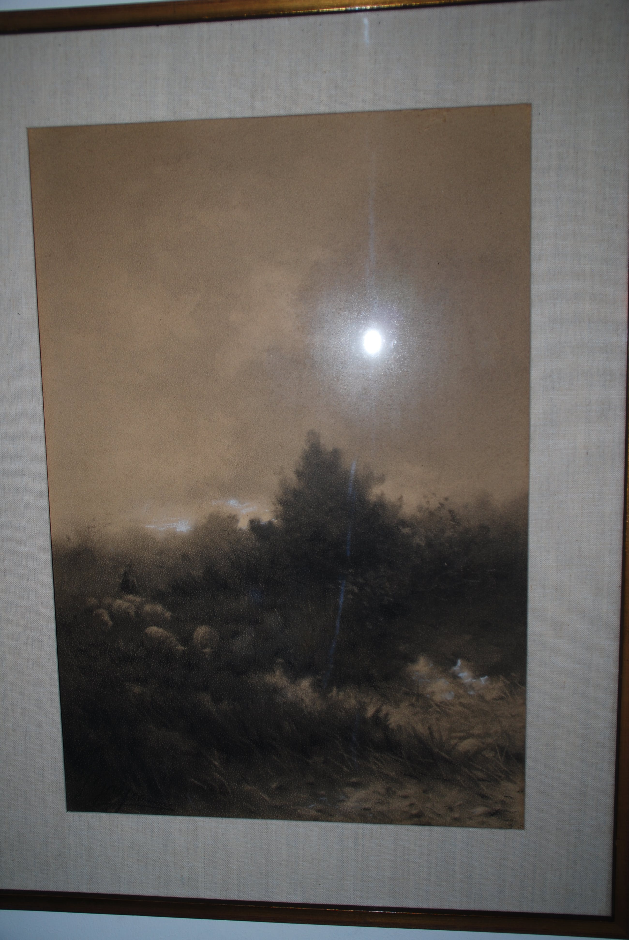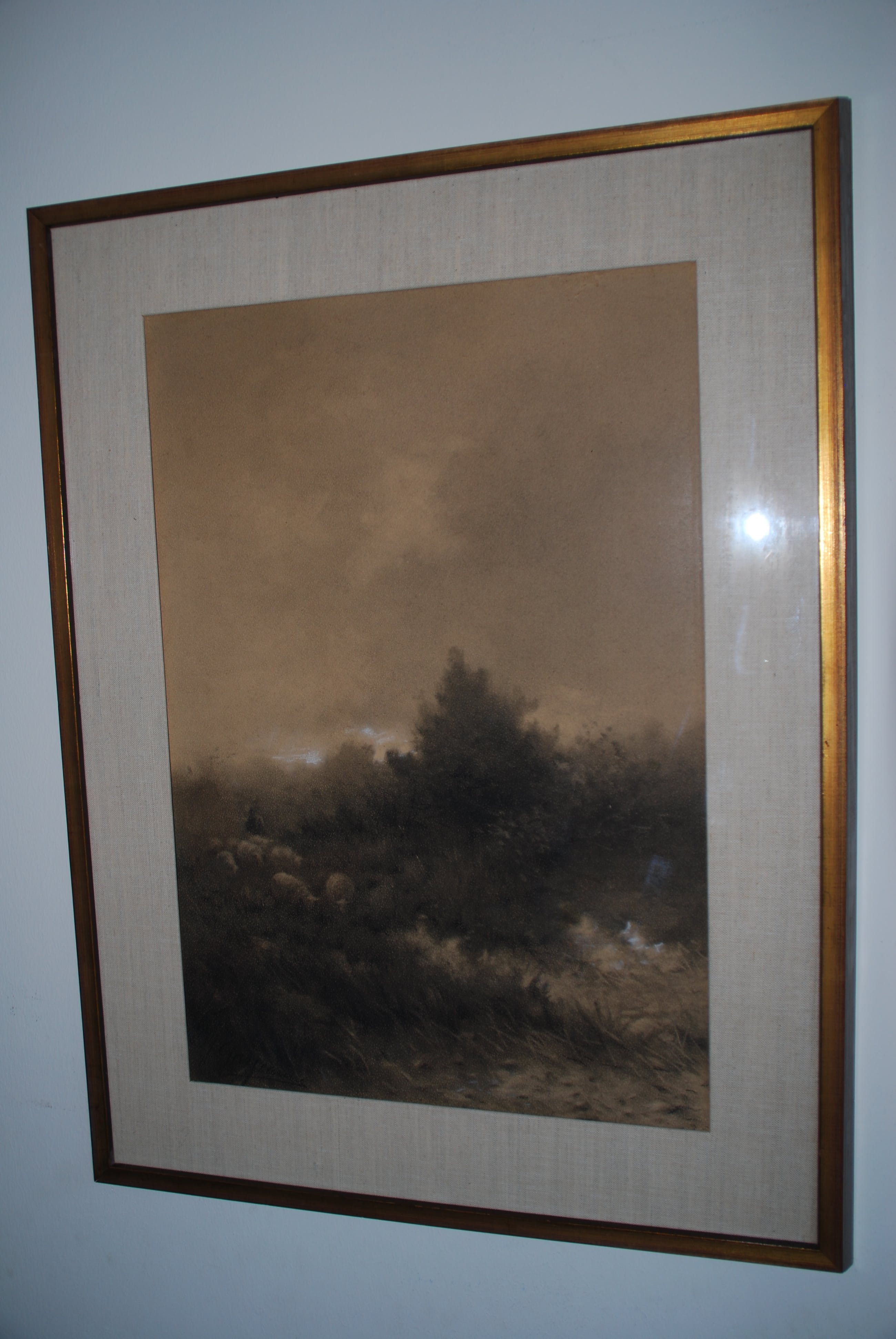 Heidelandschap met schaapskudde. Bijzonder fijn getekend. Details komen mooi uit met een spot op het schilderij.