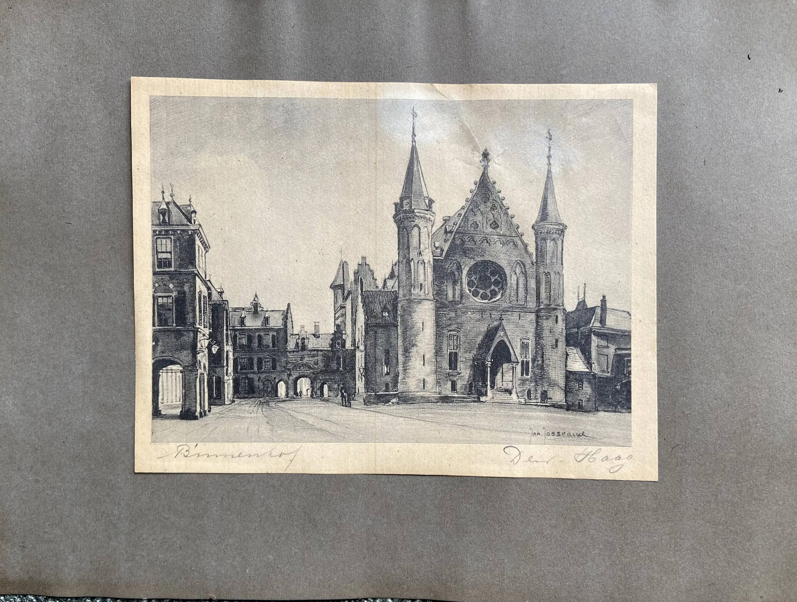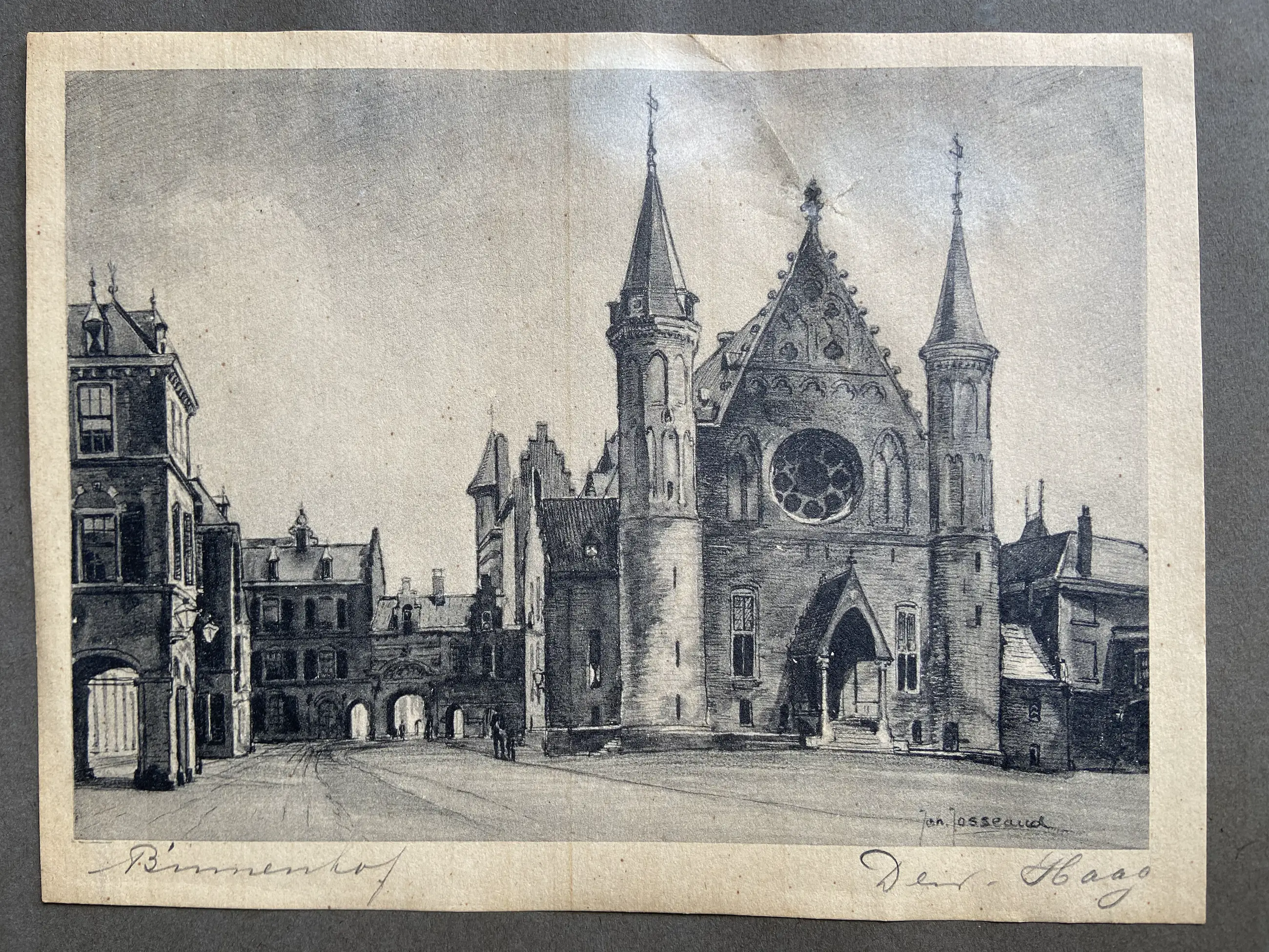 Ets van Johannes Josseaud van het Binnenhof in Den Haag. Zonder lijst, handgesigneerd met potlood.