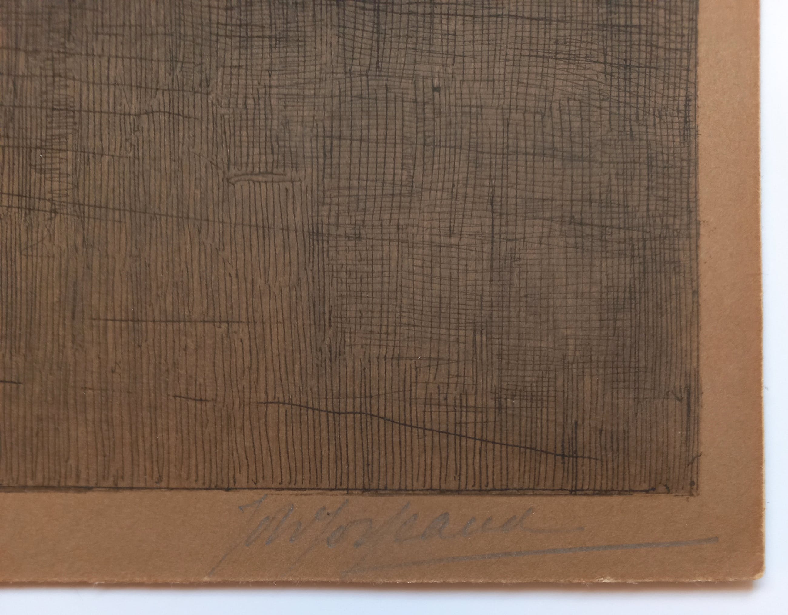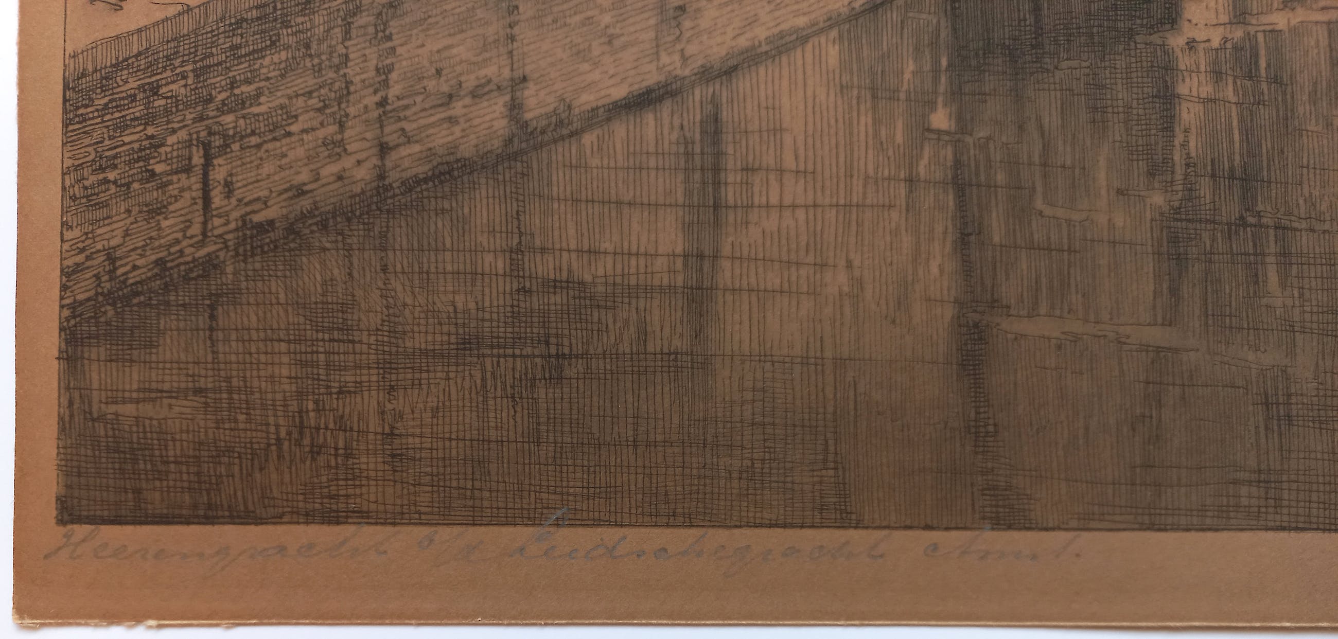 Bekende ets van Johannes Josseaud, de hoek van de Leidsegracht en de Herengracht gezien van de brug bij de Huidenstraat. Ets op geschept papier, met potlood gesigneerd en getiteld. In redelijke conditie. Het blad heeft ingelijst gezeten want het hele blad is sterk verkleurd. De ets op zich is uitstekend.