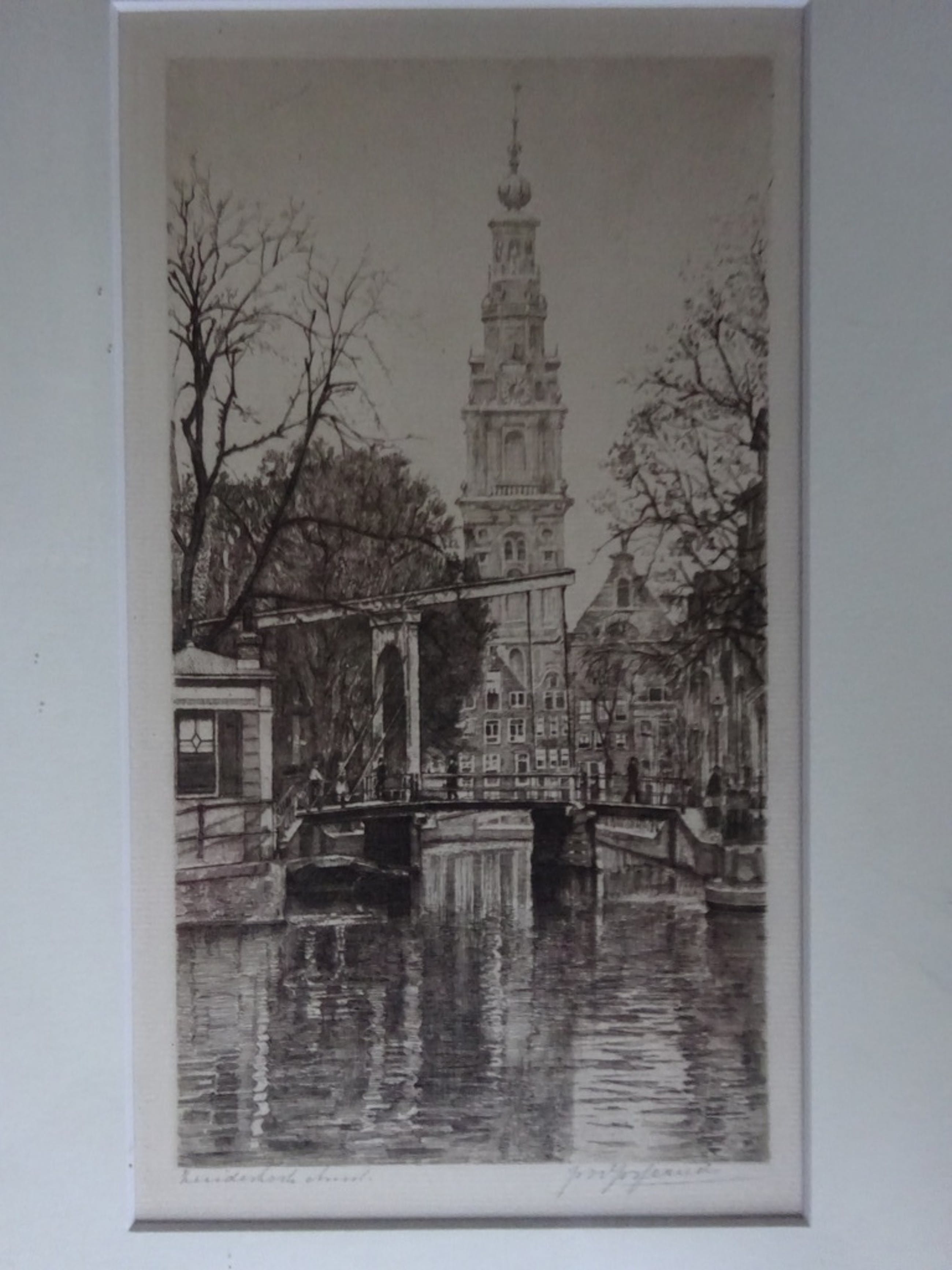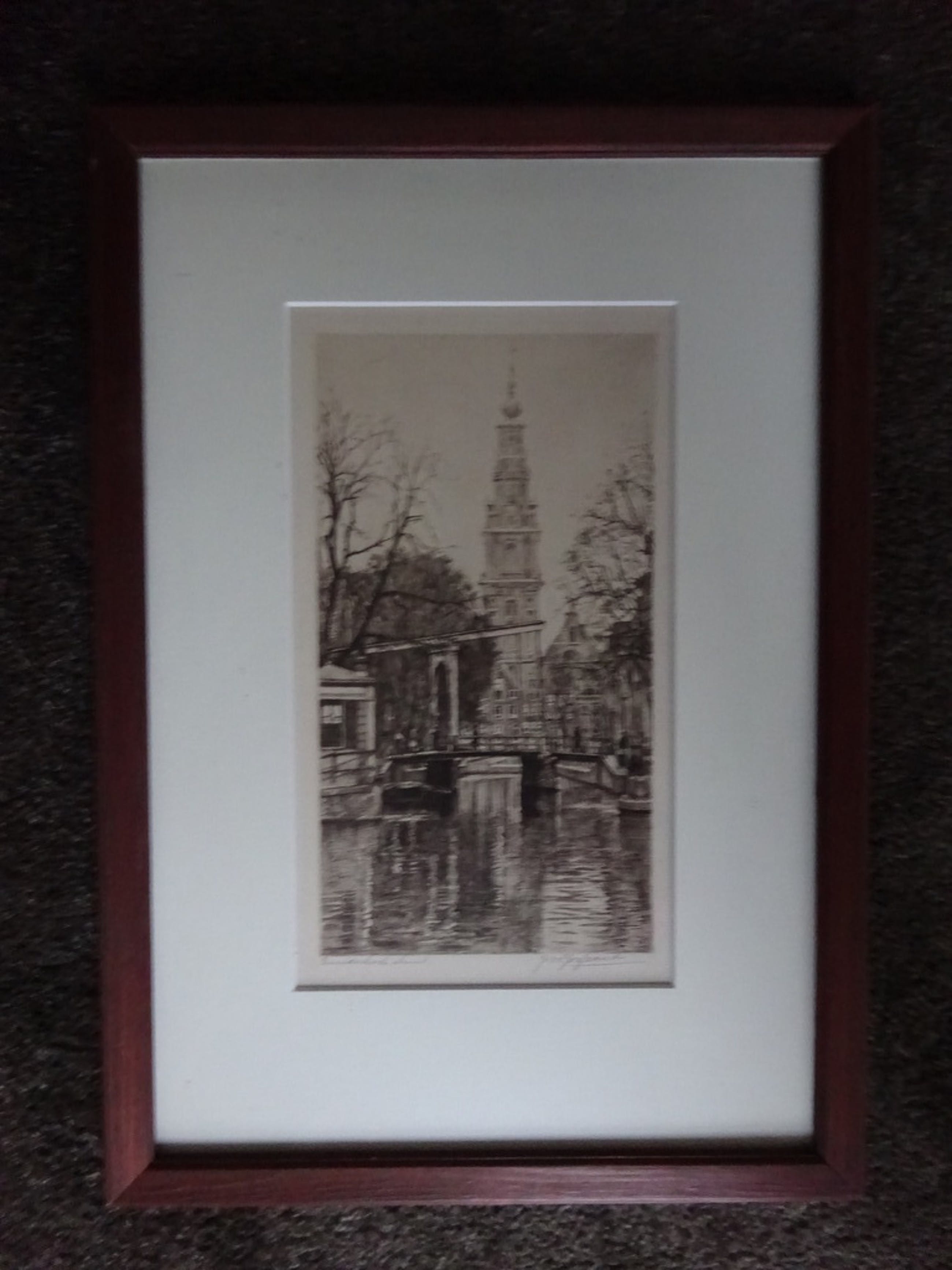 Ets : 24,5 x 13,5 cm. Met zuurvrij passe-partout en lijst : 43,5 x 30,5 cm.