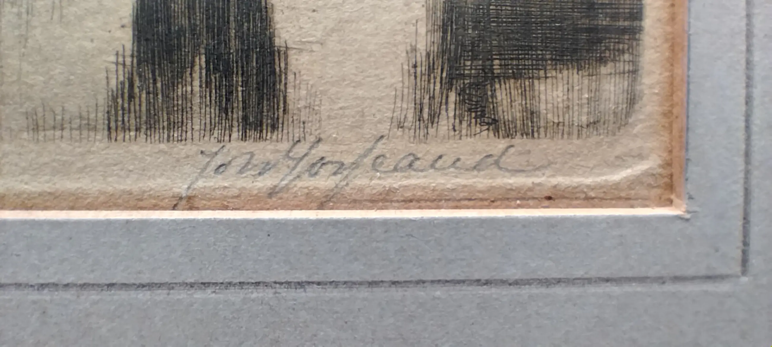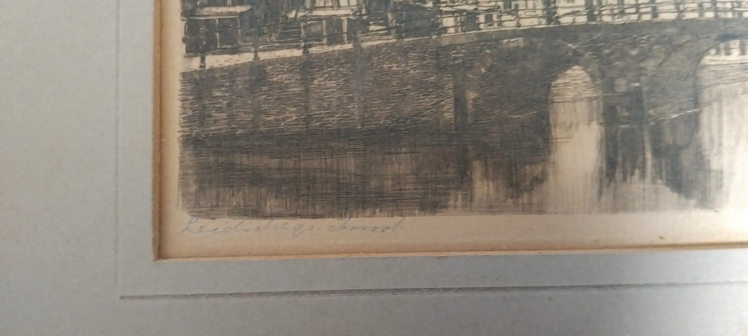 De ets verkeert in redelijke staat. Het werk is niet ingelijst; de passe‑partout heeft wat gebruikssporen, maar het beeld zelf is netjes en helder.