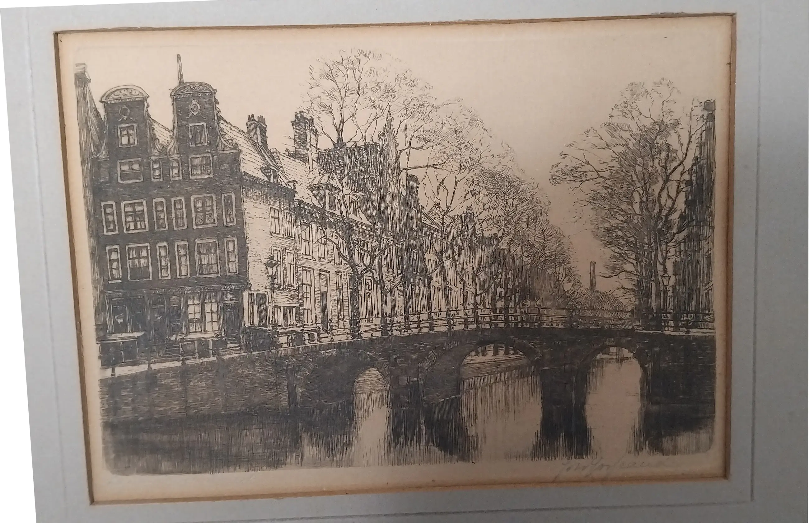 Een karakteristiek en decoratief Amsterdams stadsgezicht van een gewaardeerde etser uit het begin van de 20e eeuw.