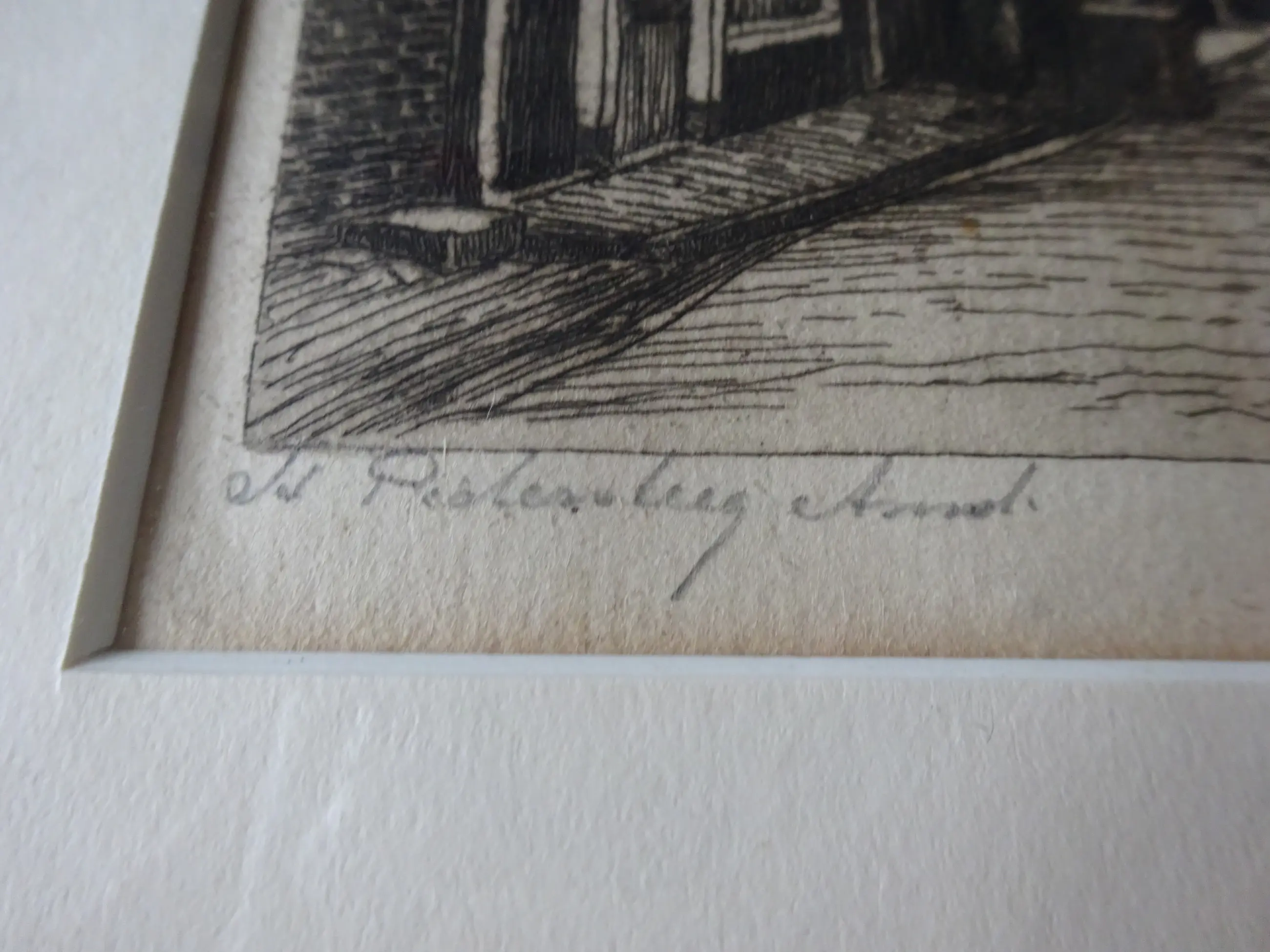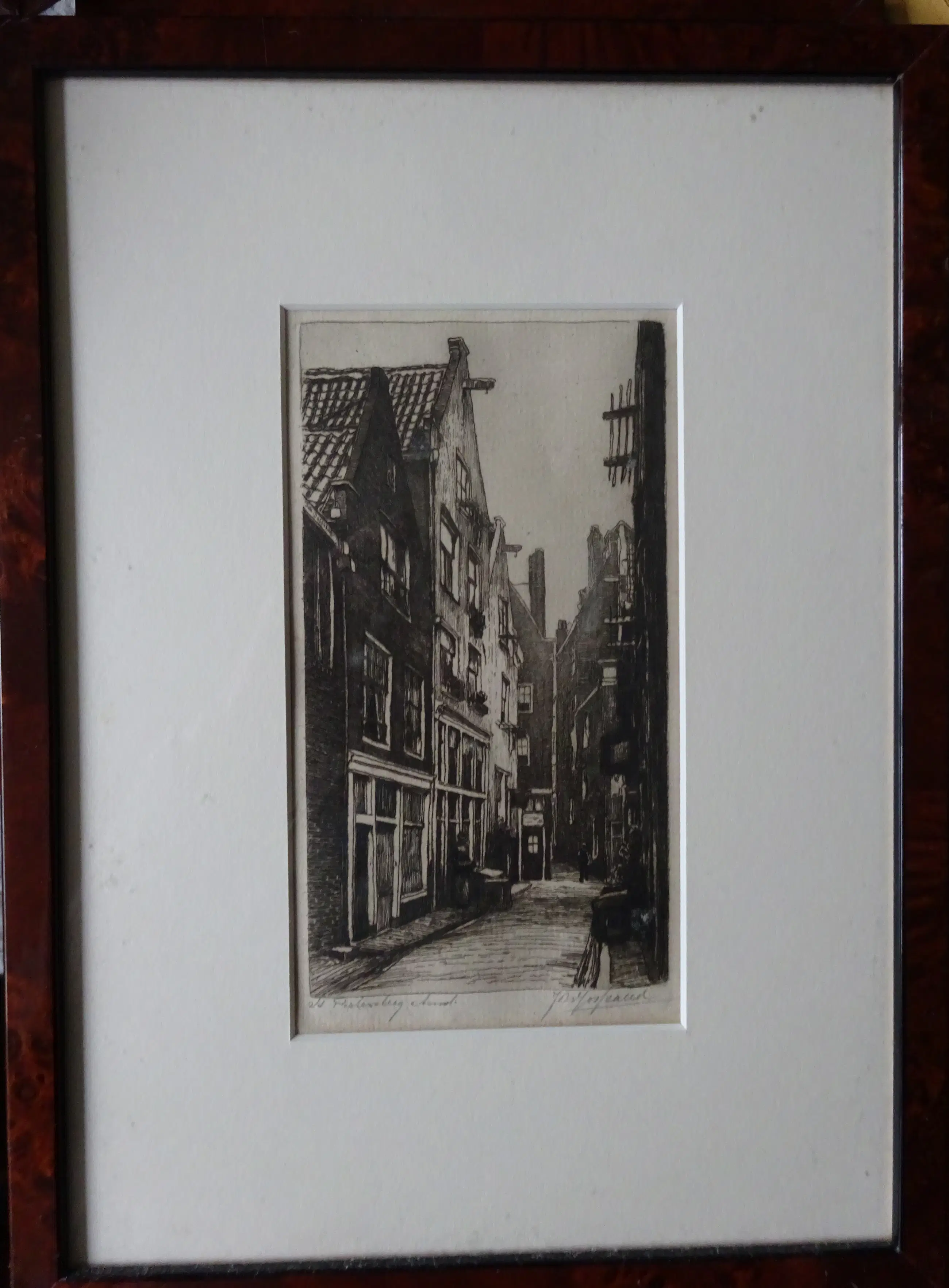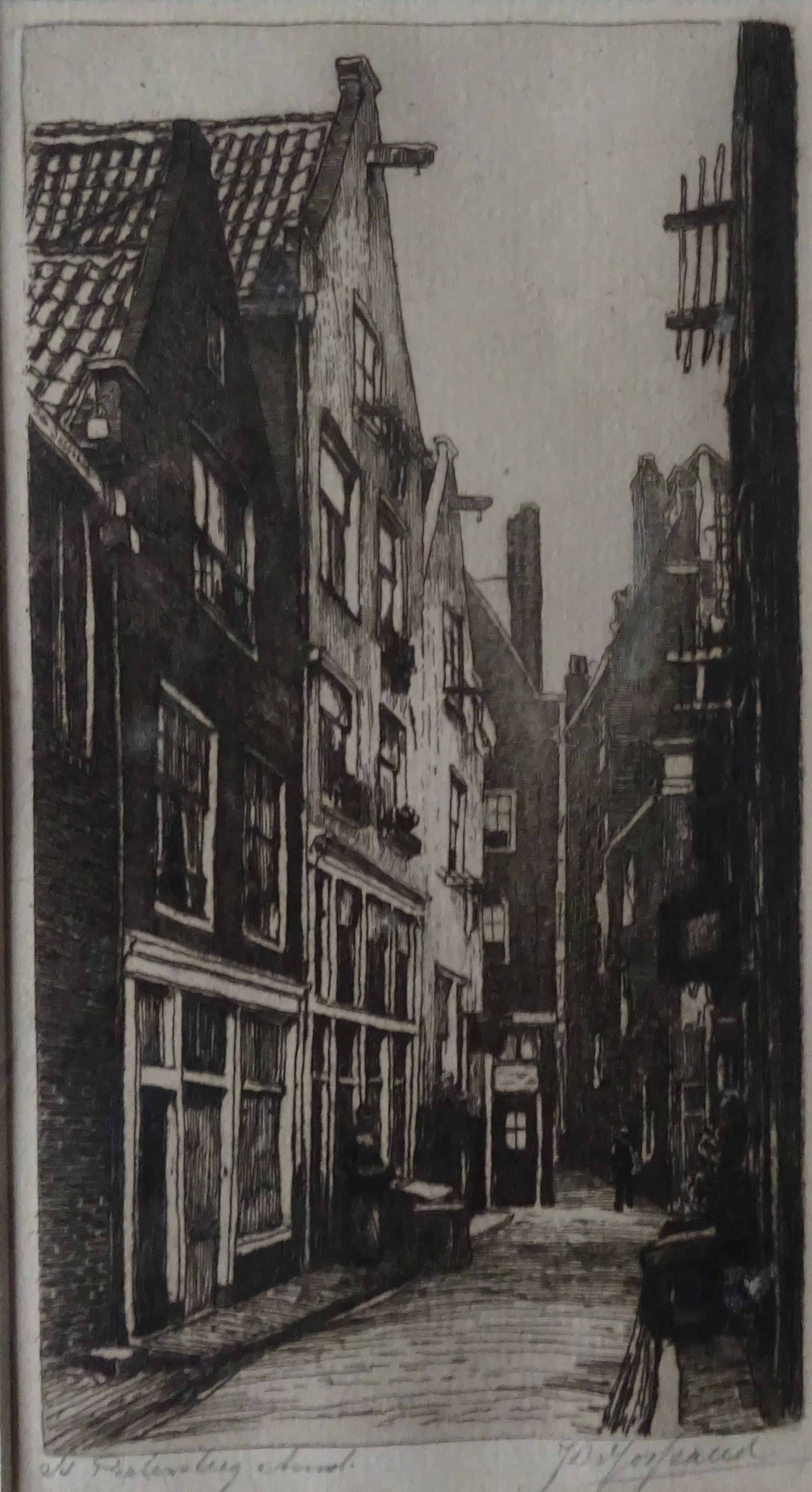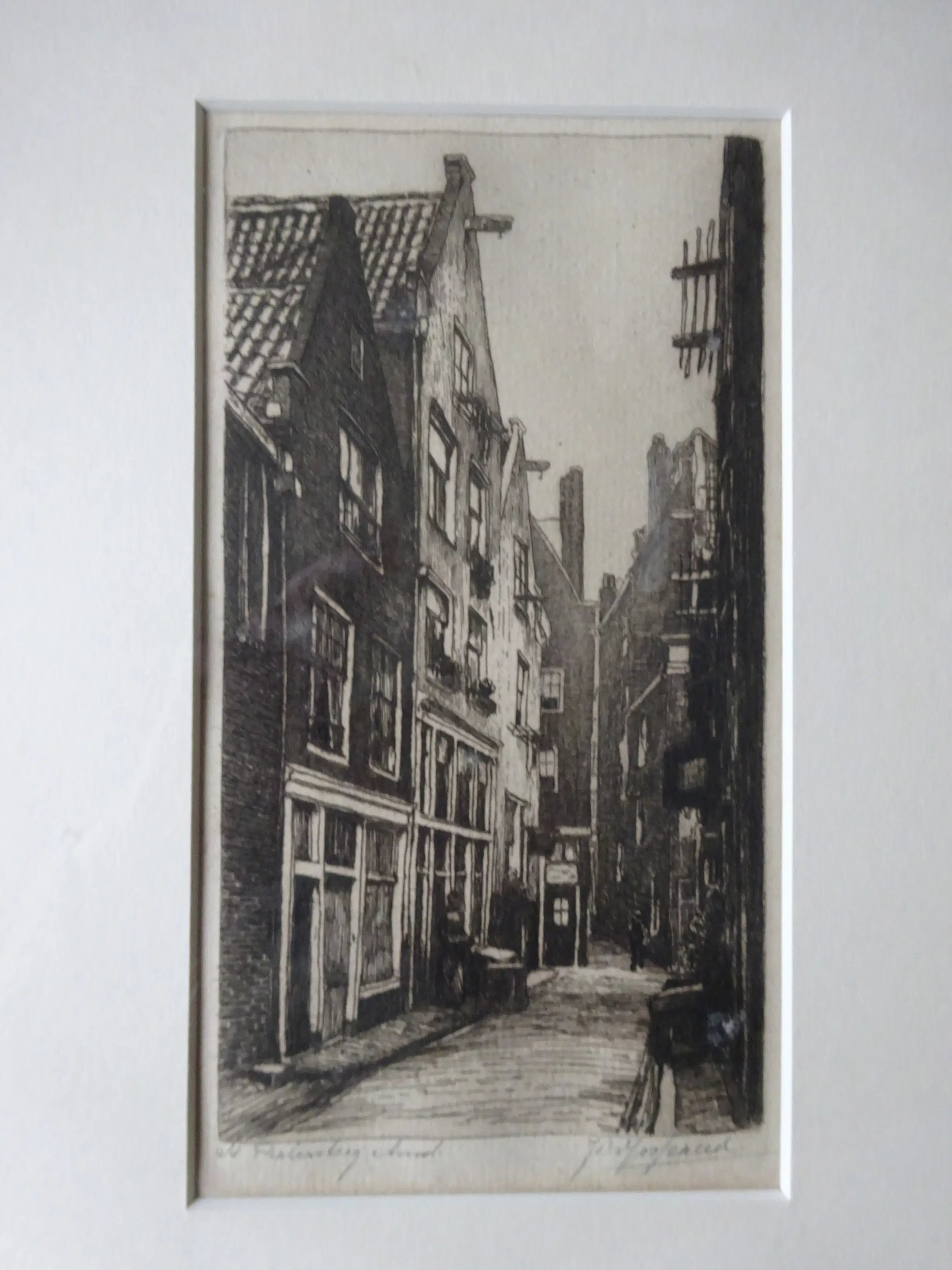 Ets J.W.Josseaud 1880-1935 Afgebeeld: St Pietersteeg Amsterdam 1927 Gesigneerd met: JW Johannes Josseaud Met potlood: St Pietersteeg Amstd. Afmeting met glazen lijst: 27.5 x 18.5 cm Afmeting ets: 10.5 x 19.5 cm Conditie: mooie staat, nieuwe passe partout en mahonielijst