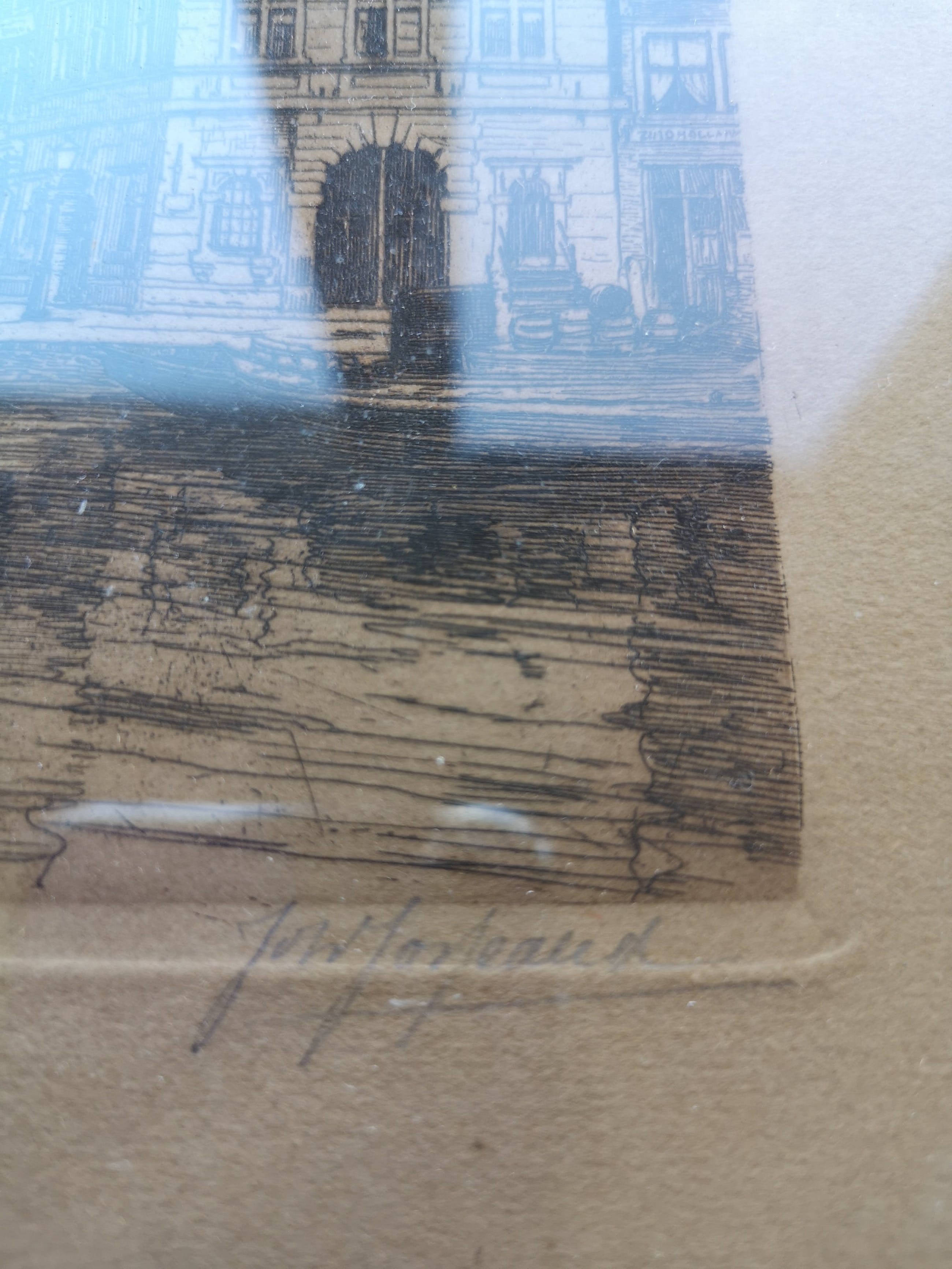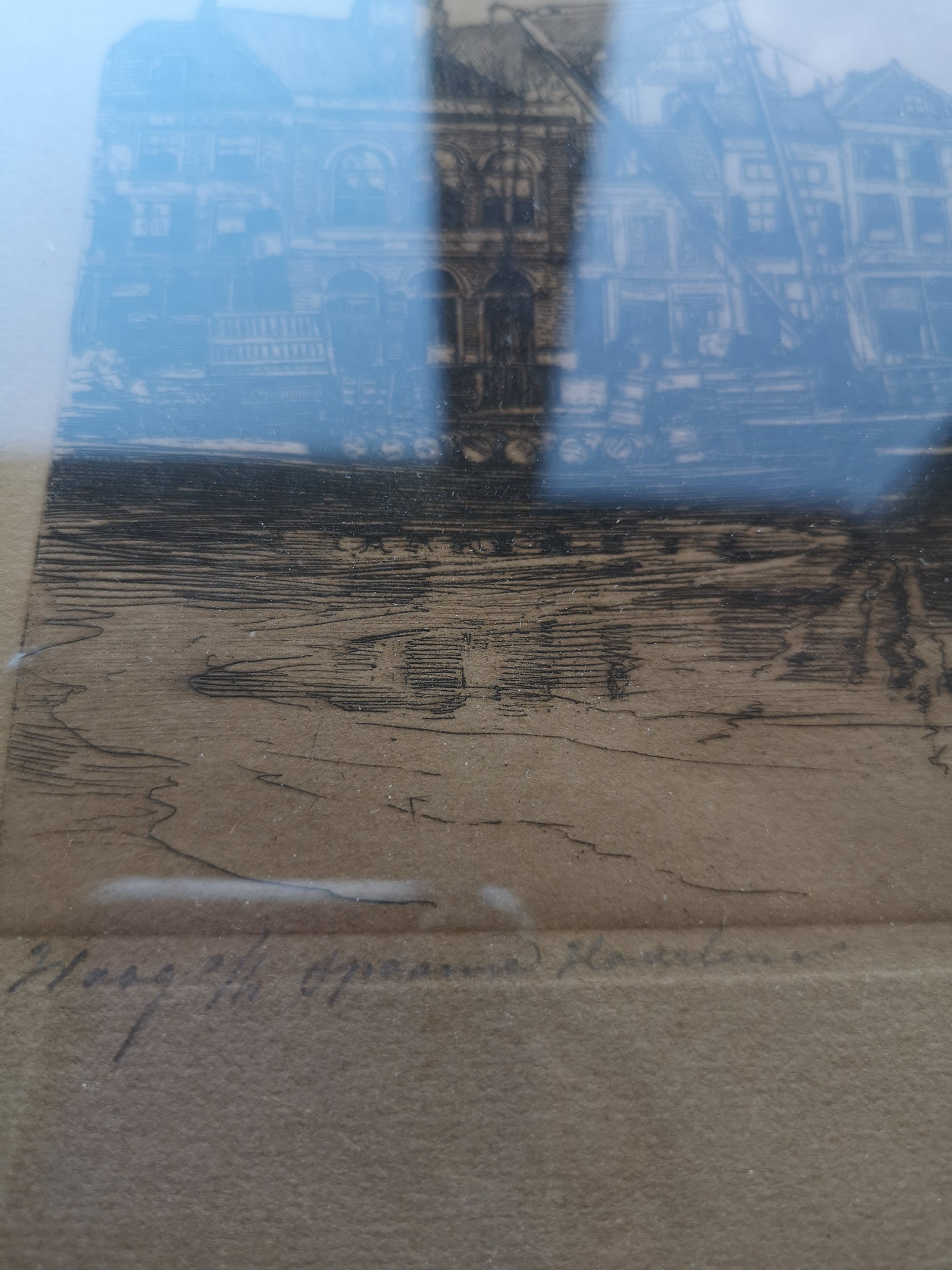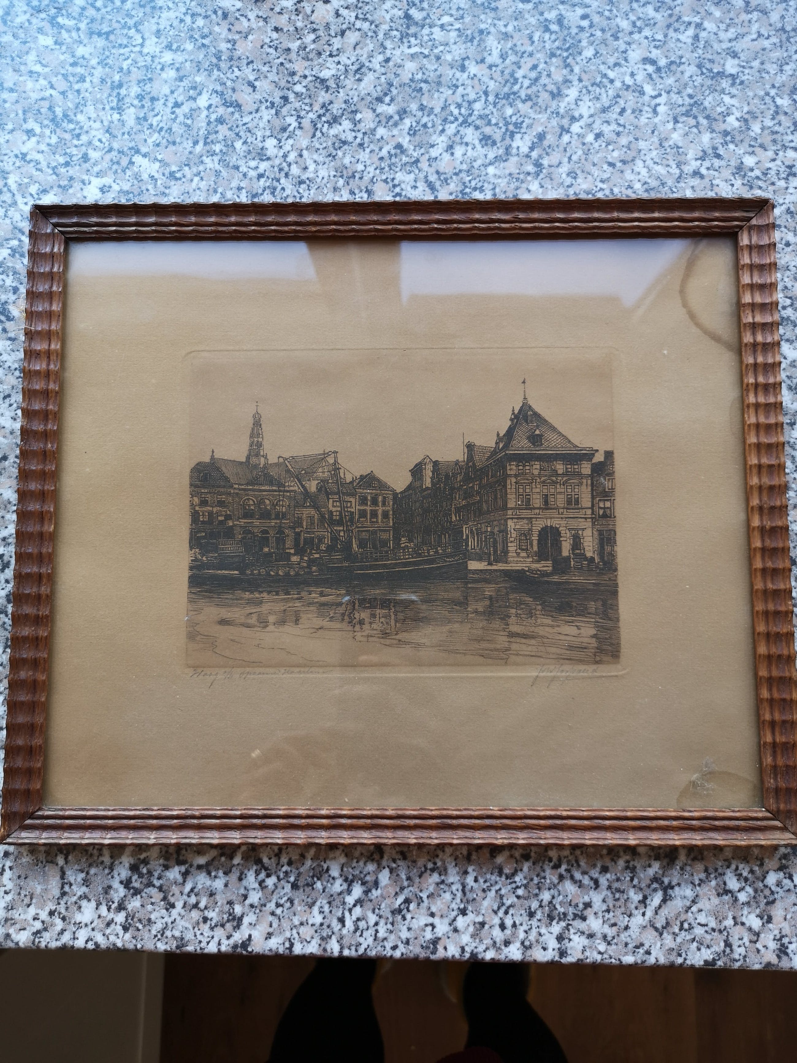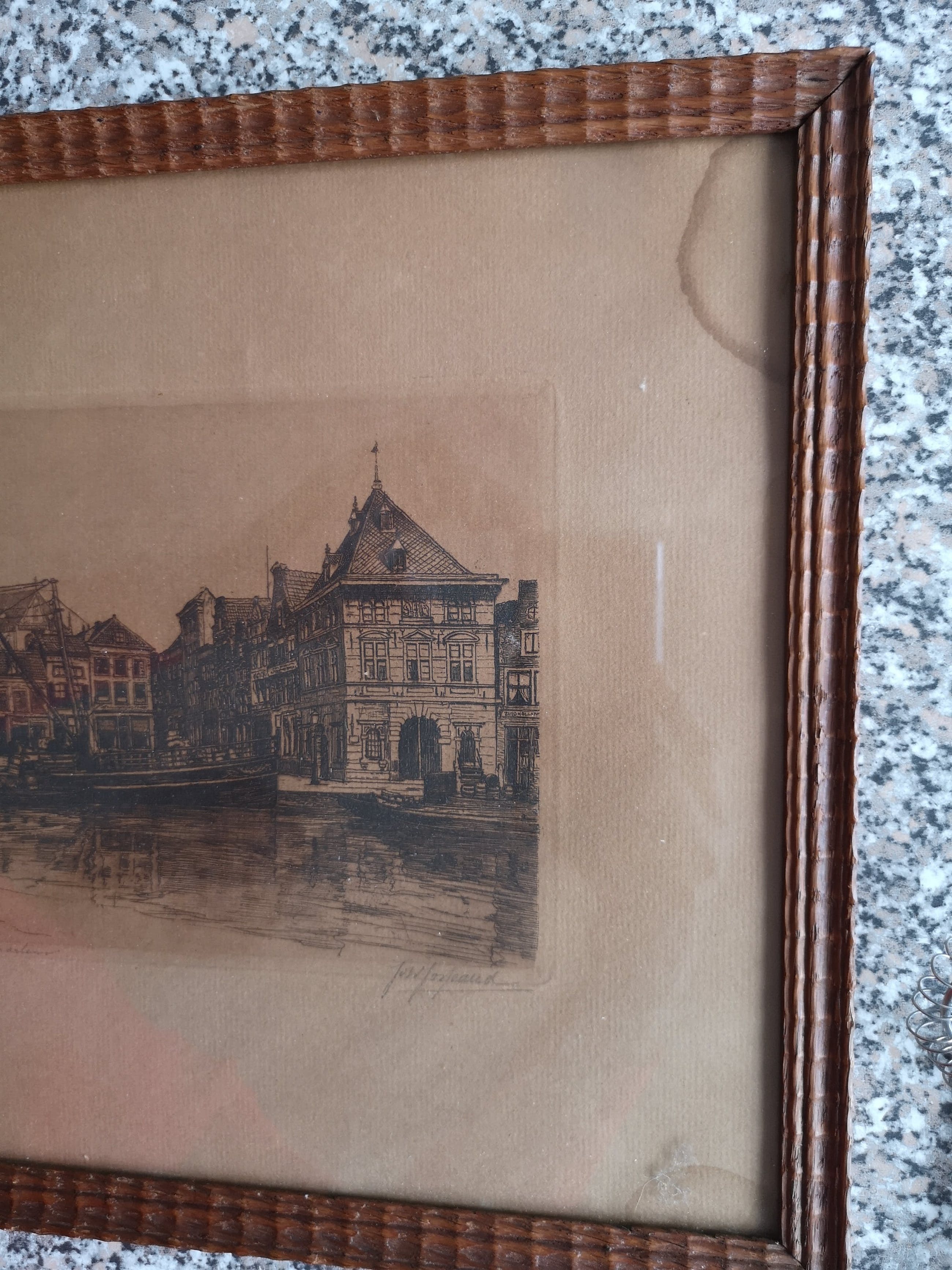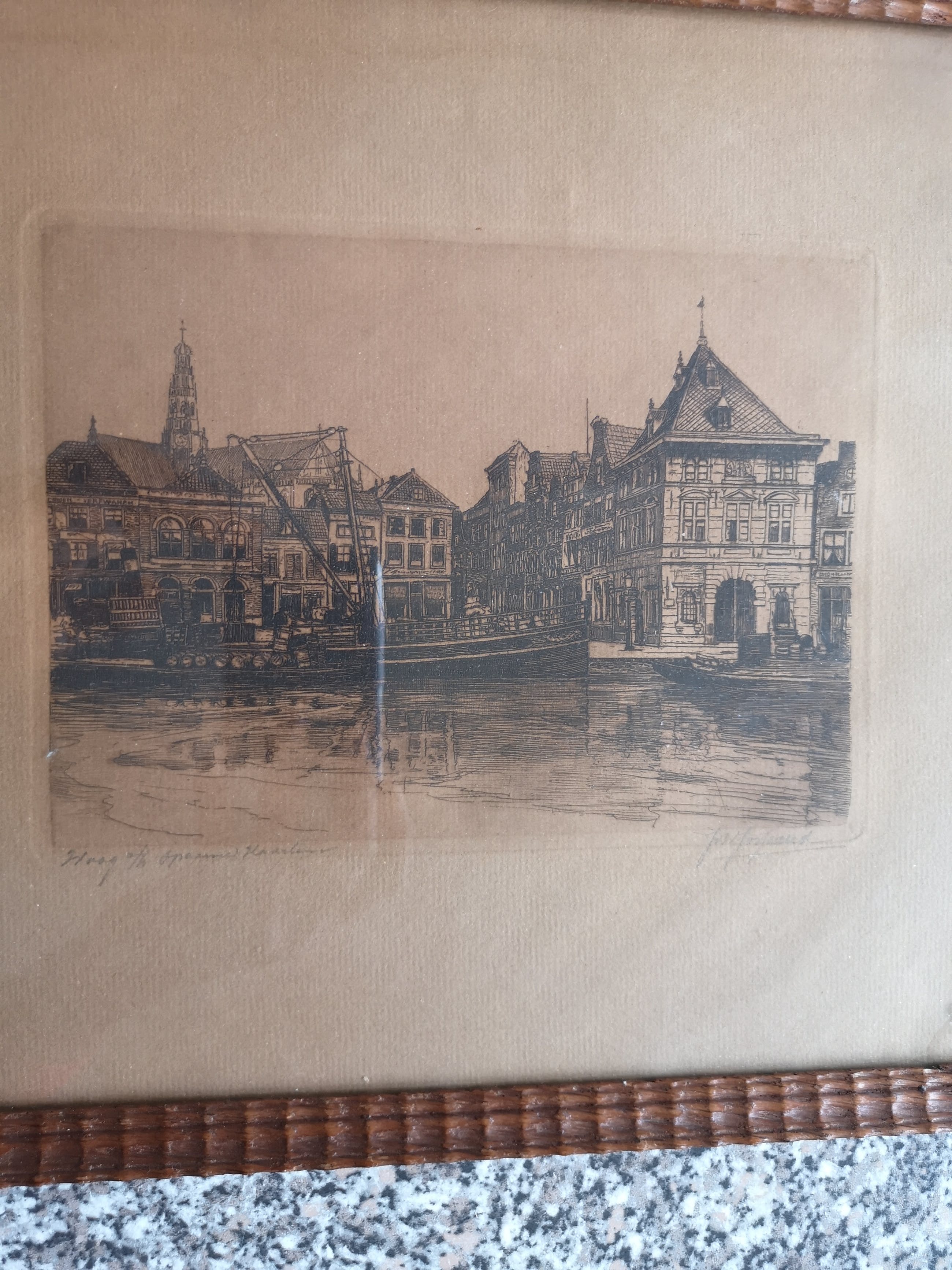 | Er lijkt iets van waterschade aan het water. Dit is op het kader en niet op de ets | |||