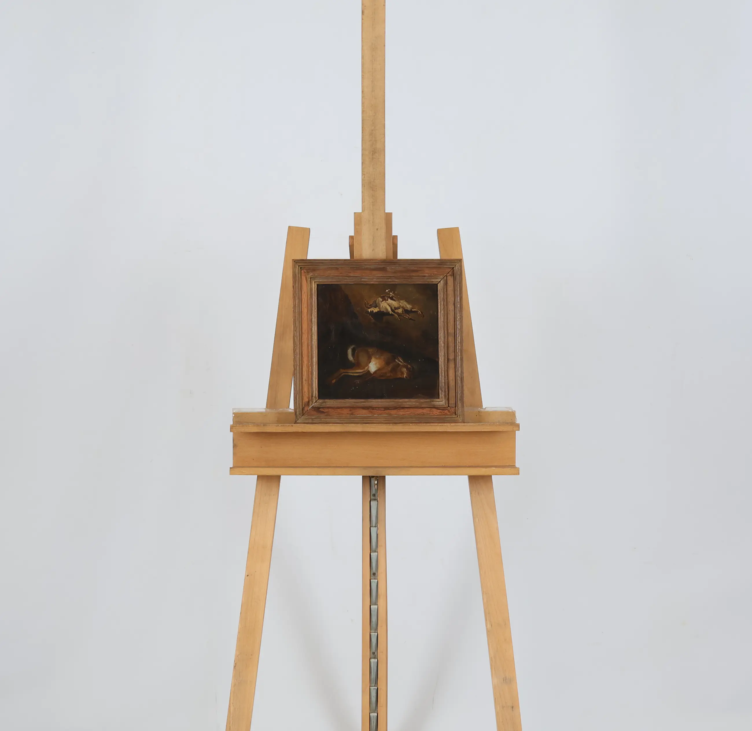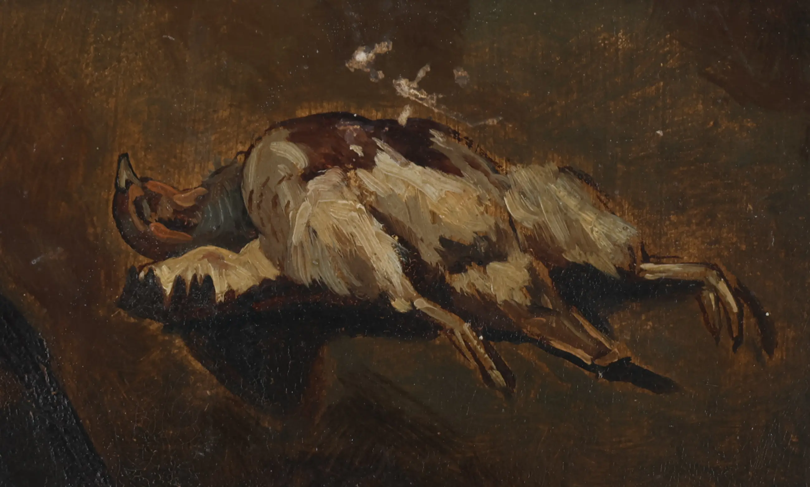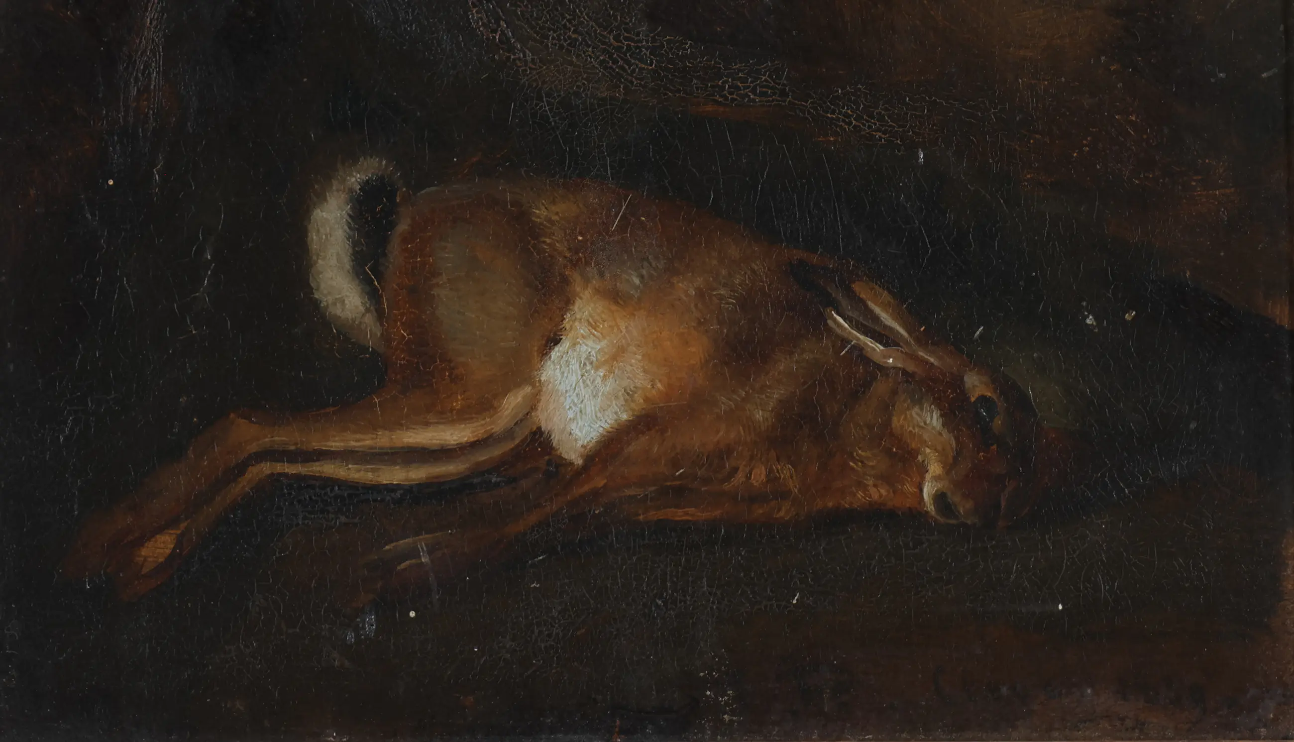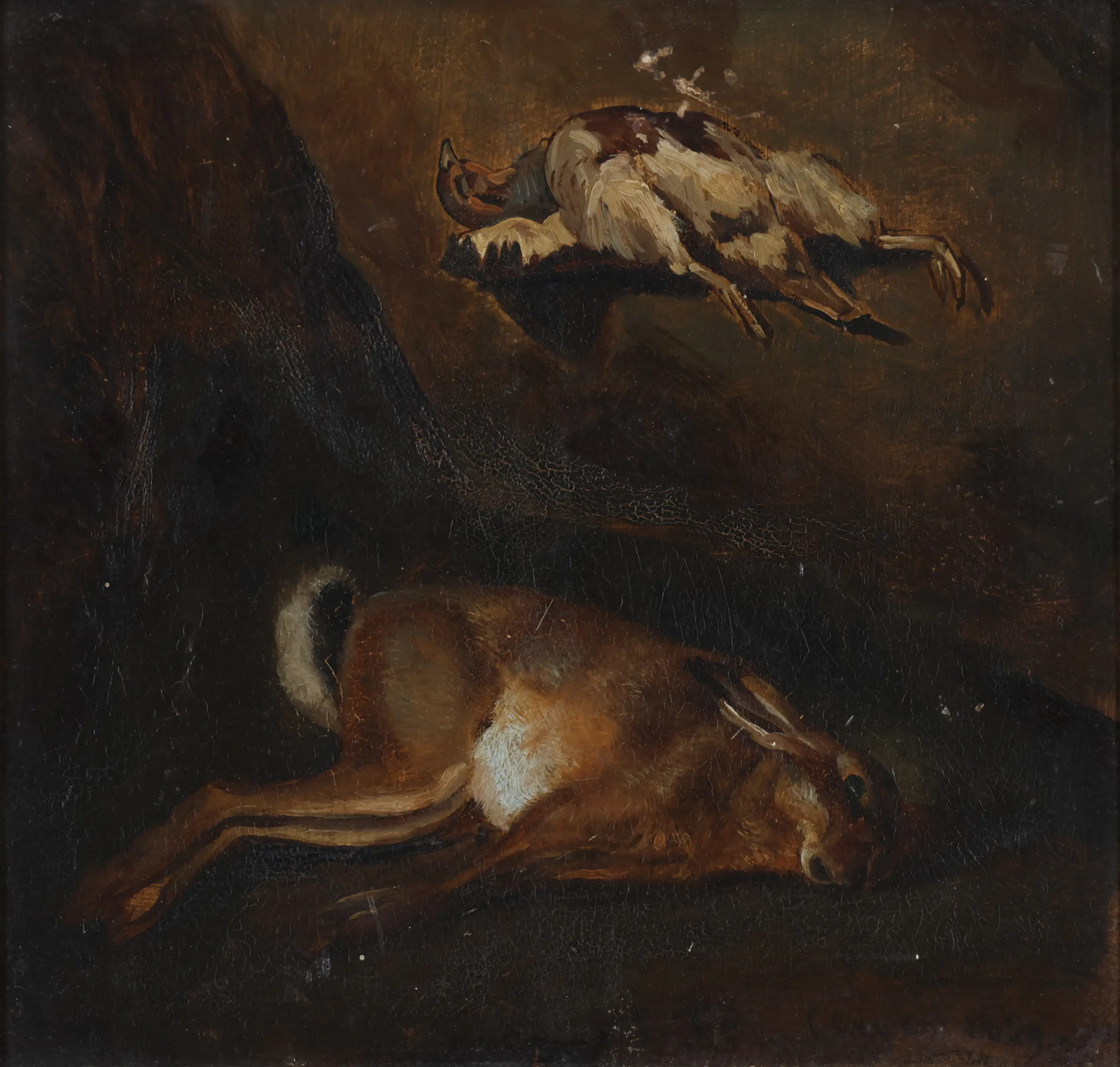 Het werk toont een jachtstilleven met een dode haas en vogel. Het werk heeft hier en daar wat verfbeschadigingen.