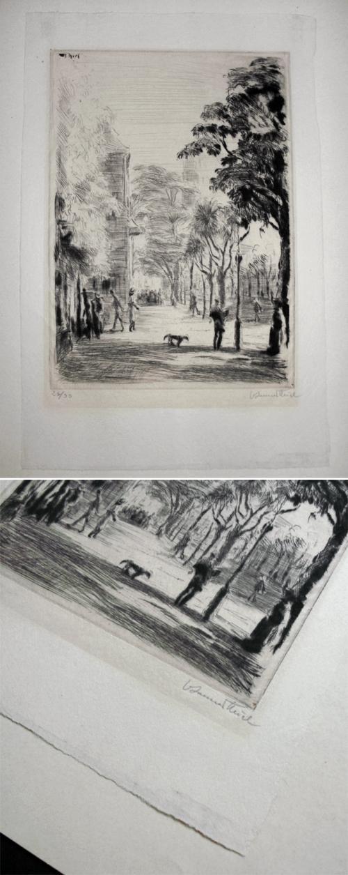 Johannes Thiel. Straße mit Passanten und Hund. Radierung, um 1920.