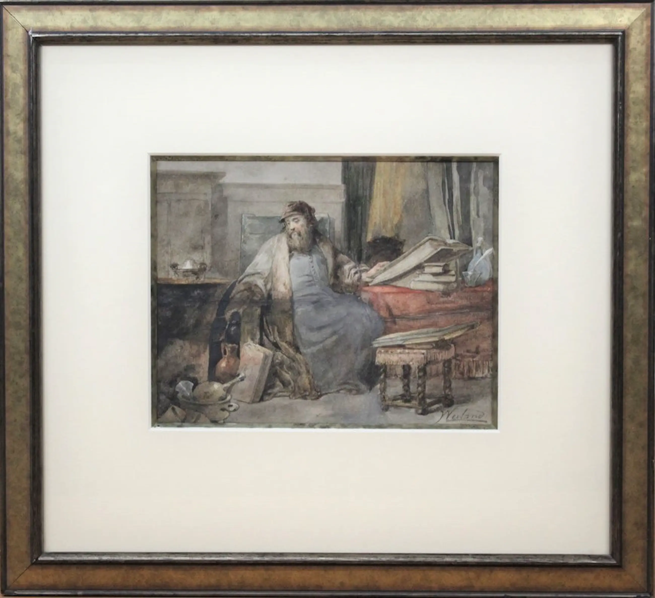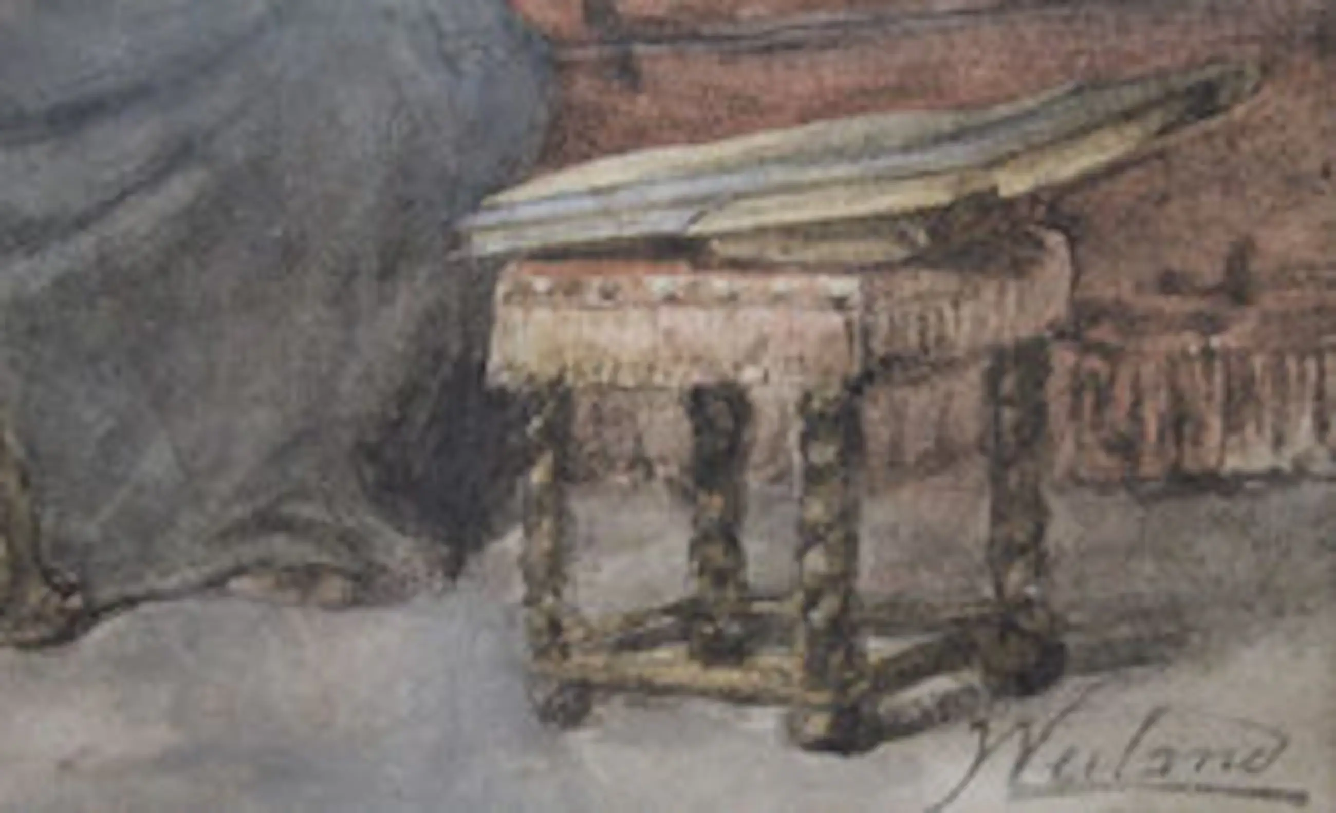 Een schitterend 19de -eeuws kunstwerk ( "Lezende man in interieur", aquarel op papier ) van de Nederlandse kunstschilder Johannes Weiland (1856-1909). Met een prachtige goudkleurige lijst, passe partout en anti reflexglas. Gesigneerd rechts onder en te dateren ca. 1900. De afmetingen met lijst: 40 cm. x 44 cm. De beeldmaat is: 18 cm. x 23 cm. De algemene conditie van het kunstwerk is heel goed. Het werk is te bezichtigen bij Kunsthandel Martins te Wolvega en wordt geleverd met een echtheidscertificaat.