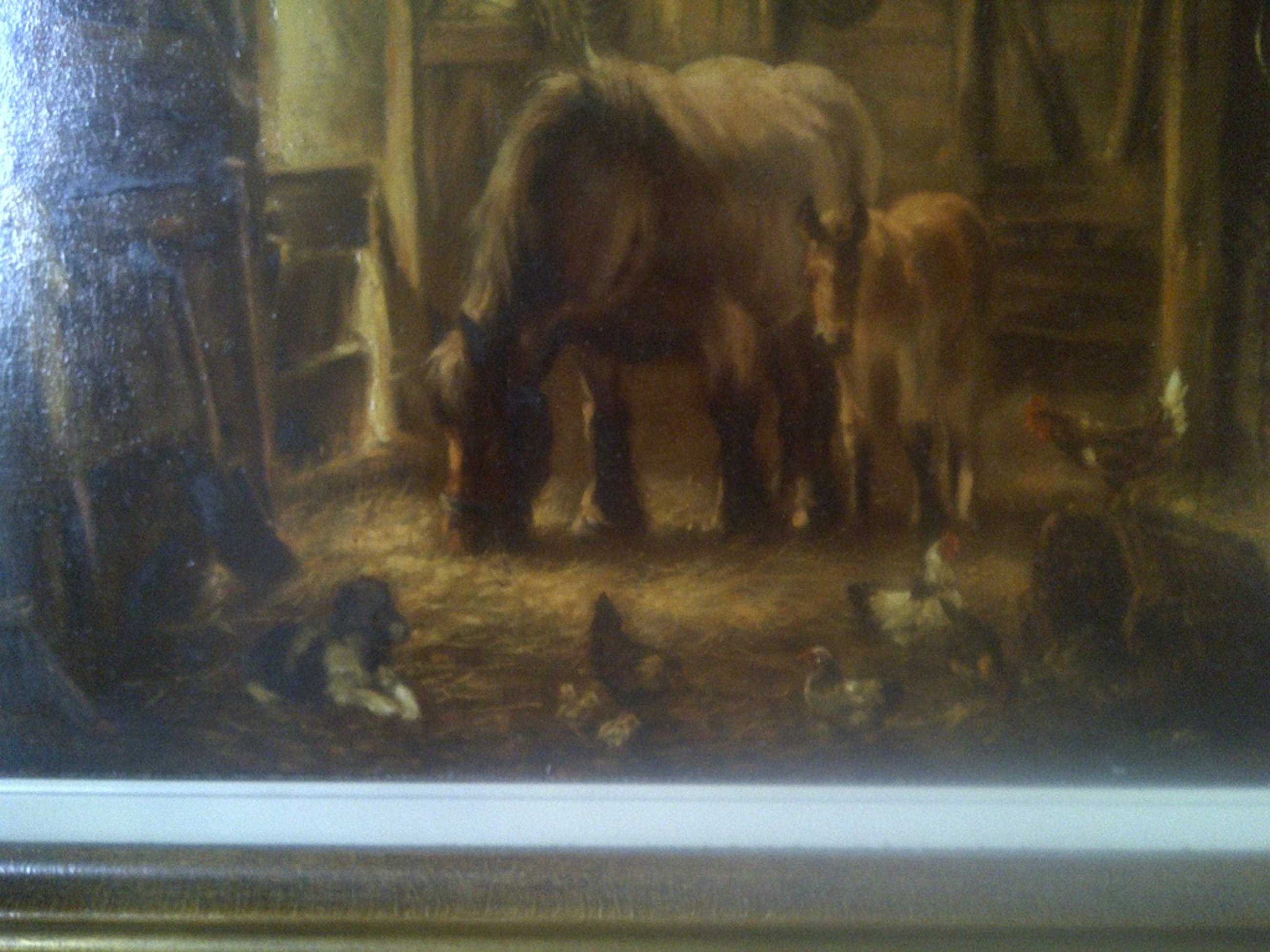 Bijzonder schilderij van Jan van Trirum, ditmaal geen poezen maar een stalinterieur bij ondergaande zon en met een trekpaard en haar veulen, een hondje en enkele kippen afgebeeld. Olieverf op paneel, afmetingen 39 x 41 cm. (excl. mooie lijst), in prachtige conditie. Af te halen in Lochem (Oost-Gld.) of aangetekende/verzekerde verzending.