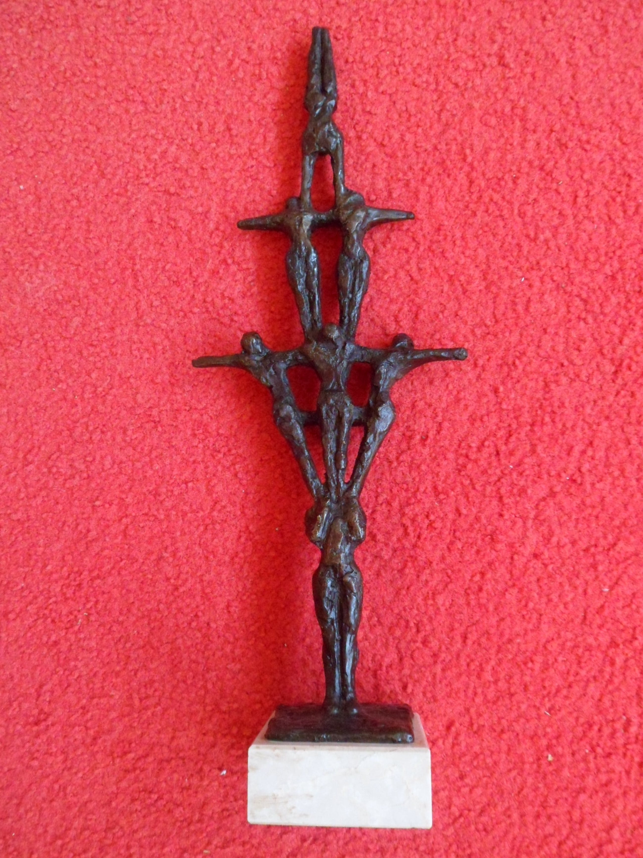 Bijzonder sculptuur in brons/koper 'Zeven Acrobaten' van de Nederlandse beeldhouwer John Bier (1936, Santpoort) Het prachtige "gymnastiek" beeld is in een bijzonder goede staat. John Bier (Santpoort, 17 december 1936) is een Nederlandse beeldhouwer en tekenaar. Bier was 1954 tot 1958 leerling aan het Instituut voor Kunstnijverheidsonderwijs in Amsterdam. Hij verhuisde als driejarige met zijn ouders naar Alkmaar, waar hij nog steeds woont en werkt. De mens speelt een belangrijke rol in het werk van Bier. Een van zijn bekendere beelden is dat van strandvonder Simon Gutker (1897-1988), dat op het eind van de Hondsbossche Zeewering bij Camperduin werd geplaatst. Gemerkt op de voet: JB links en rechts +/- 81. Herkomst: Collectie Streefoord Eemnes.