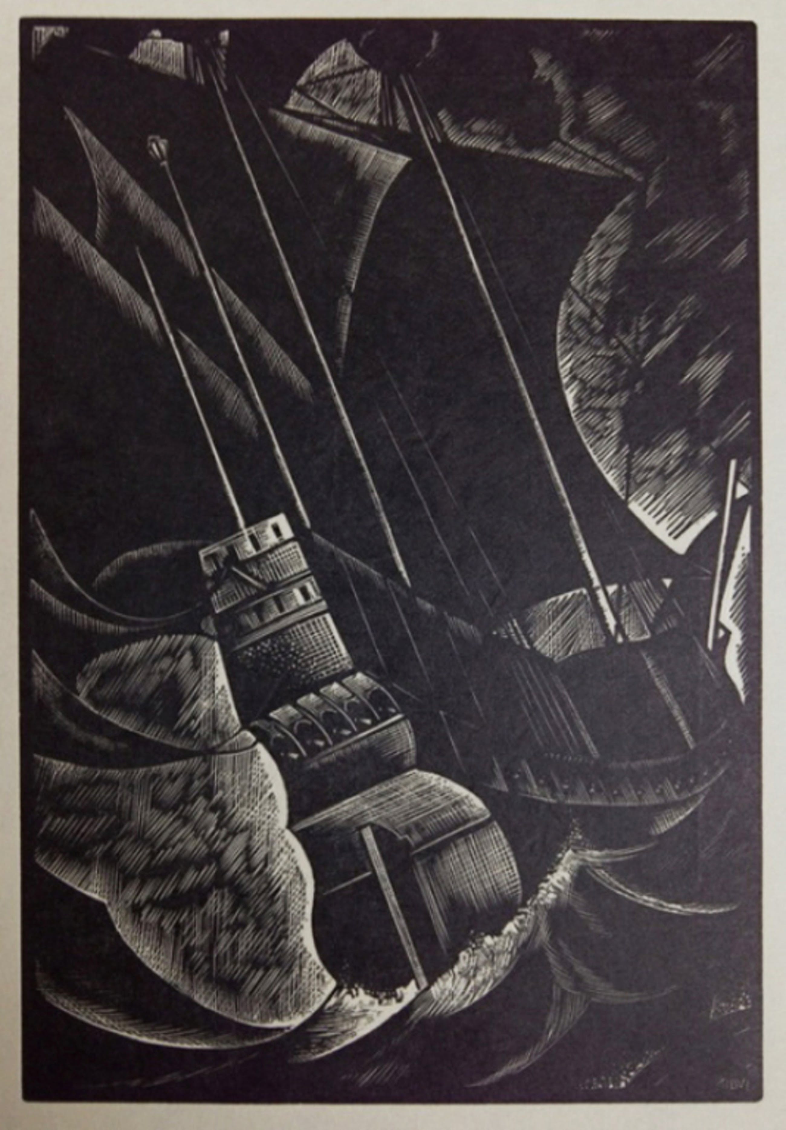 Deze houtgravure, getiteld "Found in a bottle"(afbeelding 1), is een illustratie bij Edgar Allan Poe’s "The Masque of the red death and other tales". Dit boek verscheen bij Halcyon Press in 1932, in een editie van 175 stuks (afbeelding 2).
