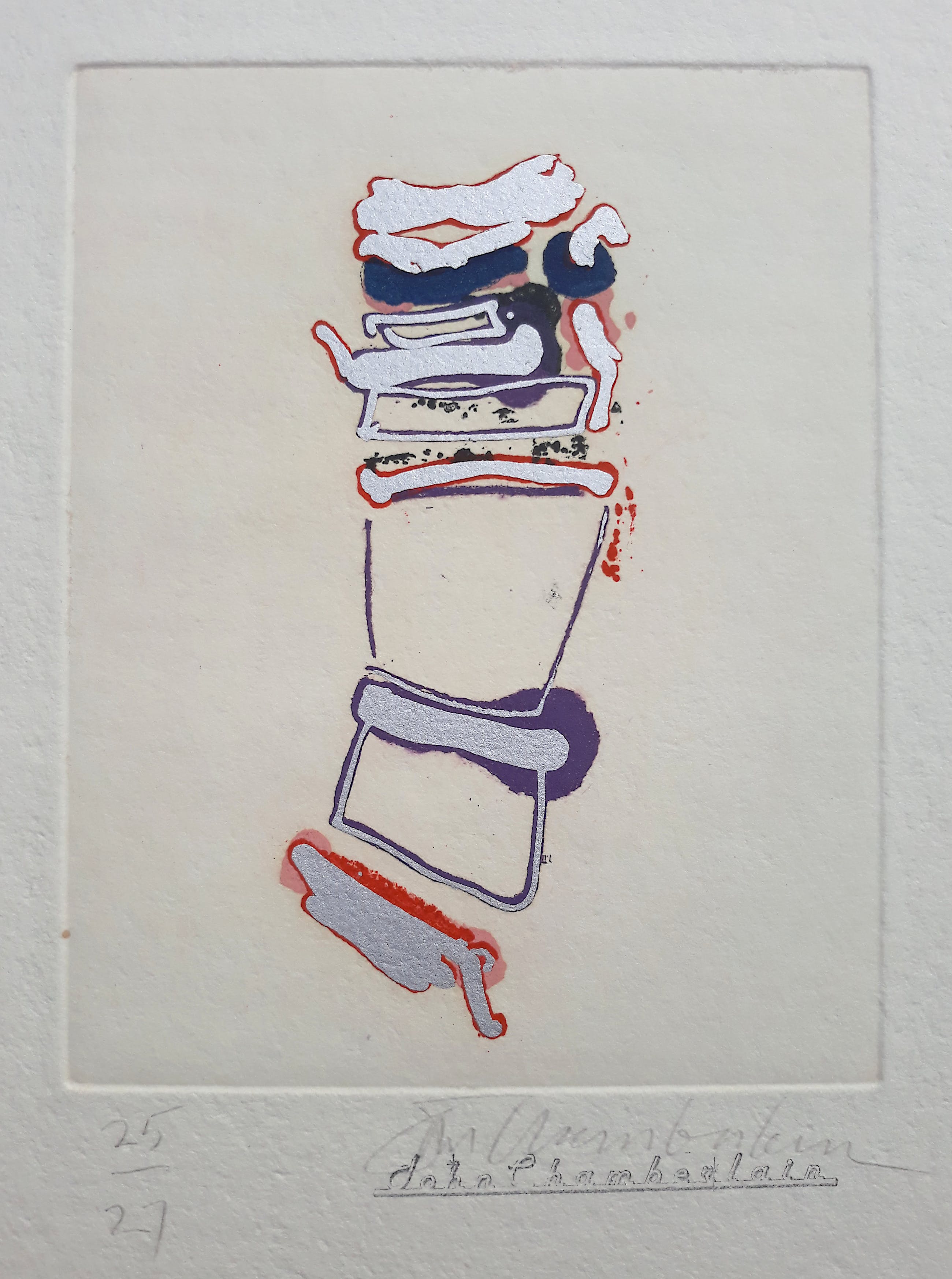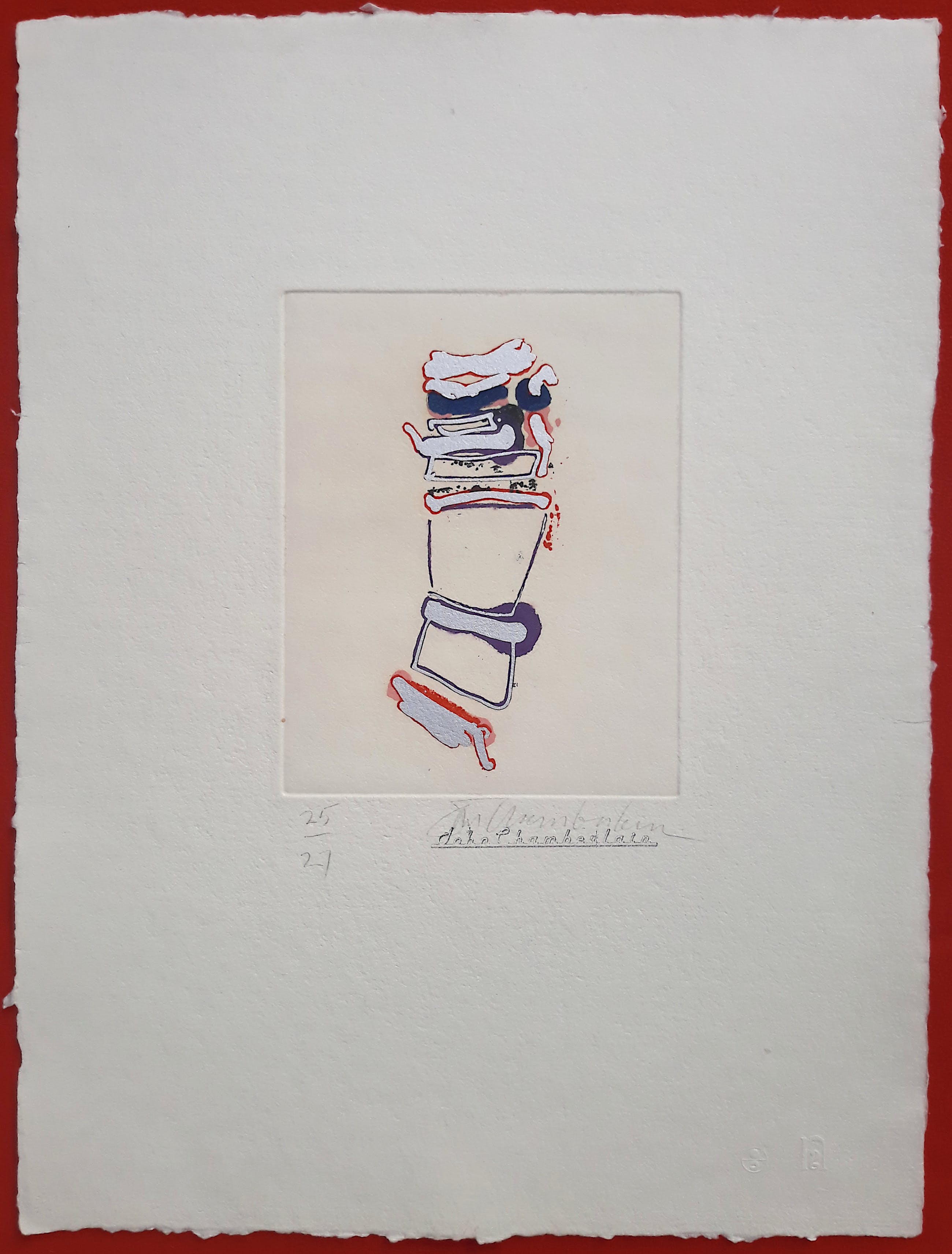 Zeer mooi, karakteristiek werk van deze bekende Amerikaanse kunstenaar, vooral bekend als beeldhouwer. Aquatint ets op dik gelegd papier, gesigneerd (en gestempeld) en genummerd (25/27) in potlood, met de blindstempel van de uitgever (Novak Graphics, Toronto, Canada), en op de achterzijde in inkt gestempeld door de uitgever. In zeer goede staat.