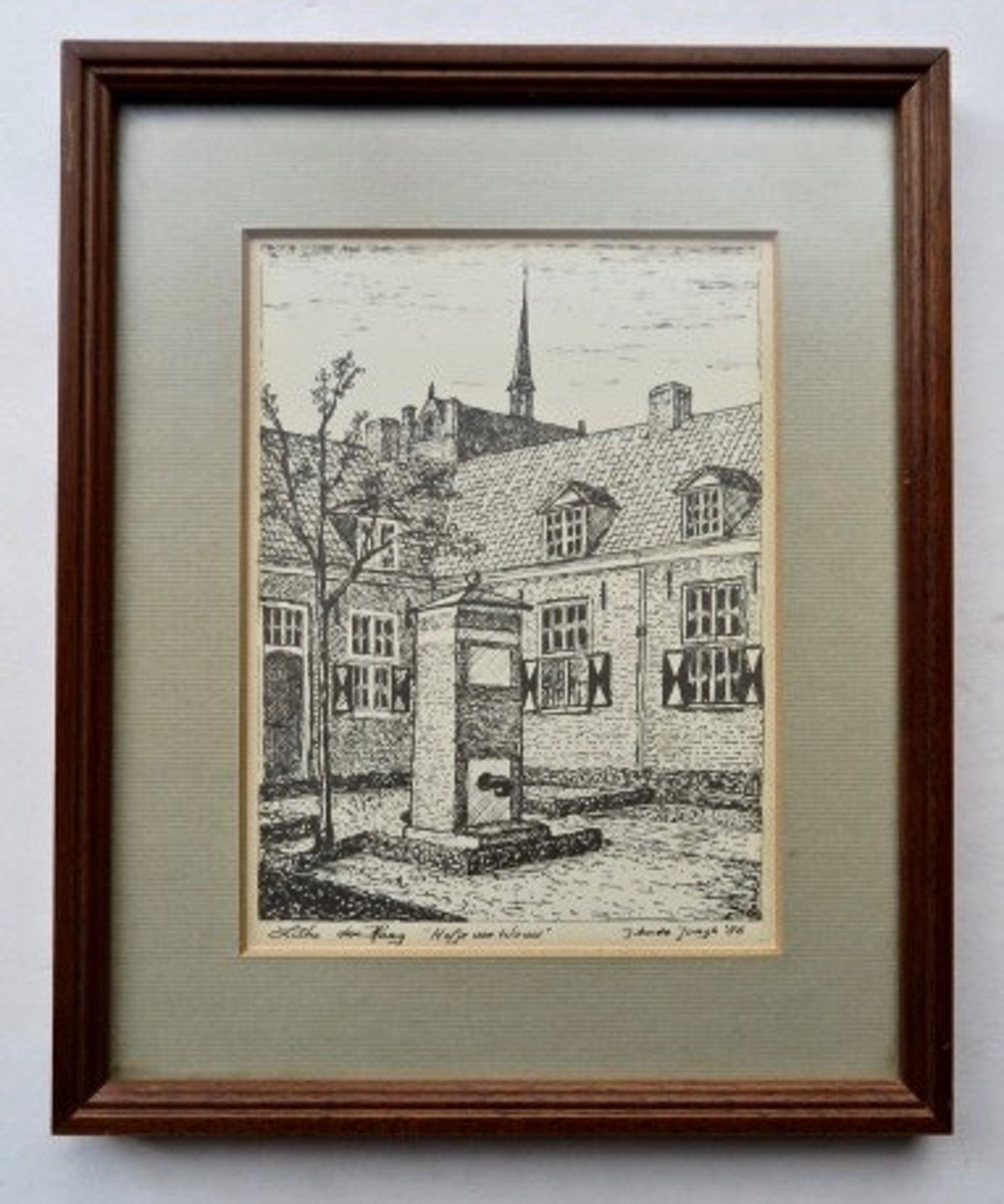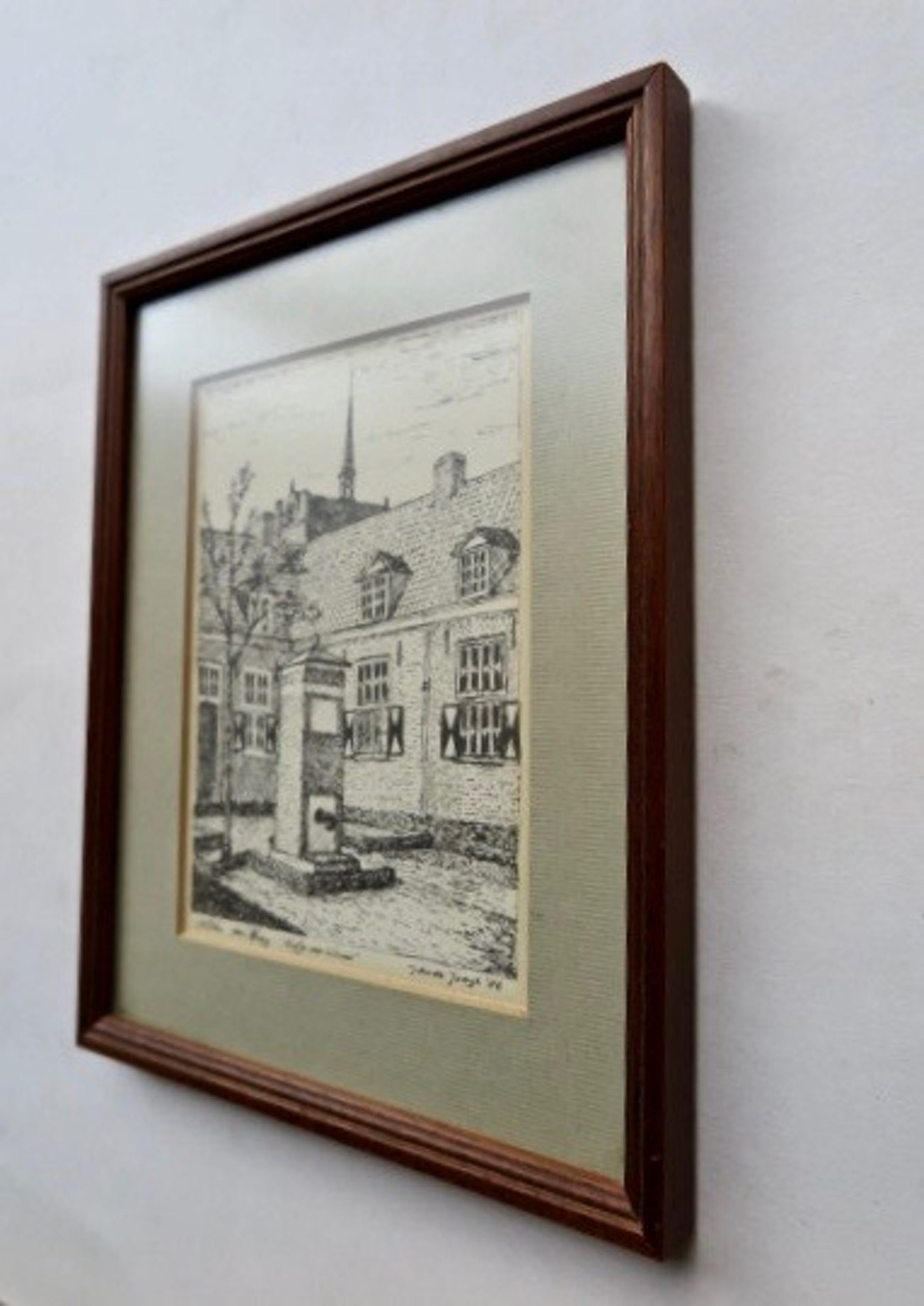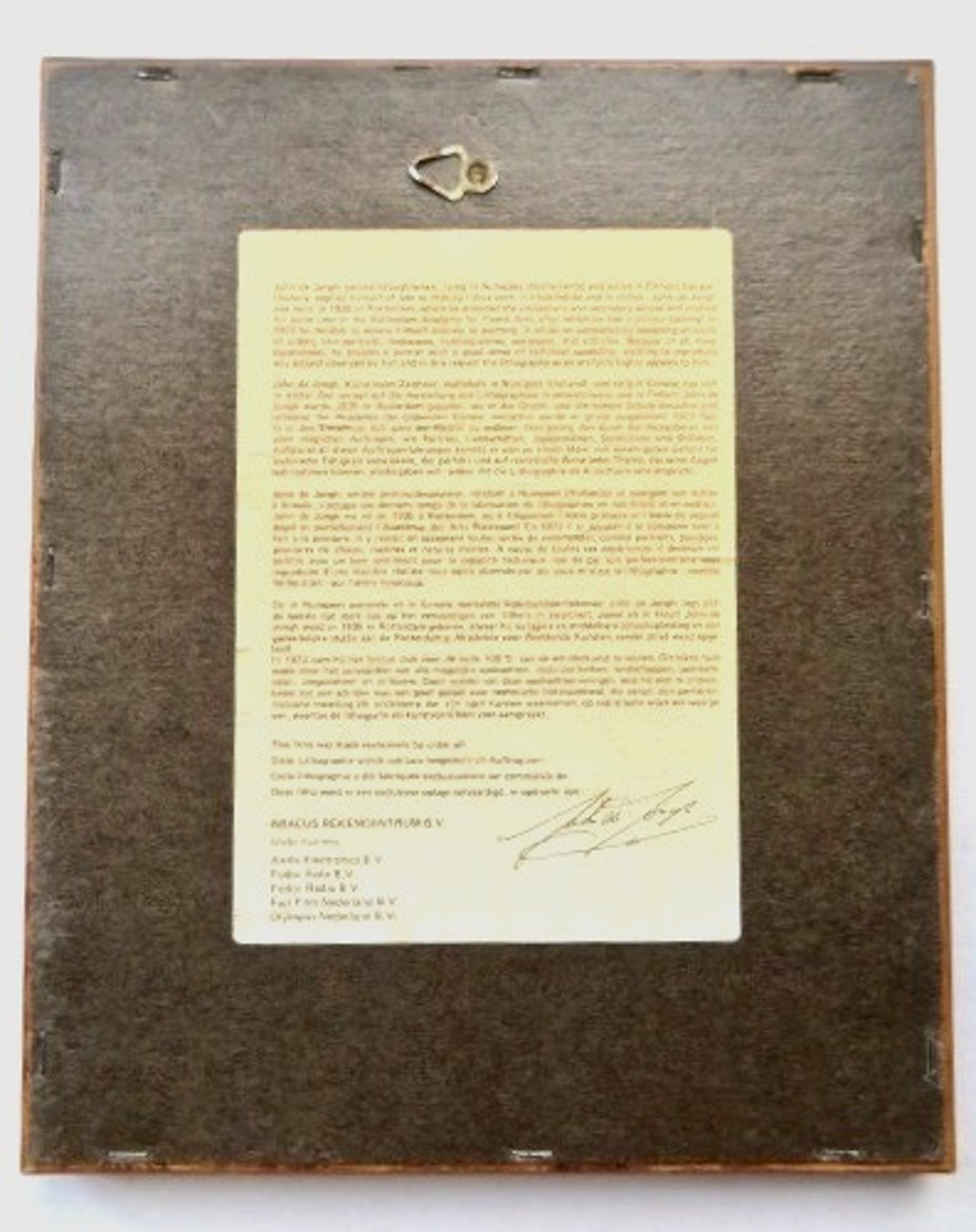 Mooie litho van het bekende Haagse Hofje. Achterop de lijsting staat informatie over deze litho en Kunstenaar. John de Jongh (1935, Rotterdam) werkte veel in opdracht, was gespecialiseerd in een realistische stijl en vervaardiging van litho's. Vermeld staat dat deze litho in een exclusieve oplage is vervaardigd in opdracht van Abacus Rekencentrum B.V. en partners.