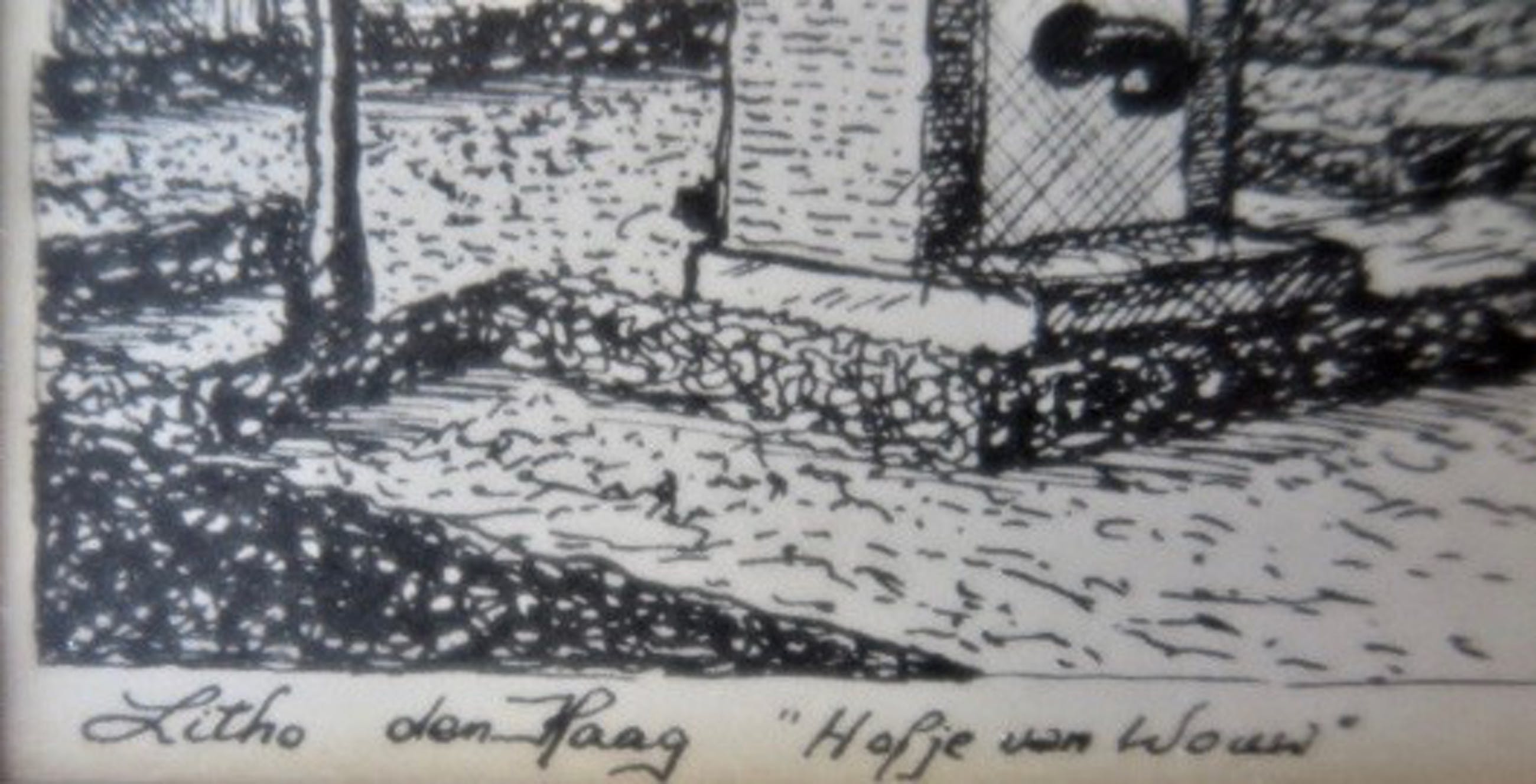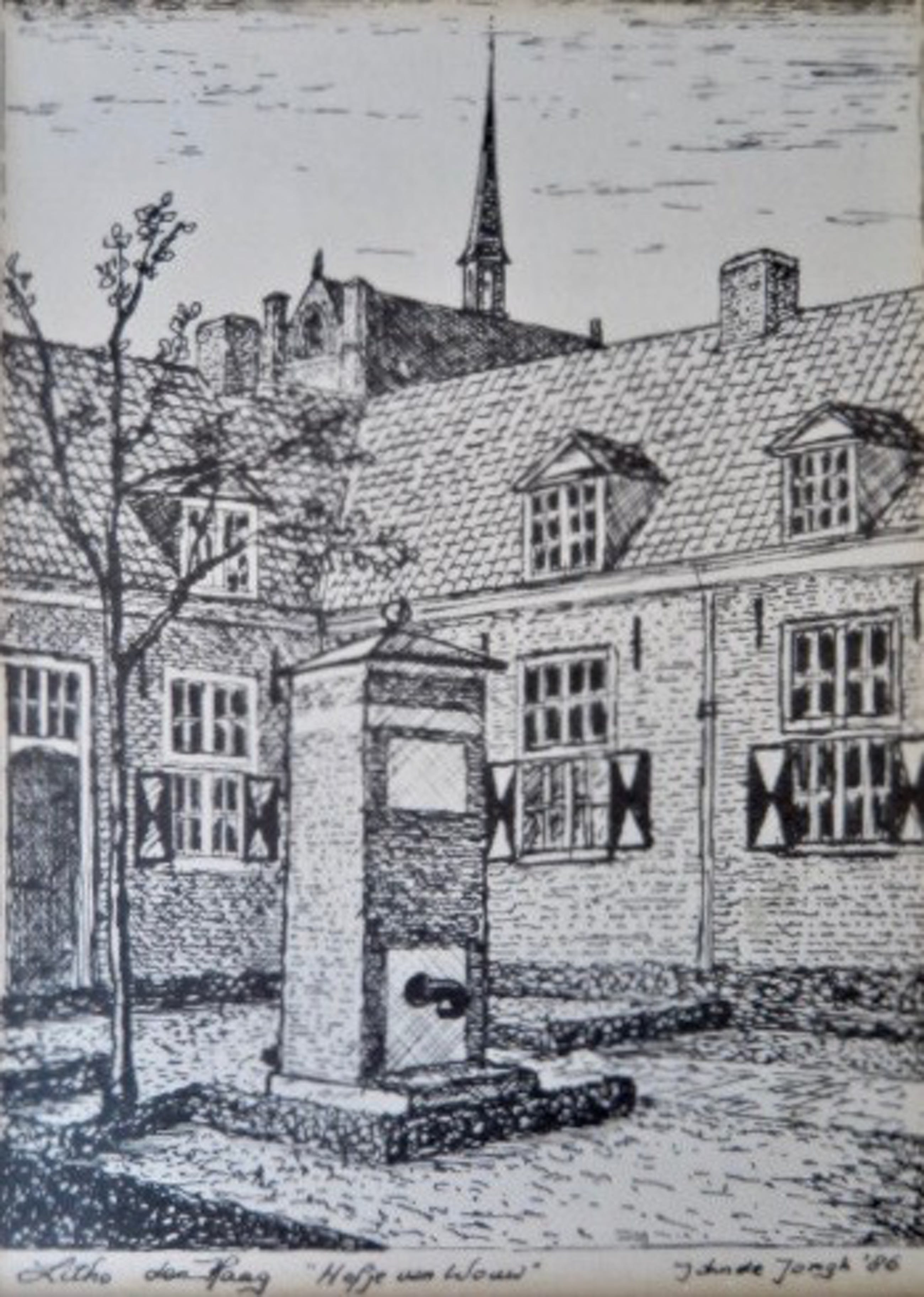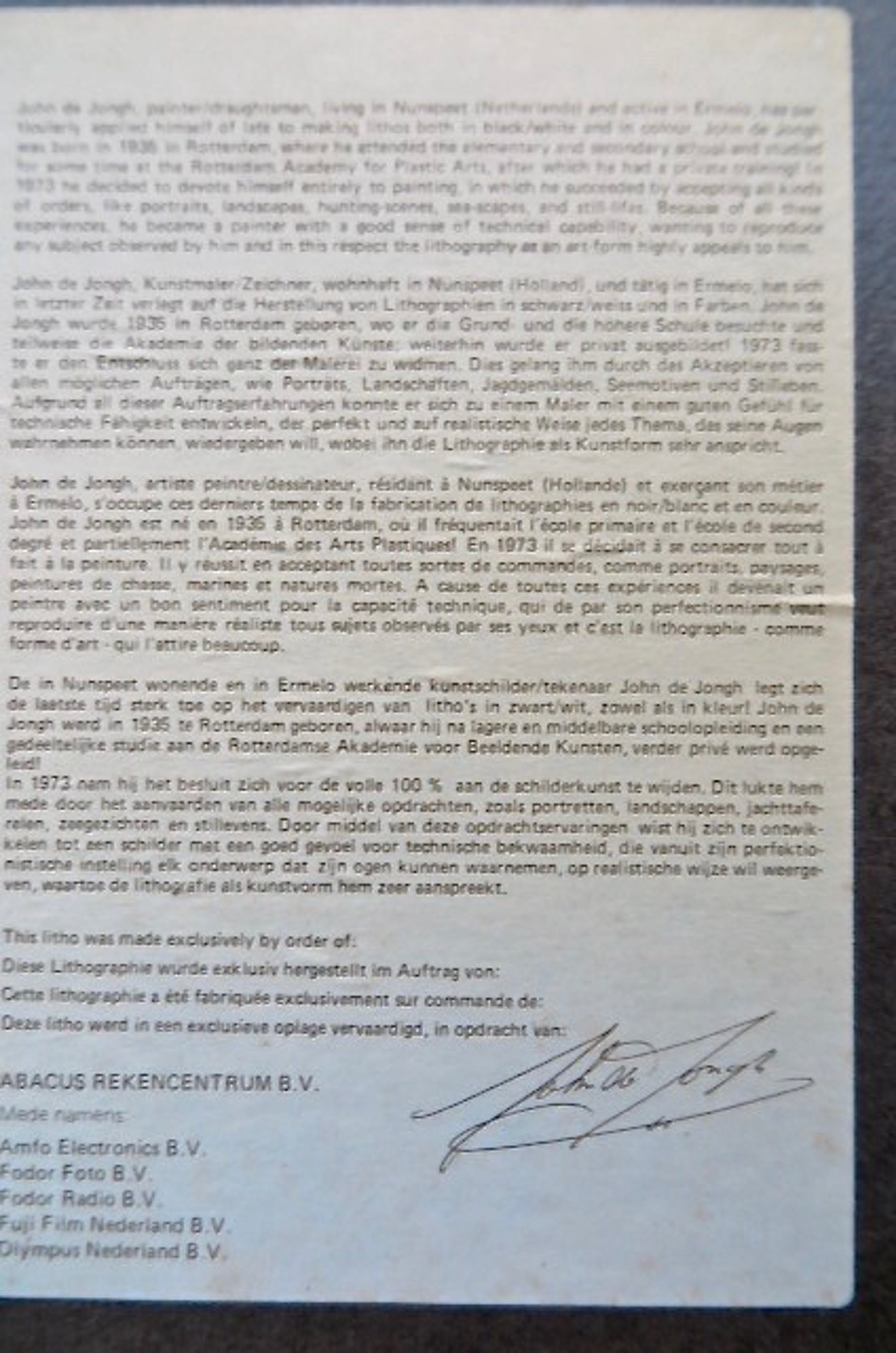 Mooie litho van het bekende Haagse Hofje. Achterop de lijsting staat informatie over deze litho en Kunstenaar. John de Jongh (1935, Rotterdam) werkte veel in opdracht, was gespecialiseerd in een realistische stijl en vervaardiging van litho's. Vermeld staat dat deze litho in een exclusieve oplage is vervaardigd in opdracht van Abacus Rekencentrum B.V. en partners.