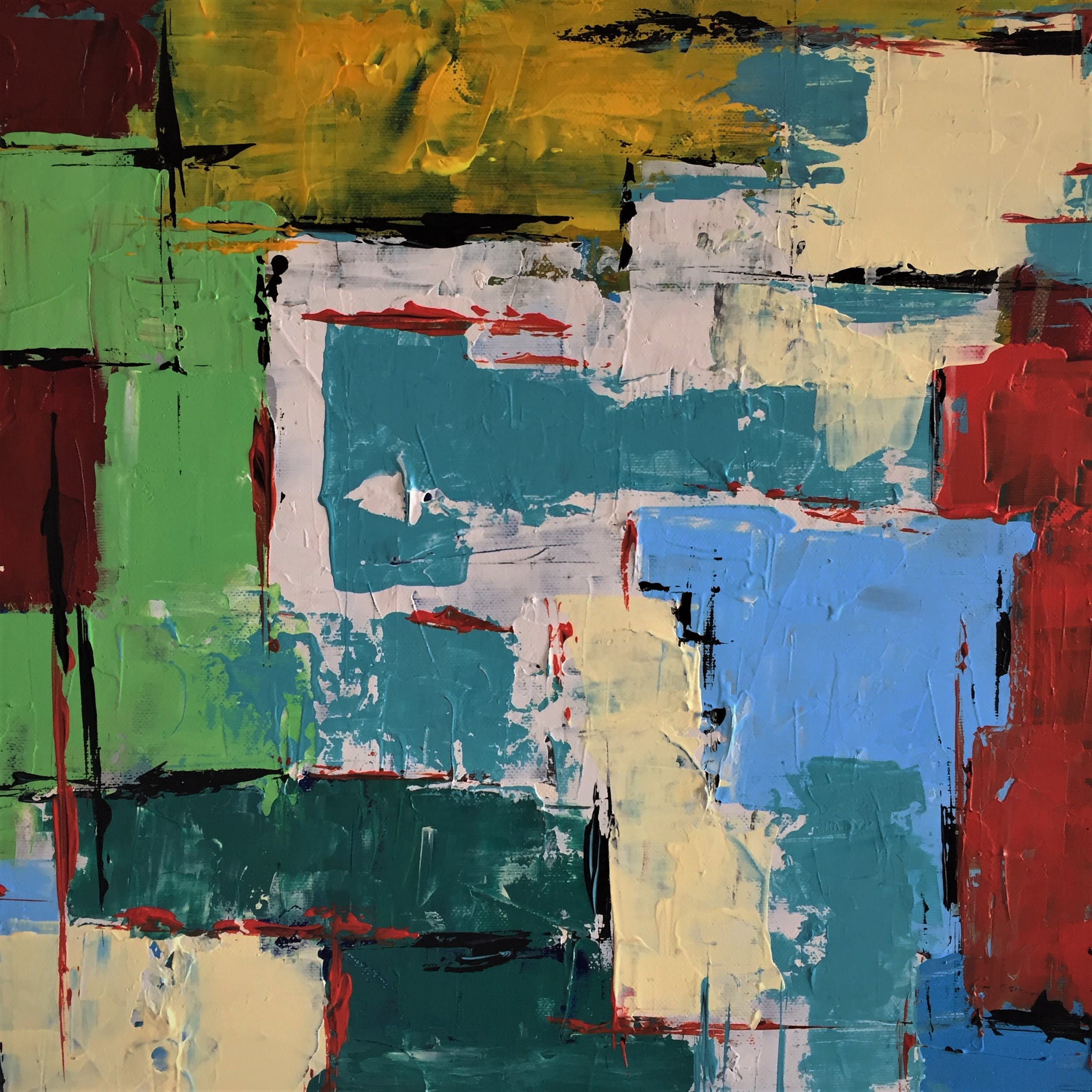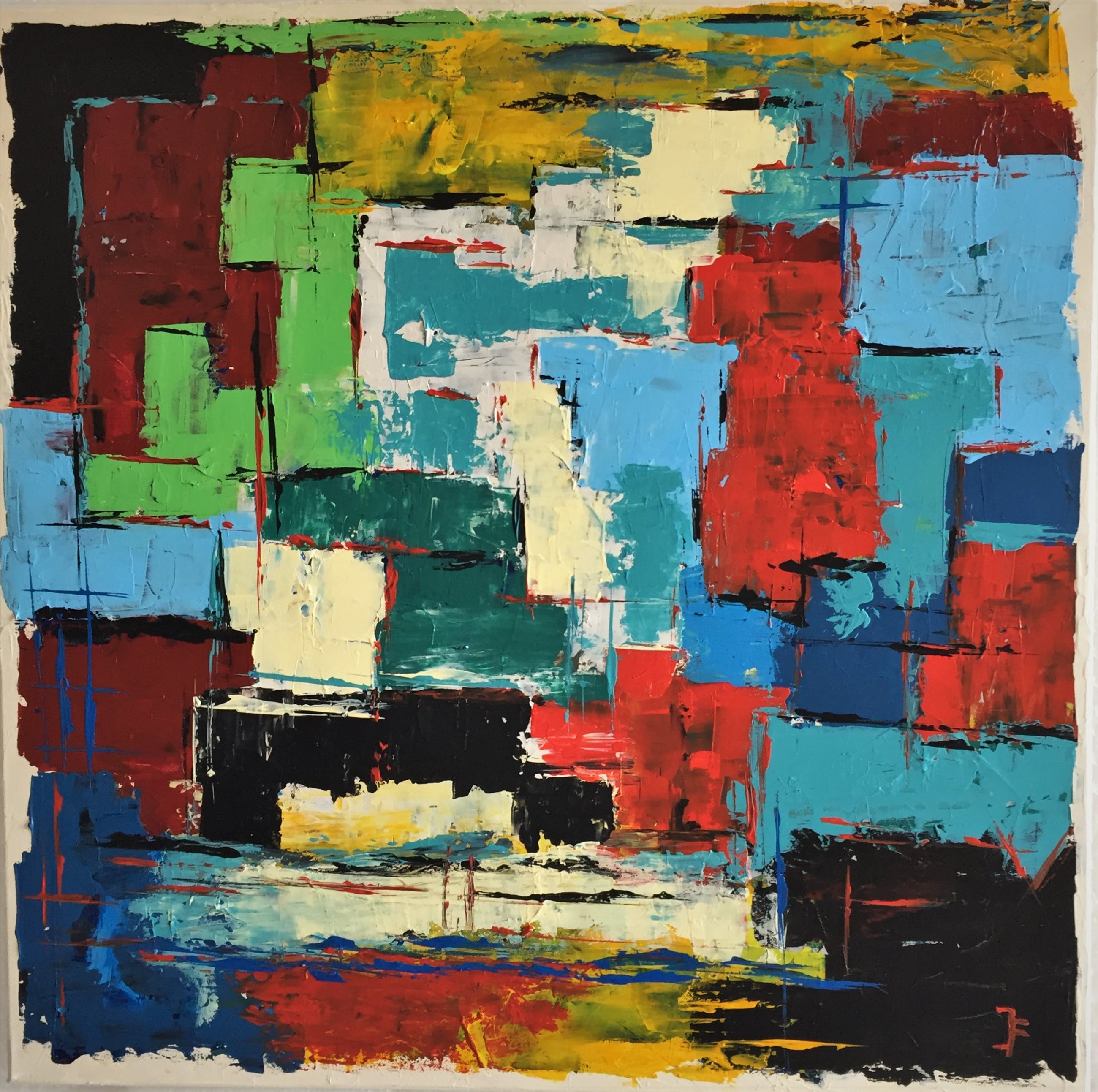 Reliëf ontstaan door de verf, acrylverf, laag over laag aan te brengen. De zijkanten, 2cm dik, zijn in het schilderij meegenomen, door deze afwerking is een lijst overbodig