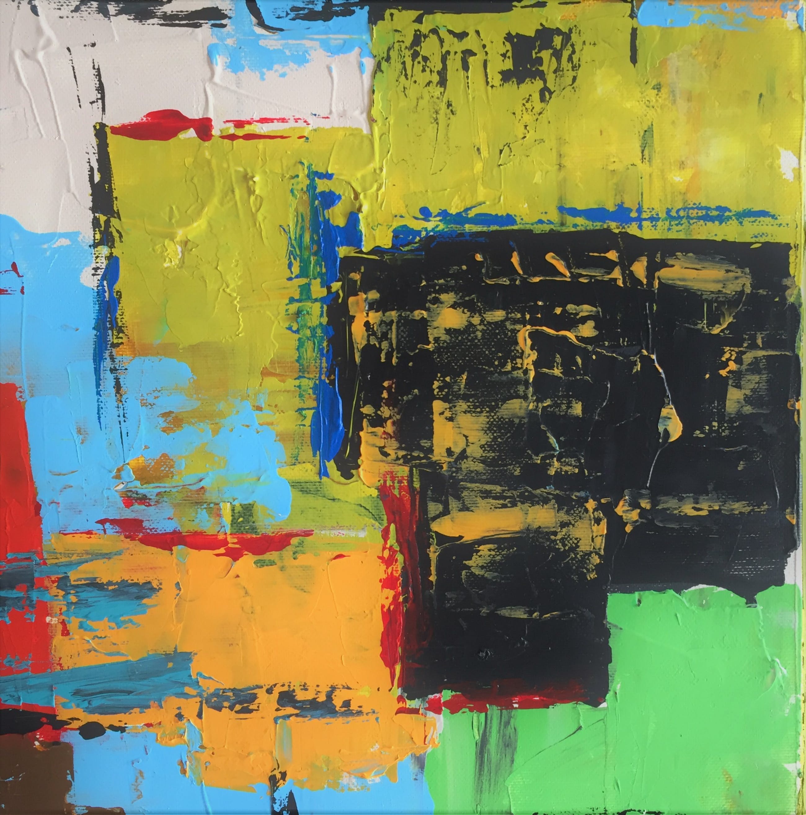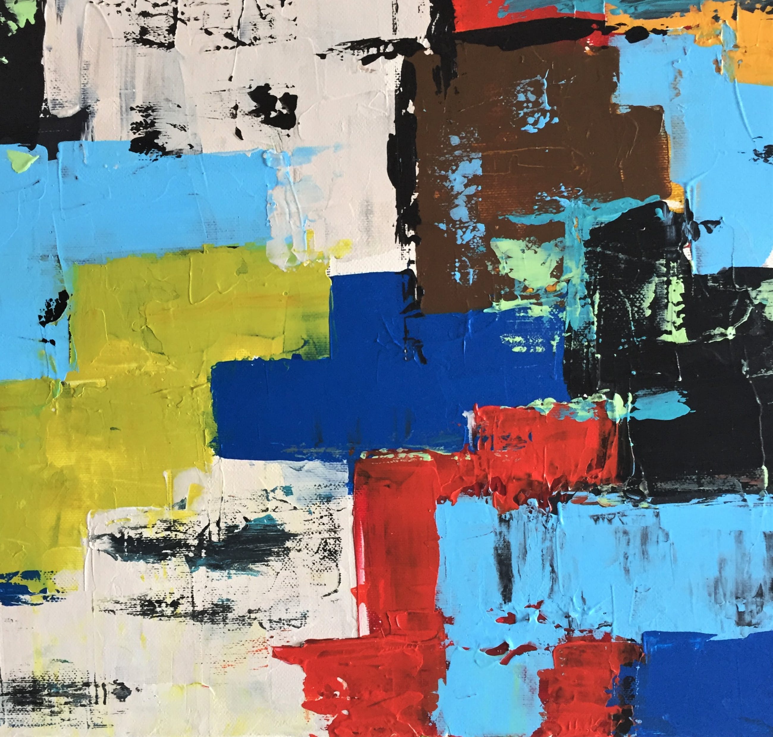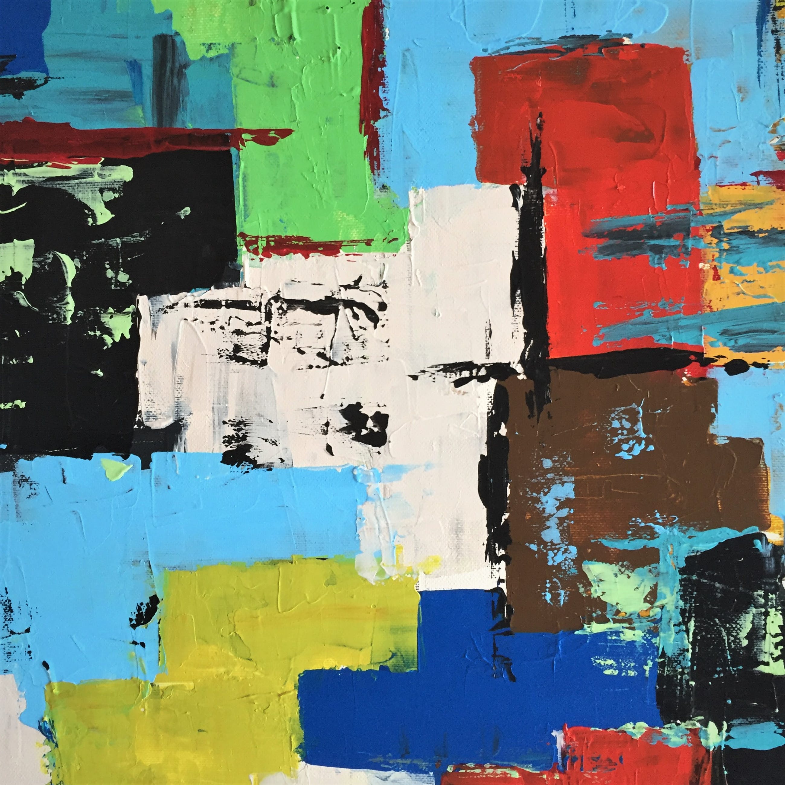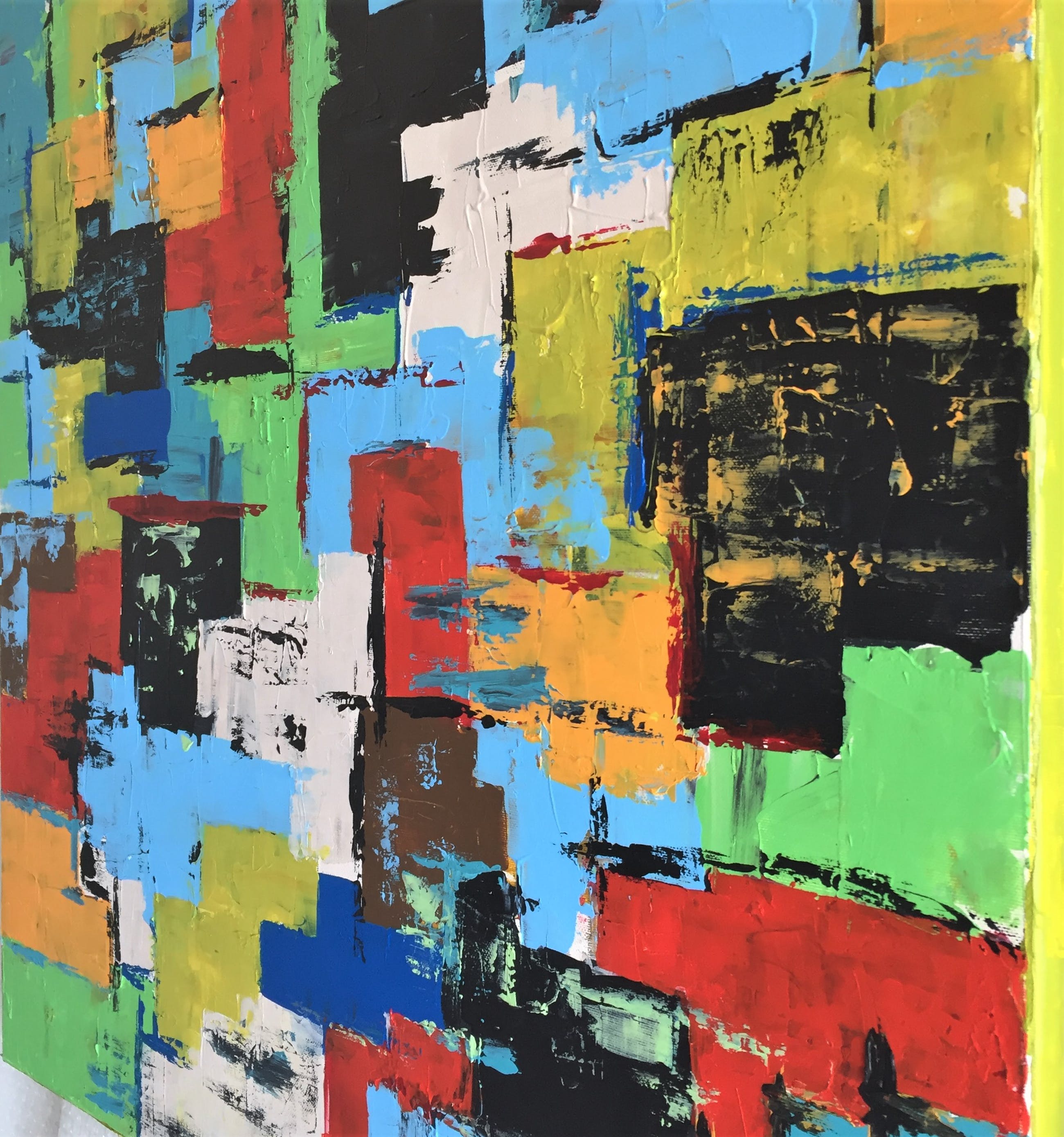 Reliëf ontstaan door de verf, acrylverf, laag over laag aan te brengen. De zijkanten, 2cm dik, zijn in het schilderij meegenomen, door deze afwerking is een lijst overbodig