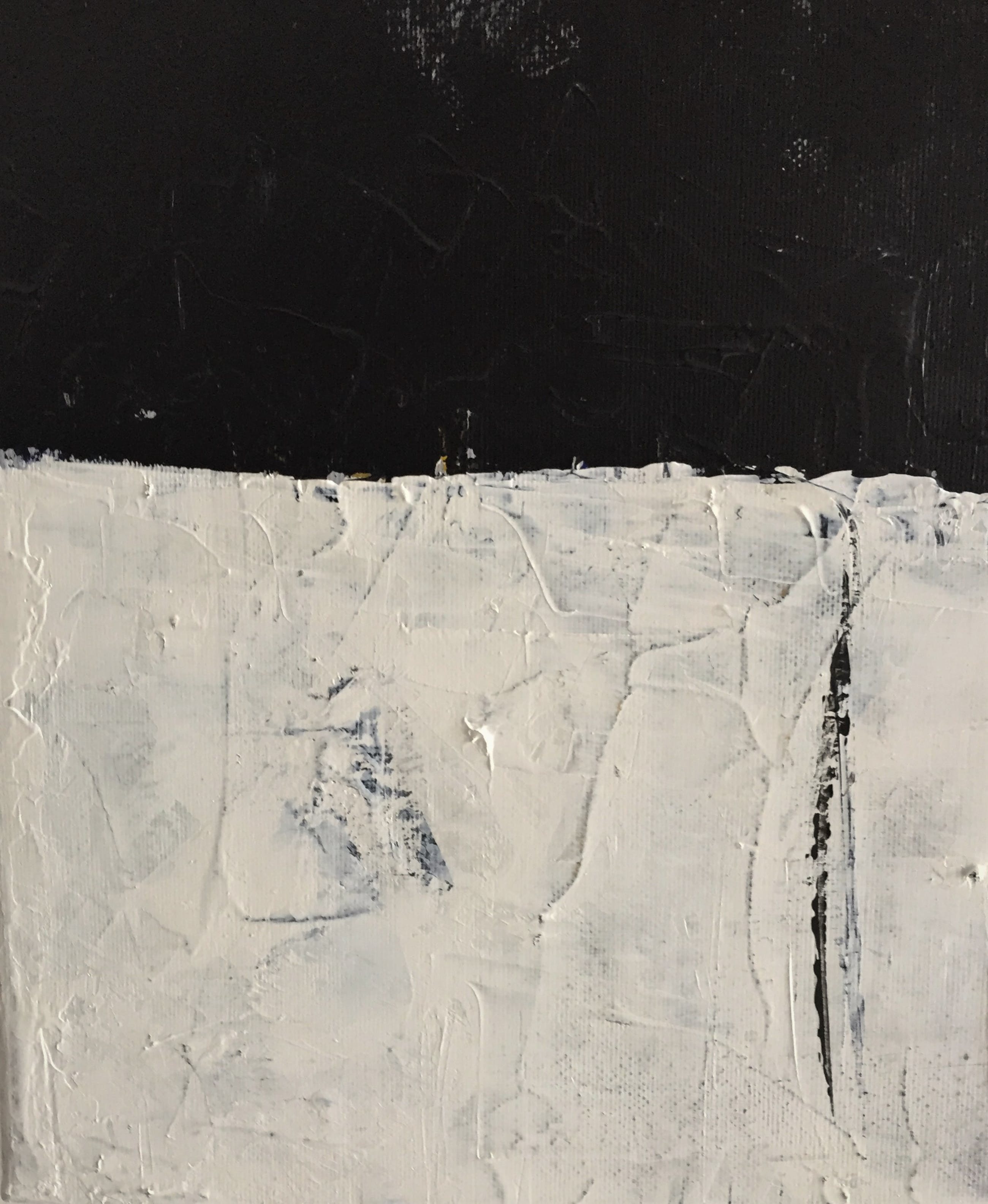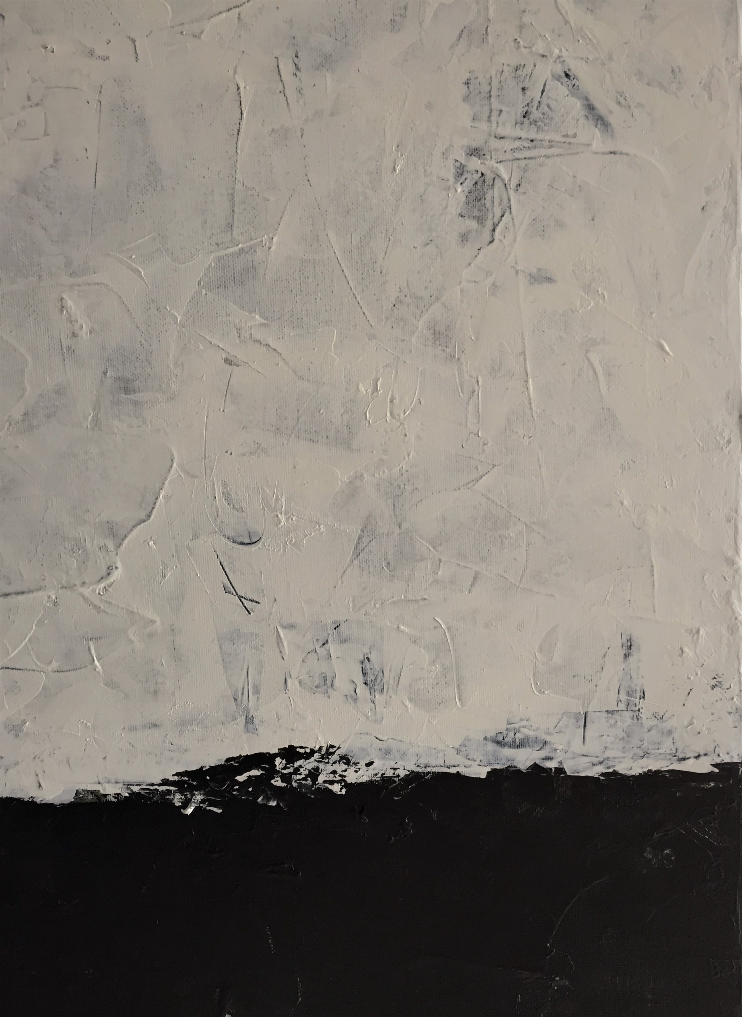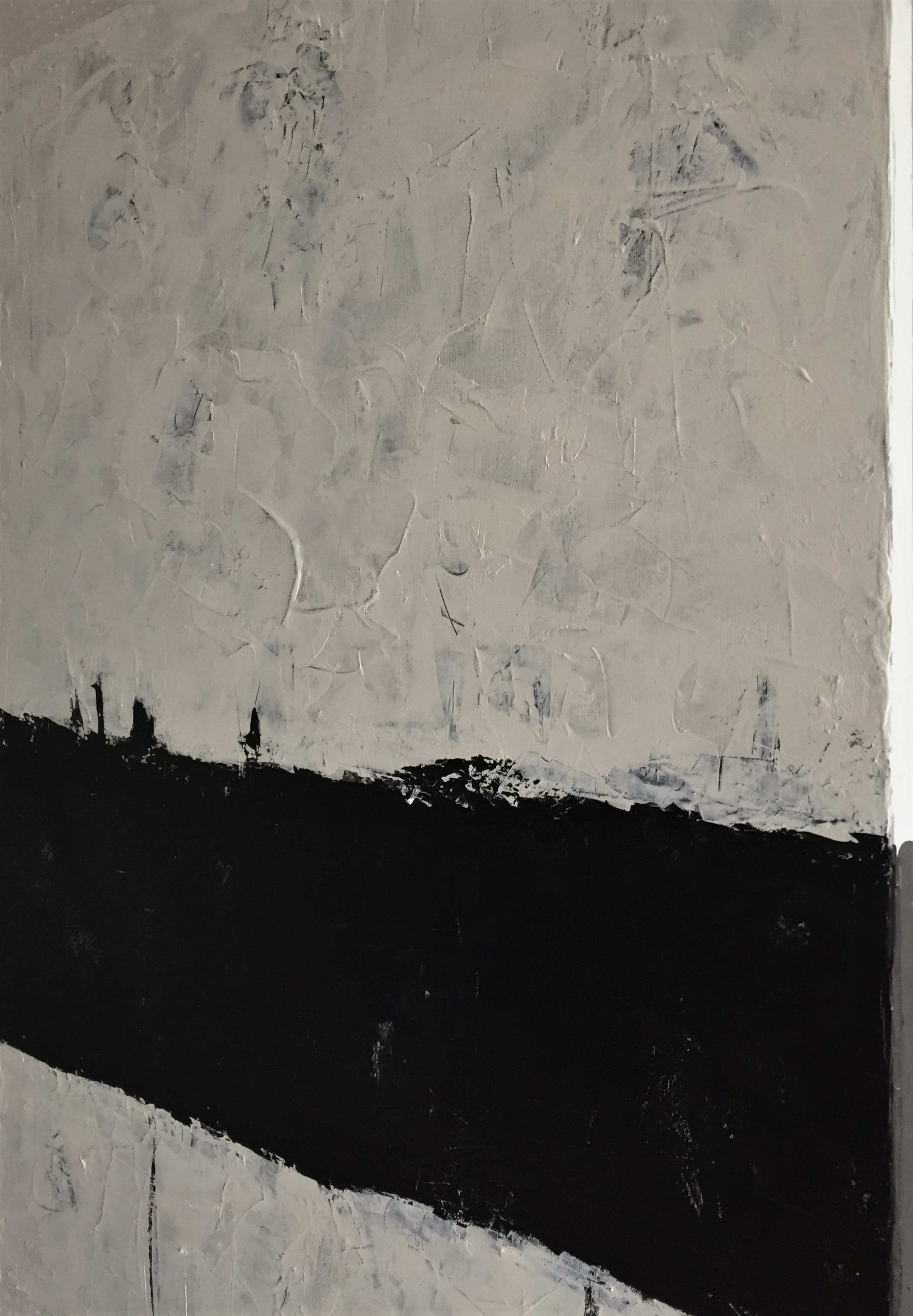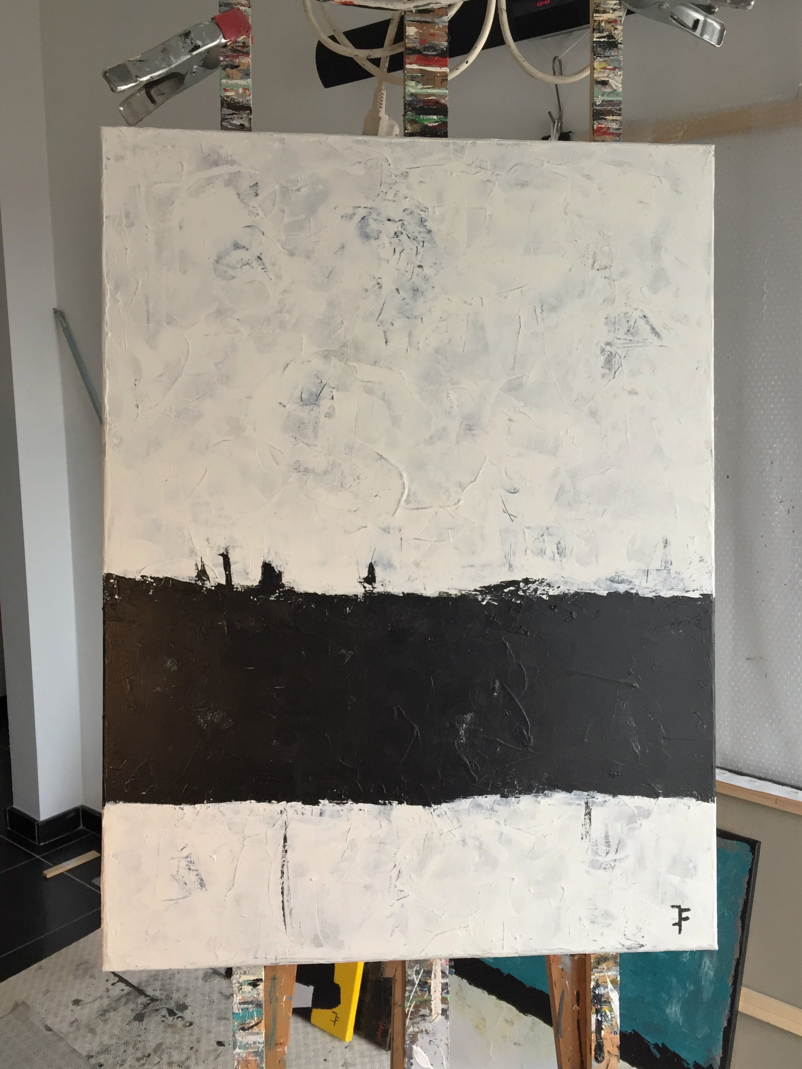 Reliëf ontstaan door de verf, acrylverf, laag over laag aan te brengen. De zijkanten, 2cm dik, zijn in het schilderij meegenomen, door deze afwerking is een lijst overbodig