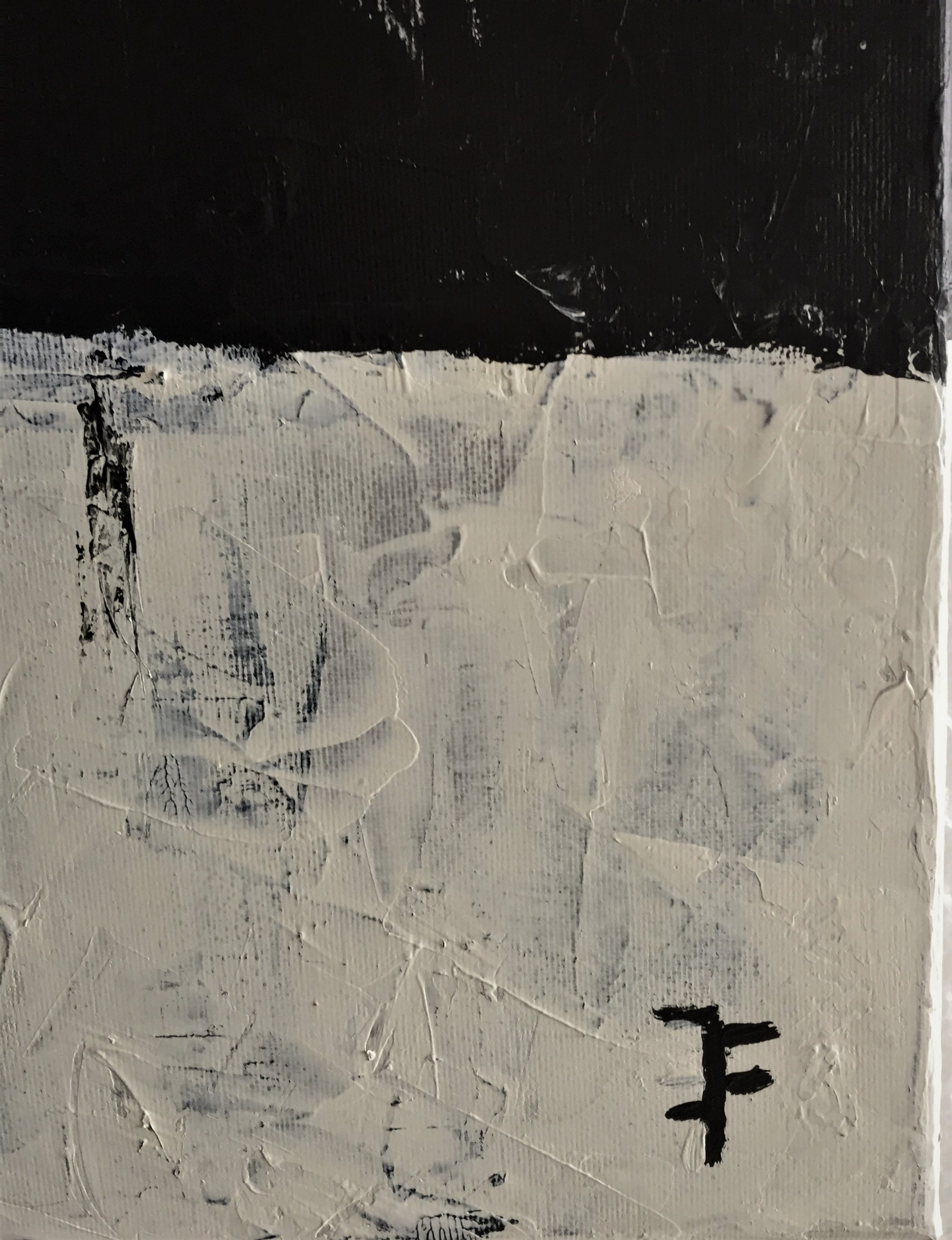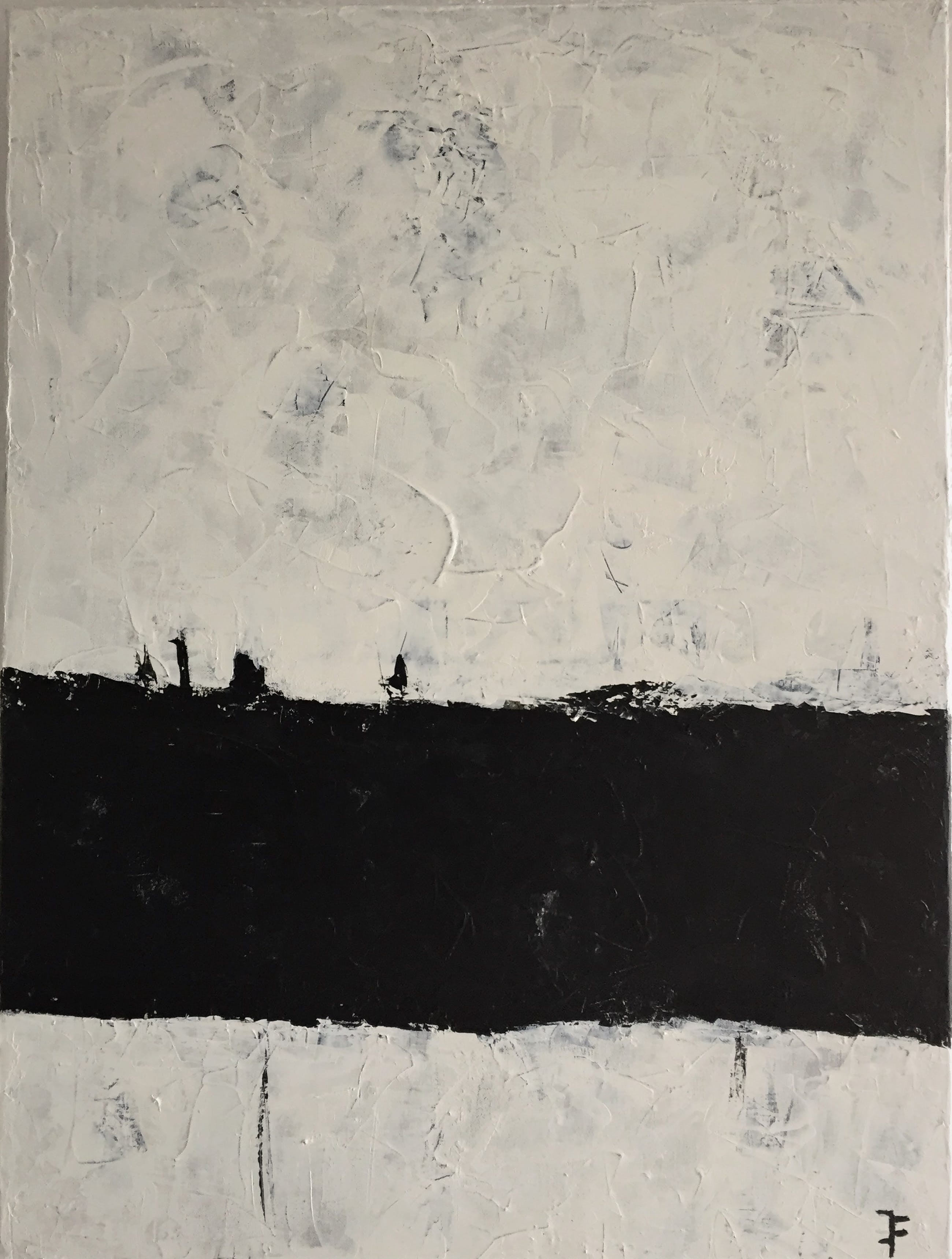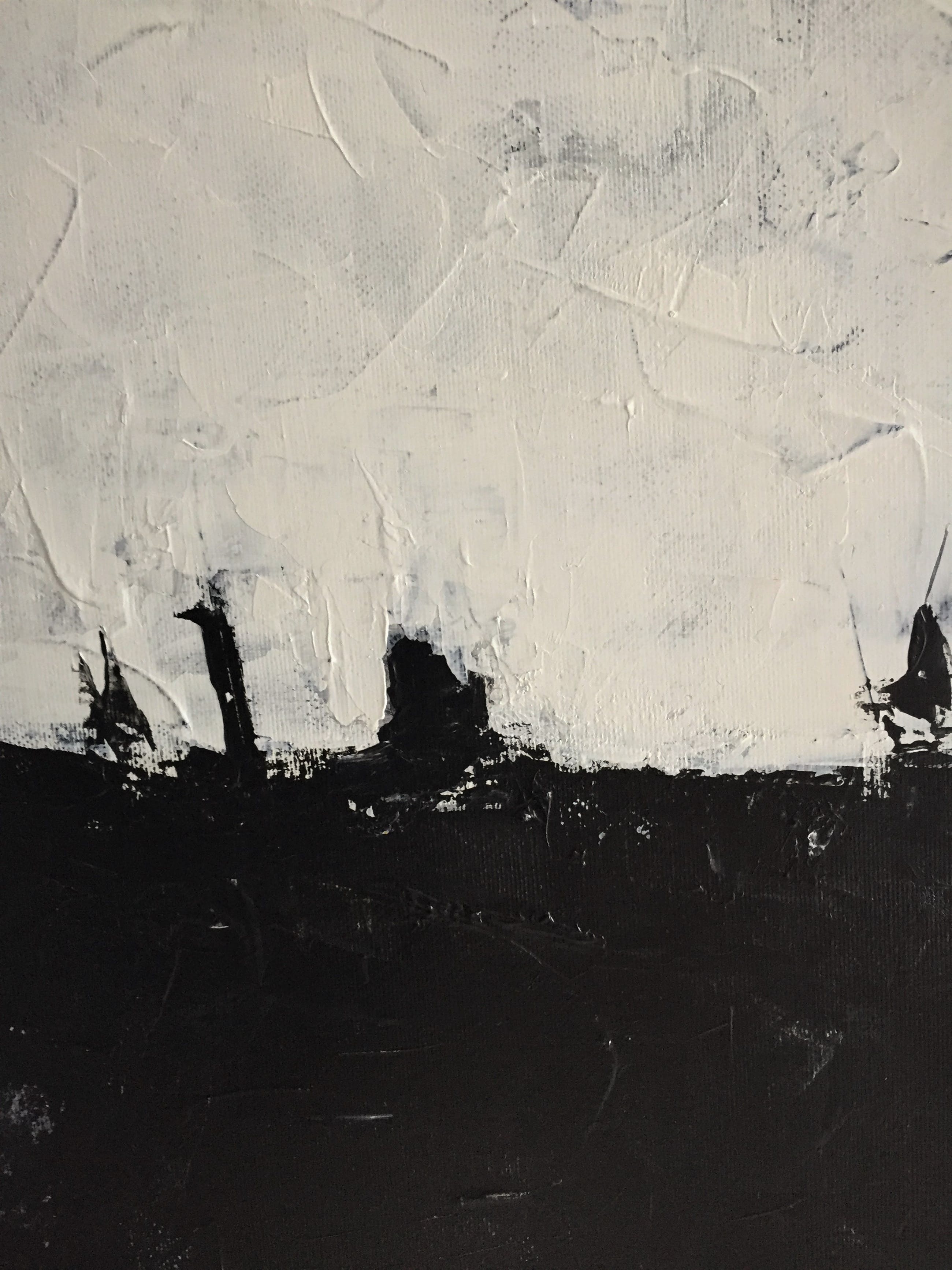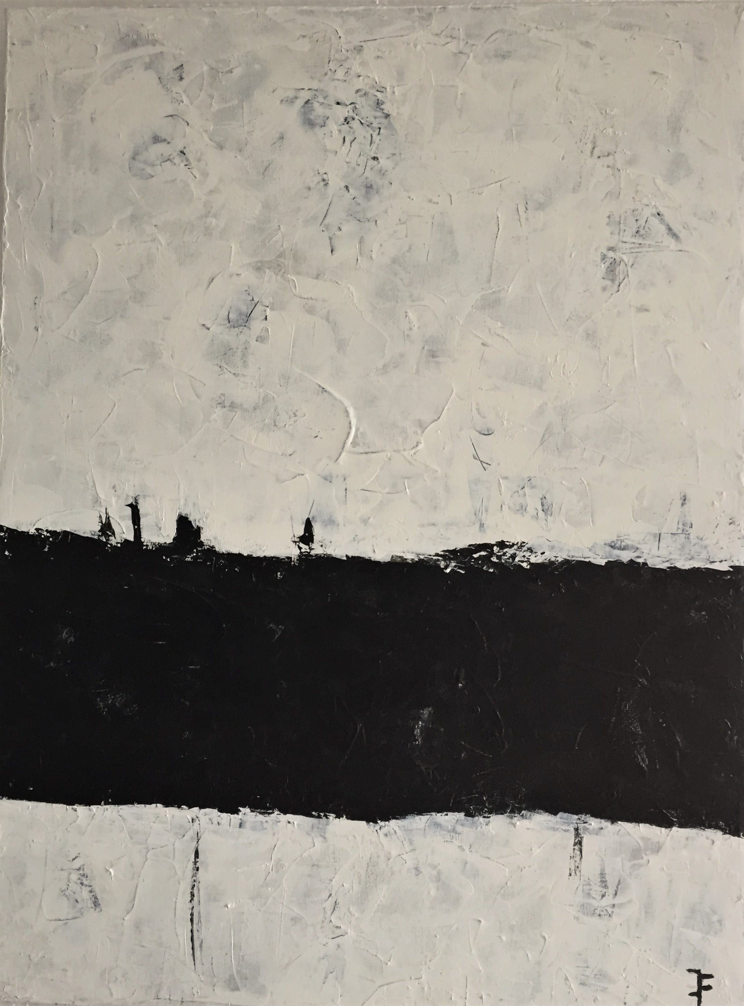 Reliëf ontstaan door de verf, acrylverf, laag over laag aan te brengen. De zijkanten, 2cm dik, zijn in het schilderij meegenomen, door deze afwerking is een lijst overbodig