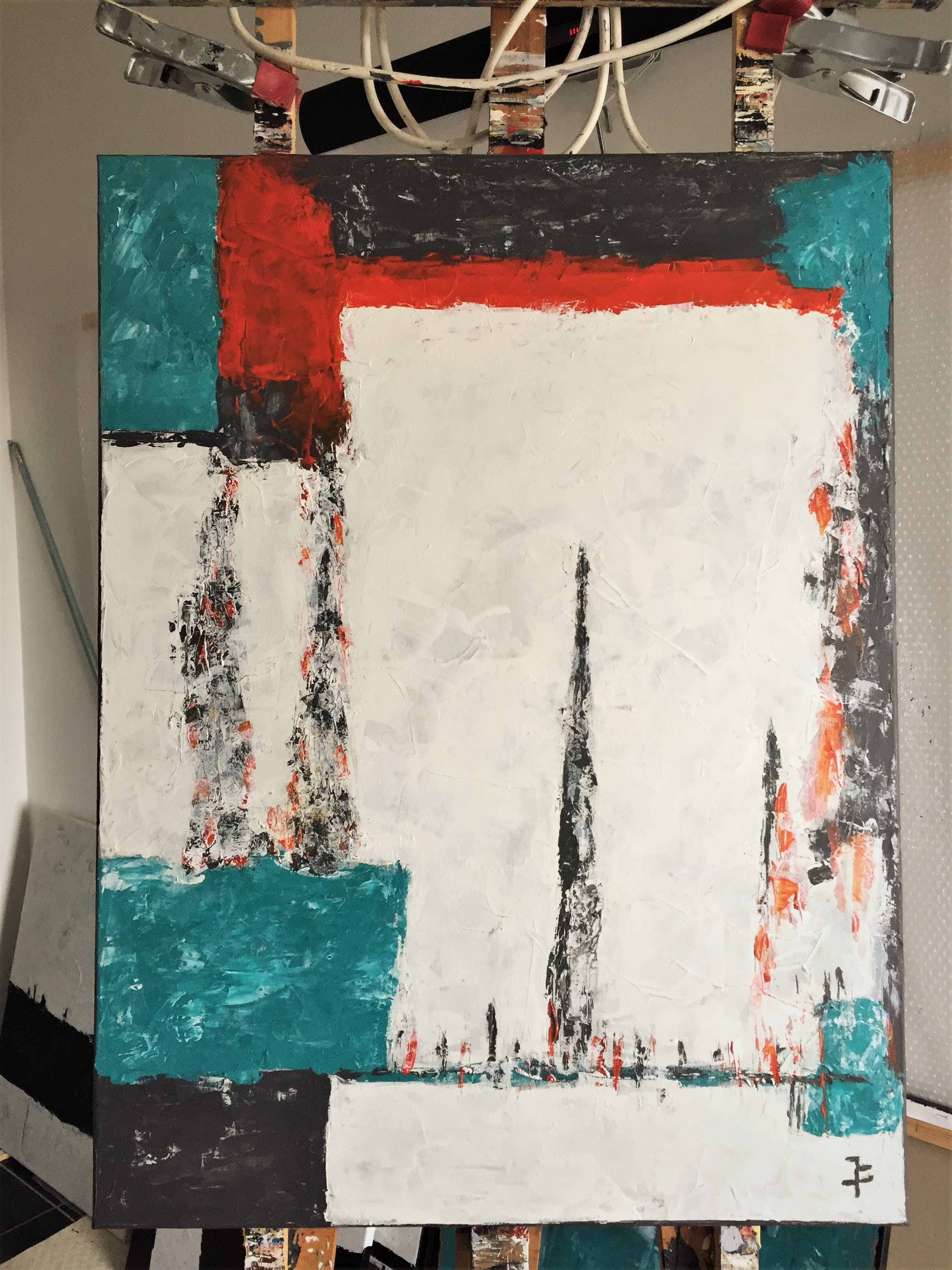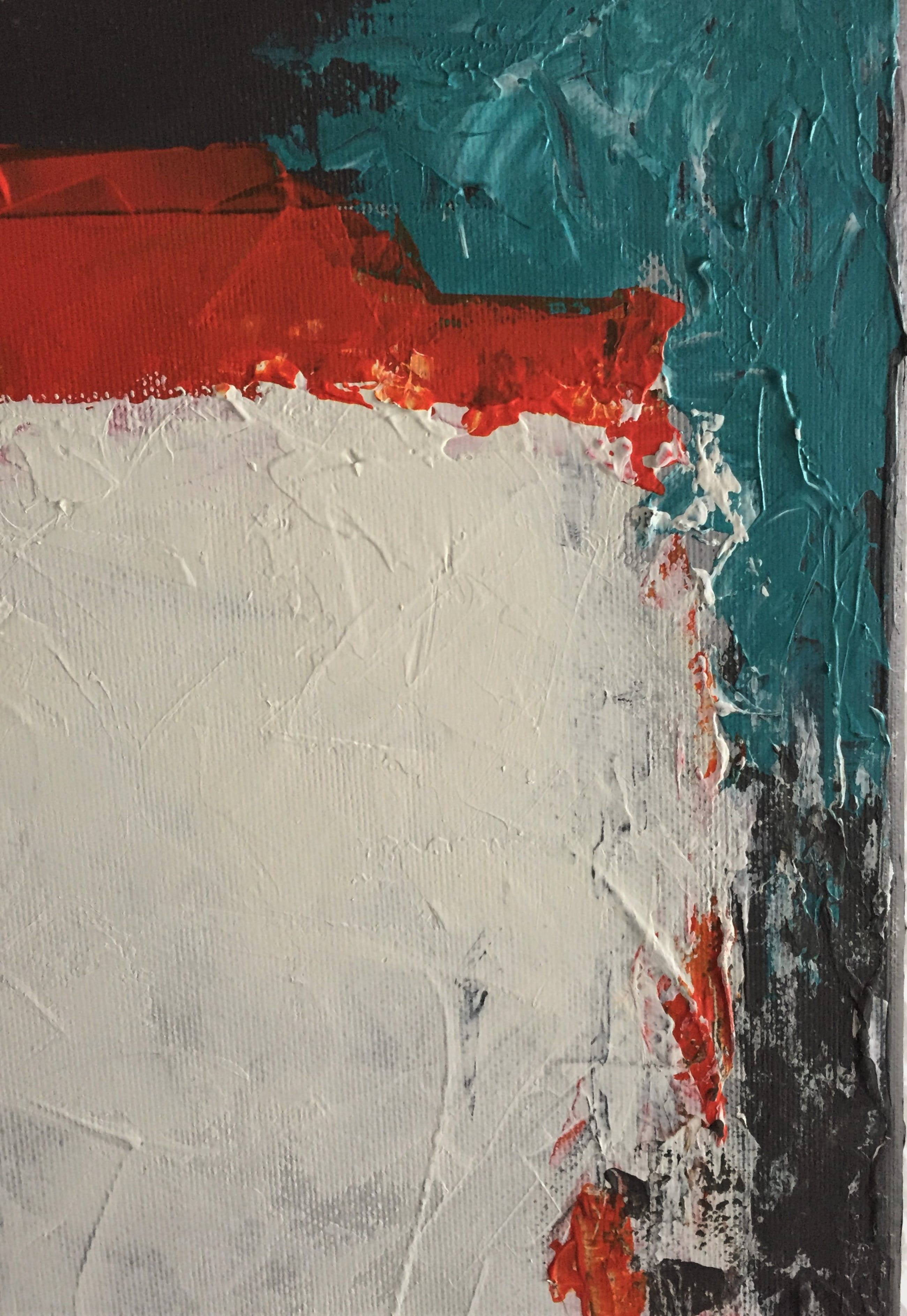 Reliëf ontstaan door de verf, acrylverf, laag over laag aan te brengen. De zijkanten, 2cm dik, zijn in het schilderij meegenomen, door deze afwerking is een lijst overbodig