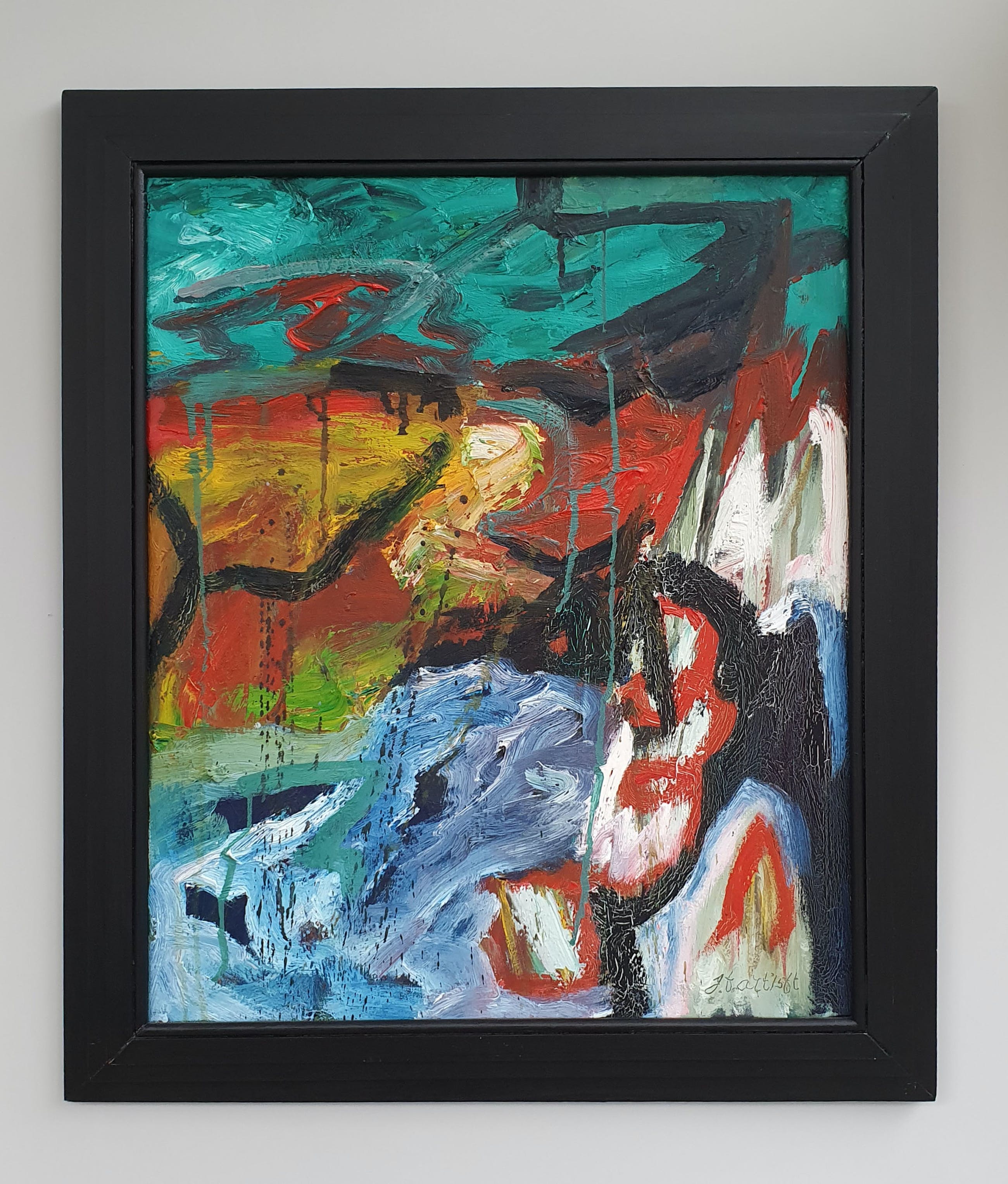 Het werk is voorzien van een door kunstenaar gemaakte houten lijst.