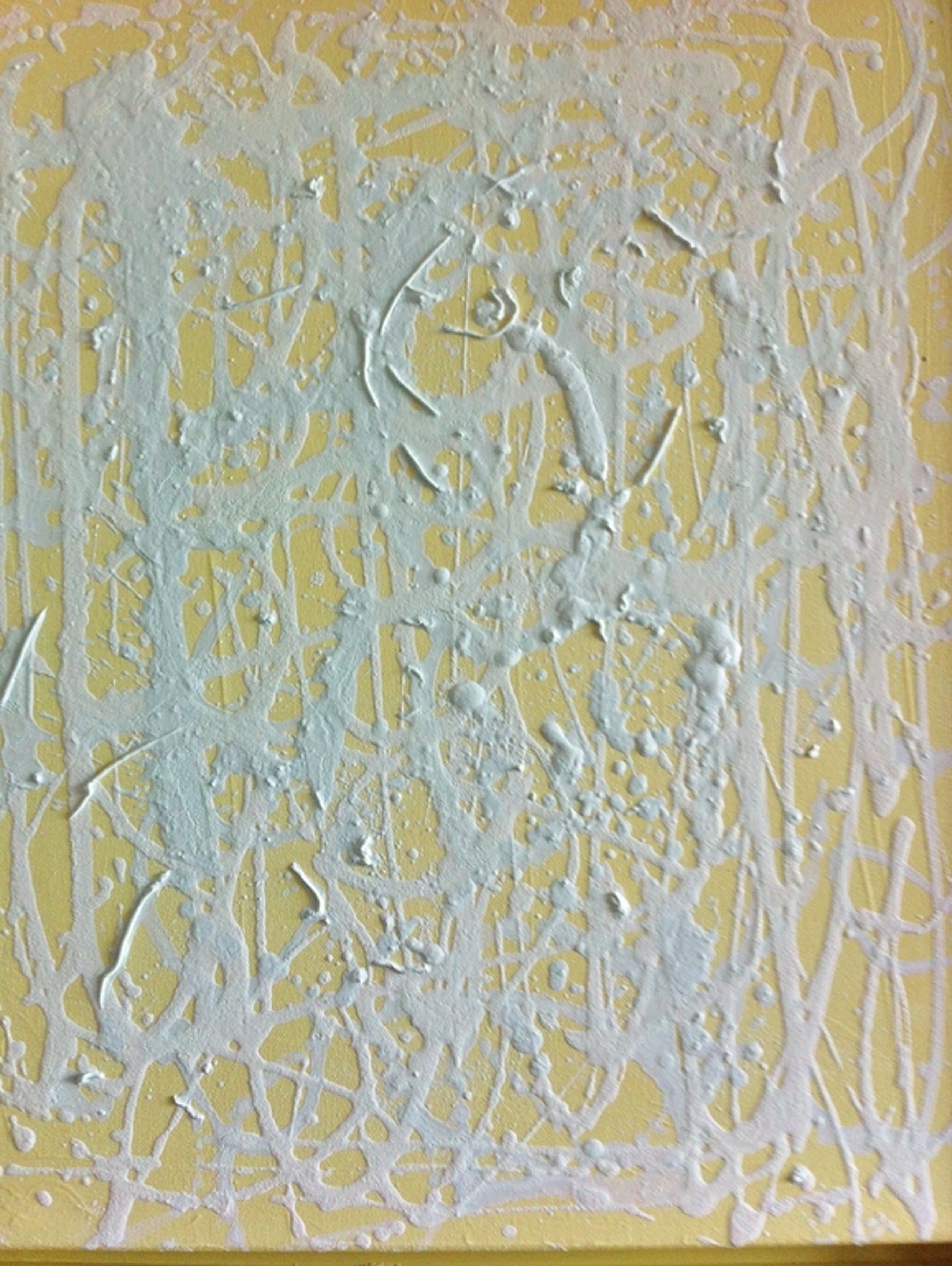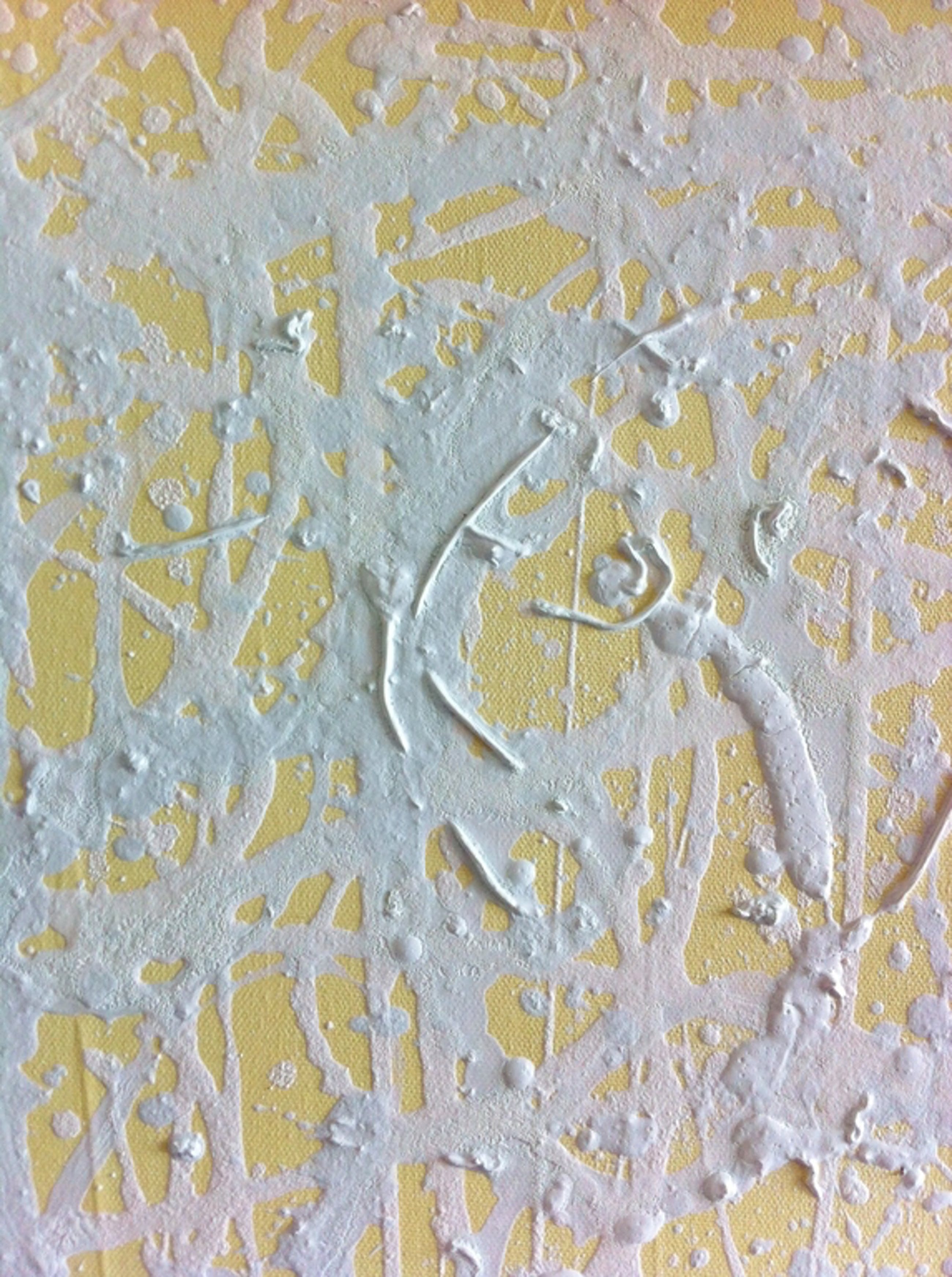 Techniek: Olieverf met meerdere lagen over elkaar aangebracht afgewerkt met druppel techniek, ook in olieverf.