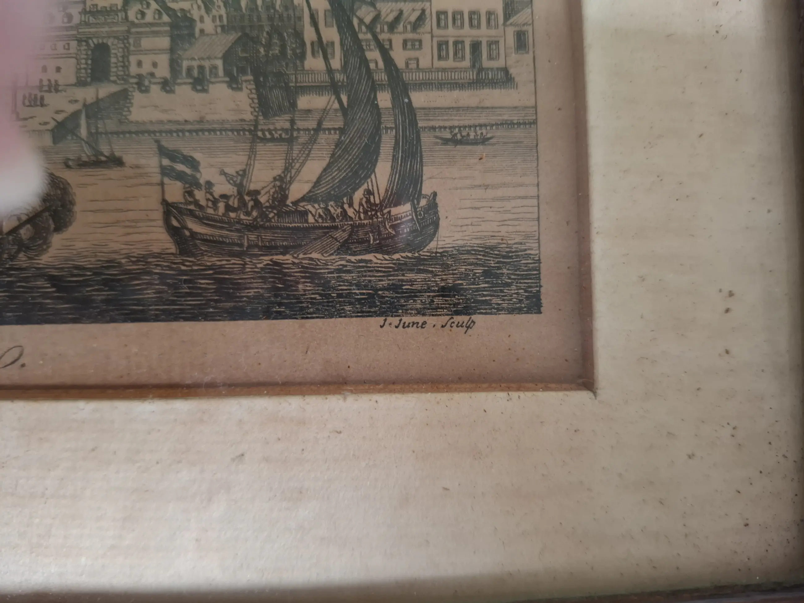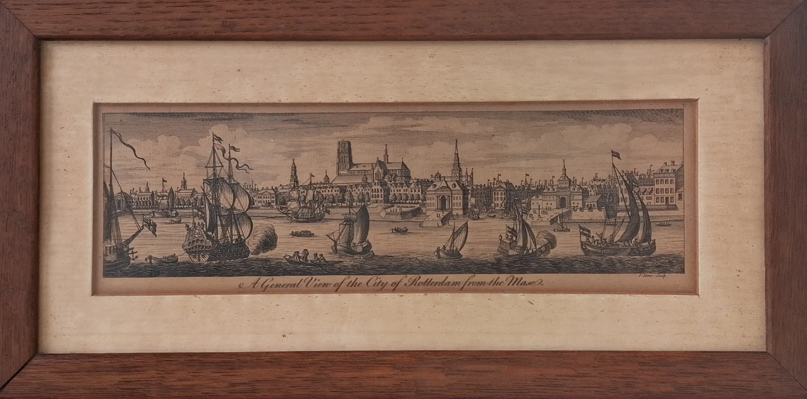 een prachtige unieke prent van Rotterdam gezien vanaf de maas in mooie lijst. Op de achterzijde is te lezen dat dit een beeld is zoals Rotterdam eruit zag 1ste helft 18de eeuw. Gekocht bij Leo Bisterbosch te Amsterdam. Ik weet niet wanneer deze gemaakt is