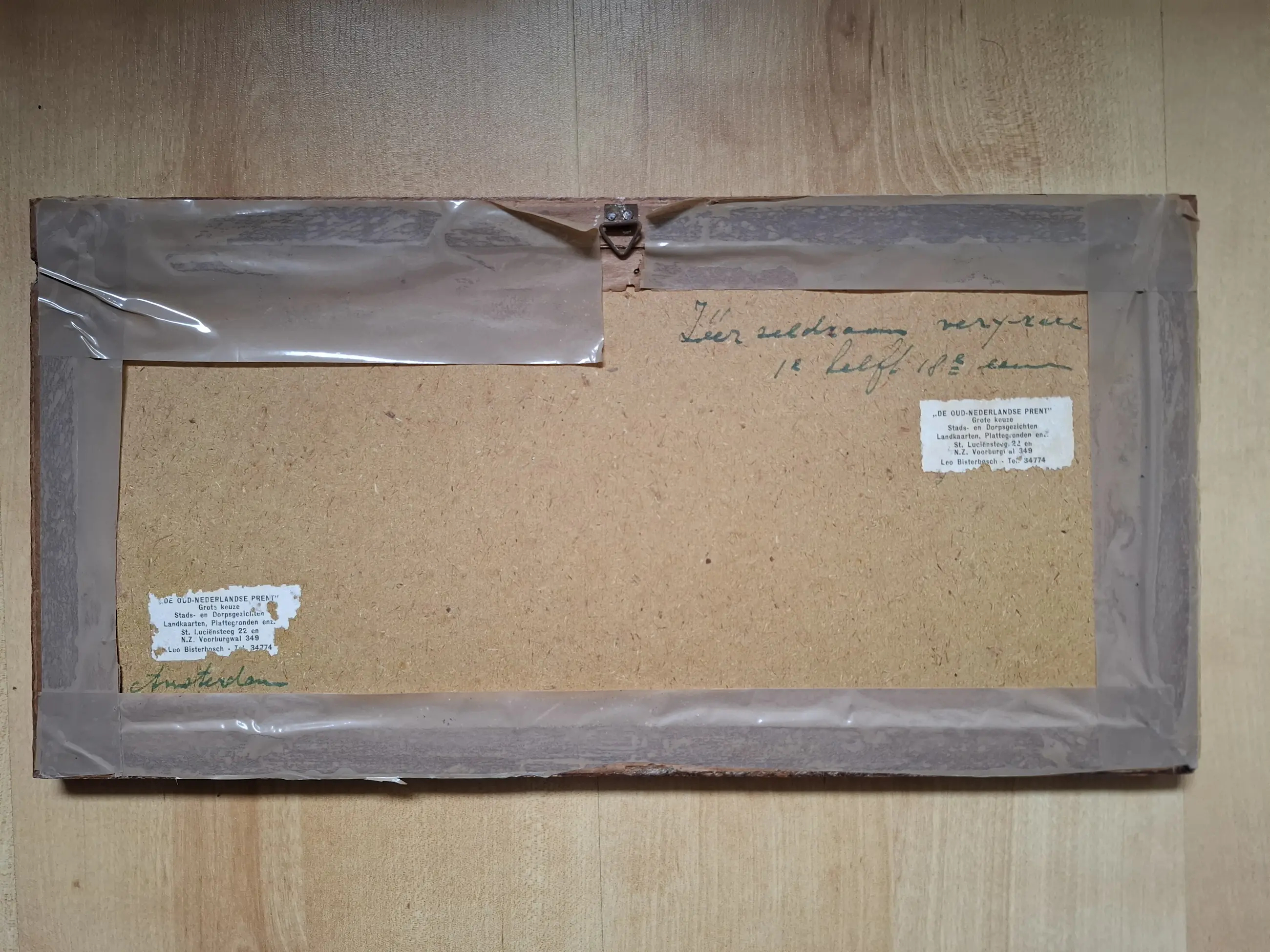 houtwerk in prima staat, geen beschadigingen, achterzijde is tape geplaatst omdat het originele papieren niet geheel meer goed zijn werk doet