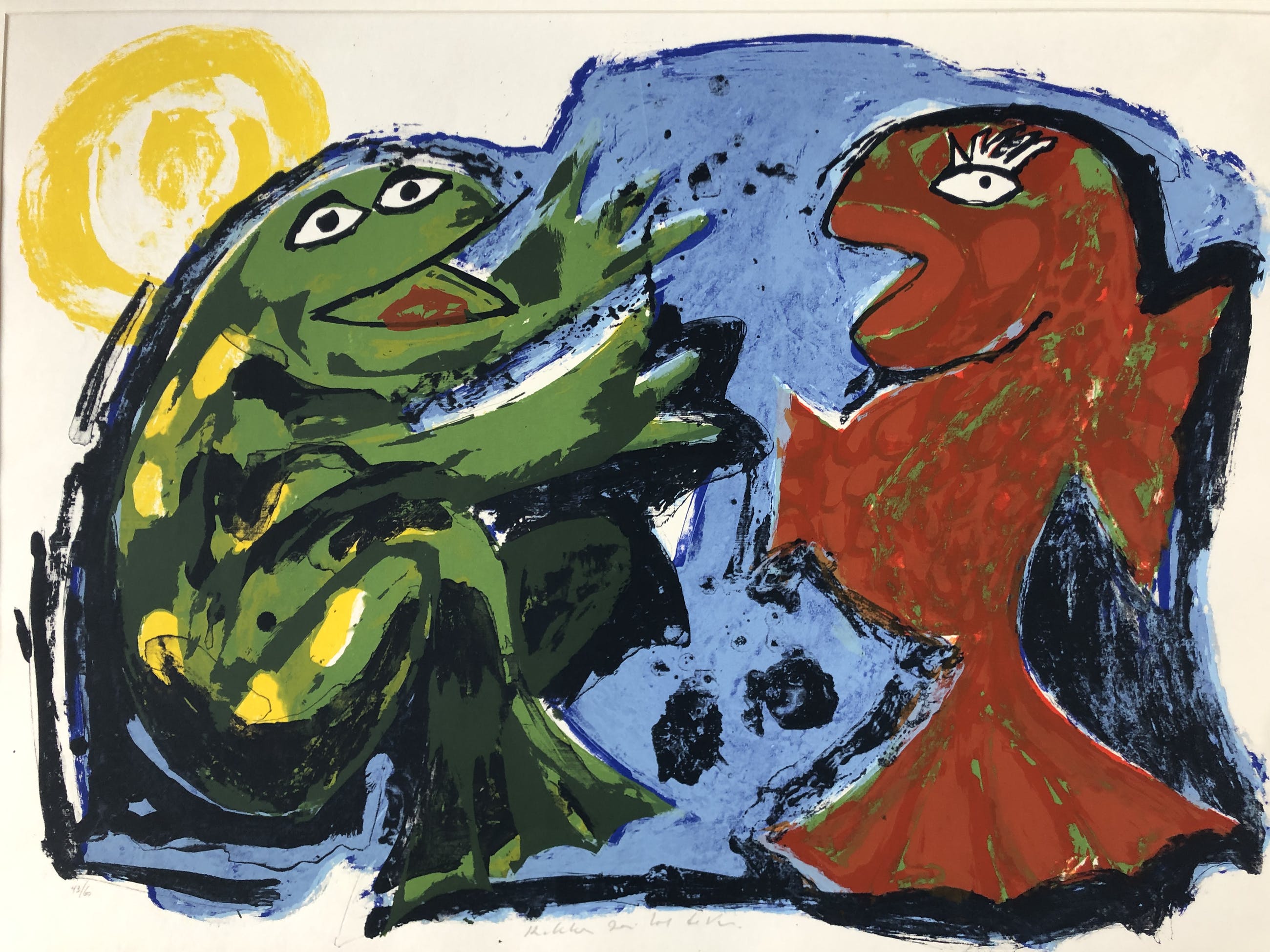 Mooie zeefdruk van John Lie a Fo in goede staat. Gesigneerd en genummerd. Opsturen zonder passe partout, ophalen met passe partout. U kunt het werk vooraf komen beoordelen. Na aankoop laten opslaan in onze verwarmde depot. Ook kunnen wij uw inlijsting verzorgen.