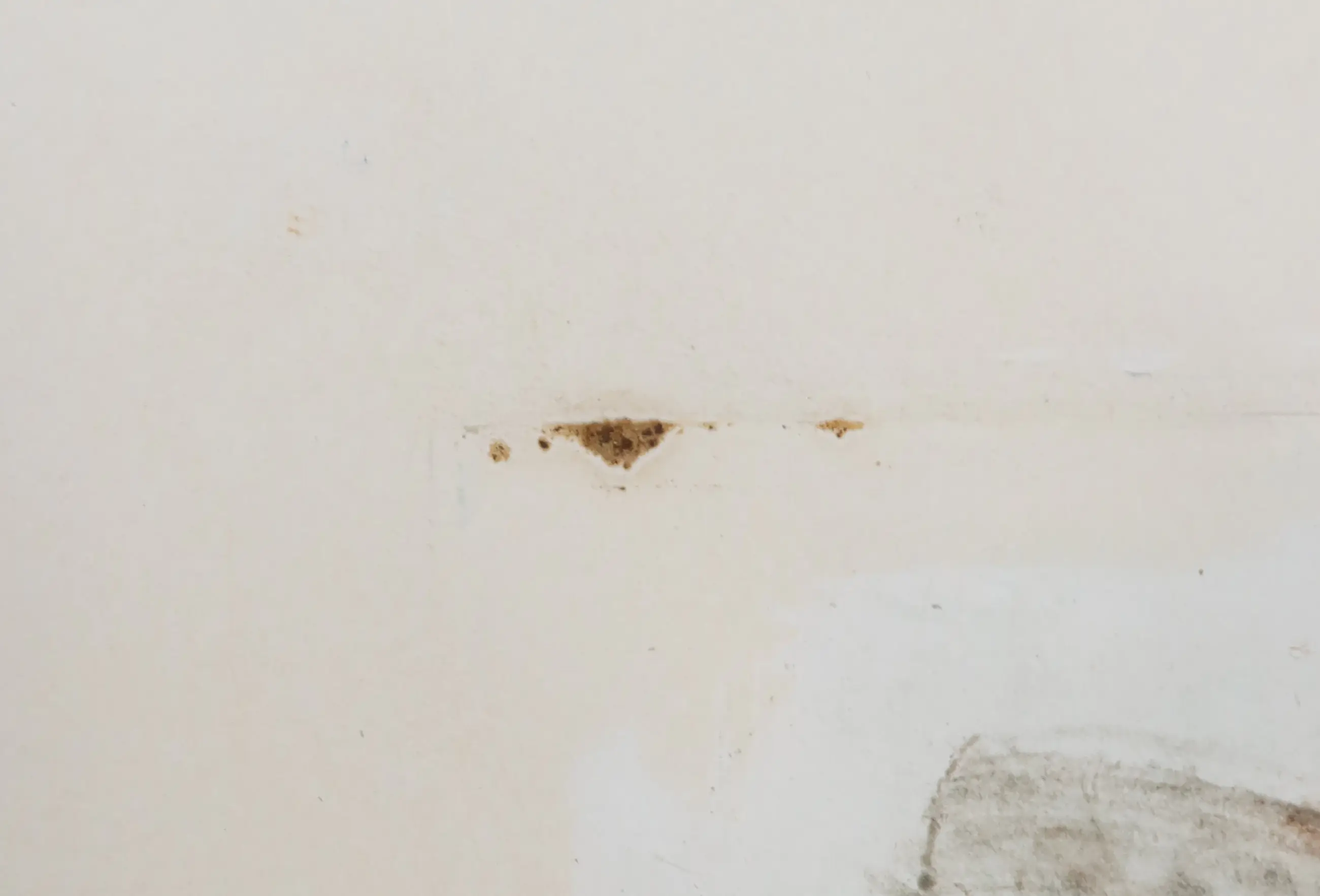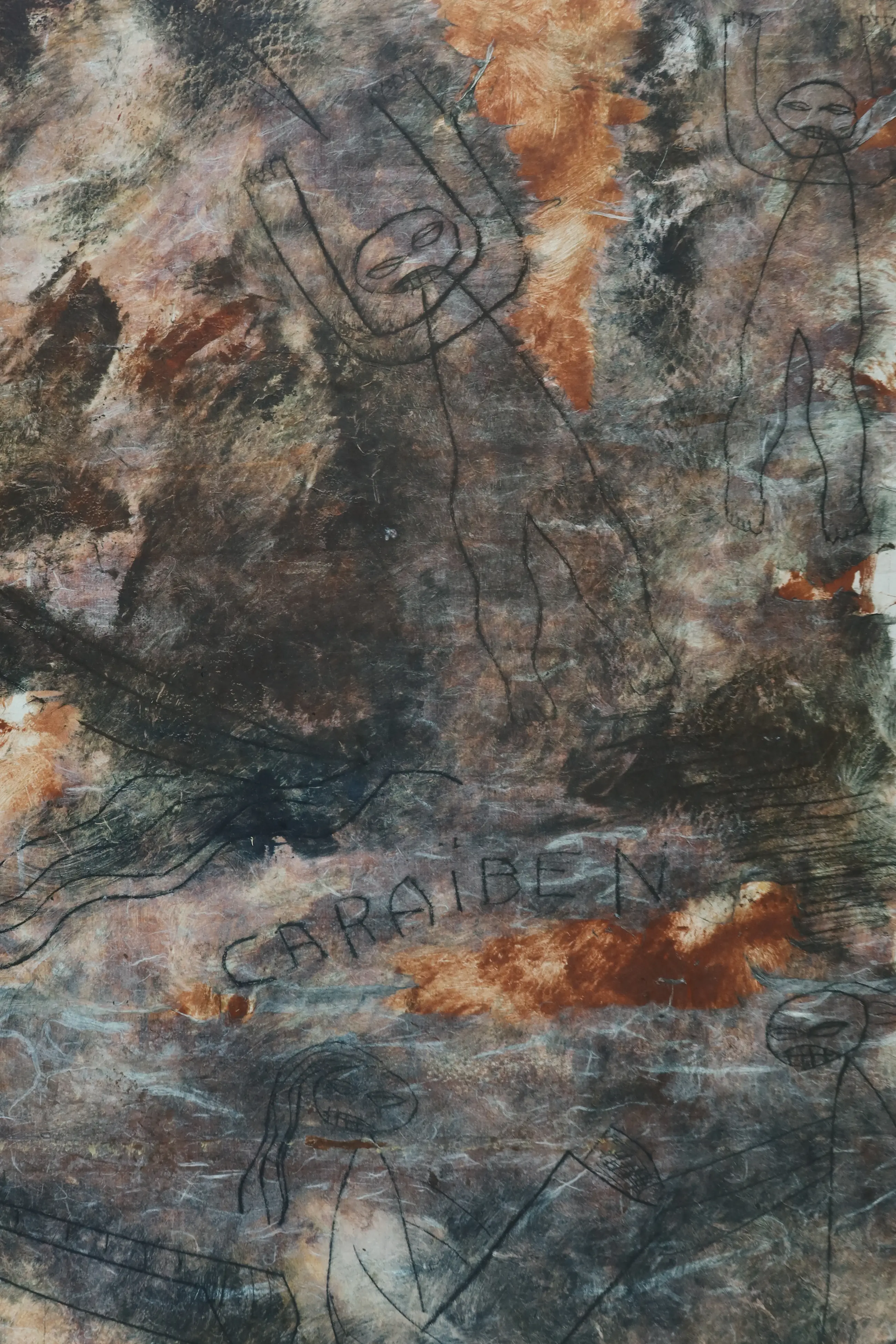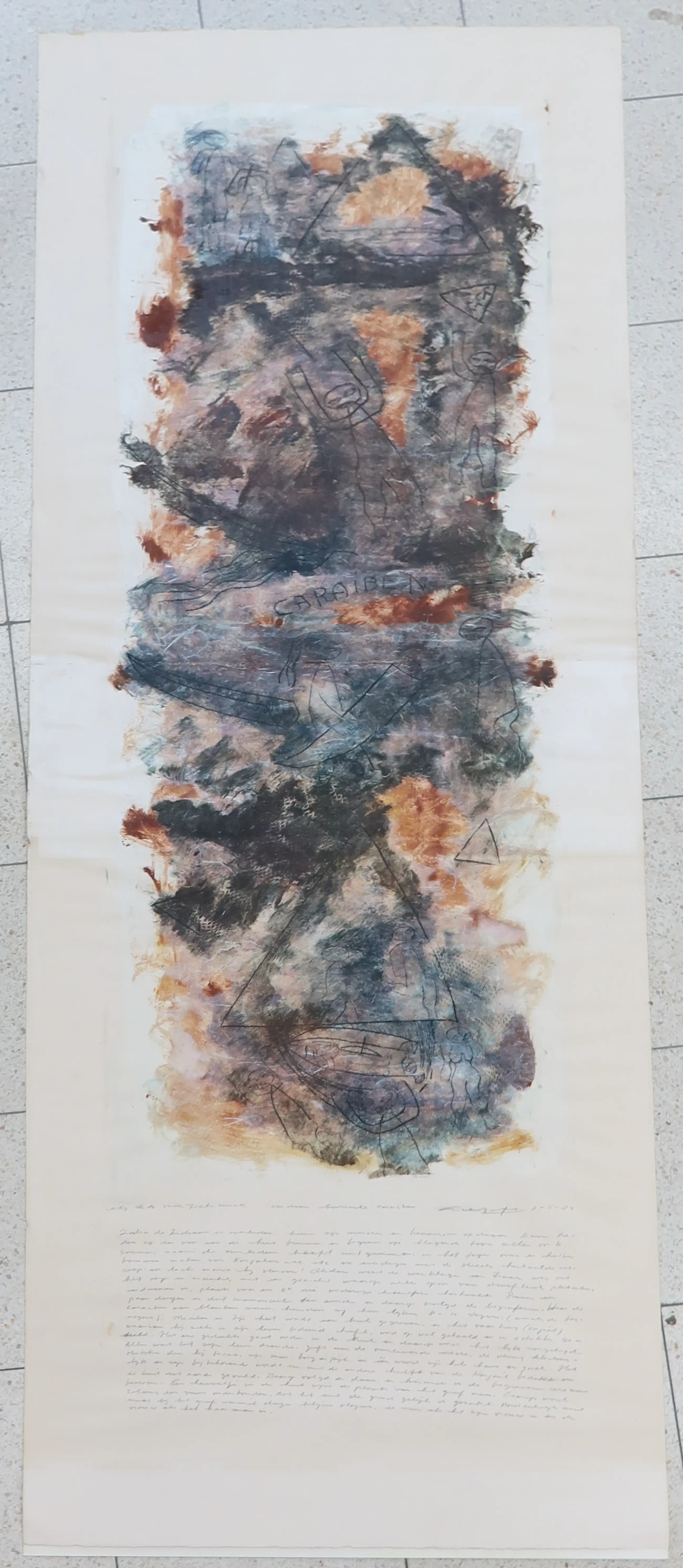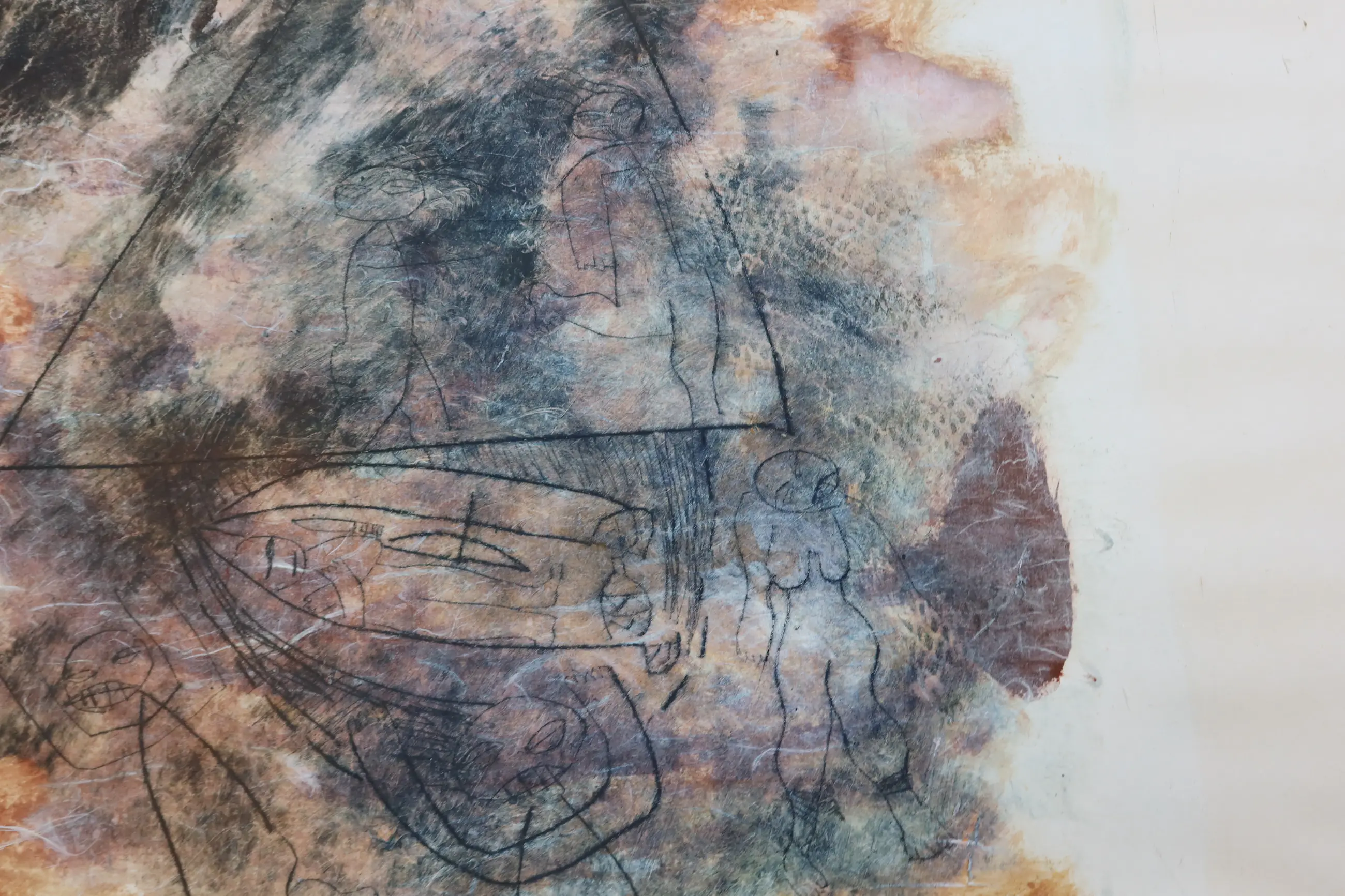 | Wat vlekken en vegen op het witte kader. Daarnaast zijn er op meerdere plekken in het papier sterke verkleuringen te zien. (zie detailfoto's) | |||||||||||