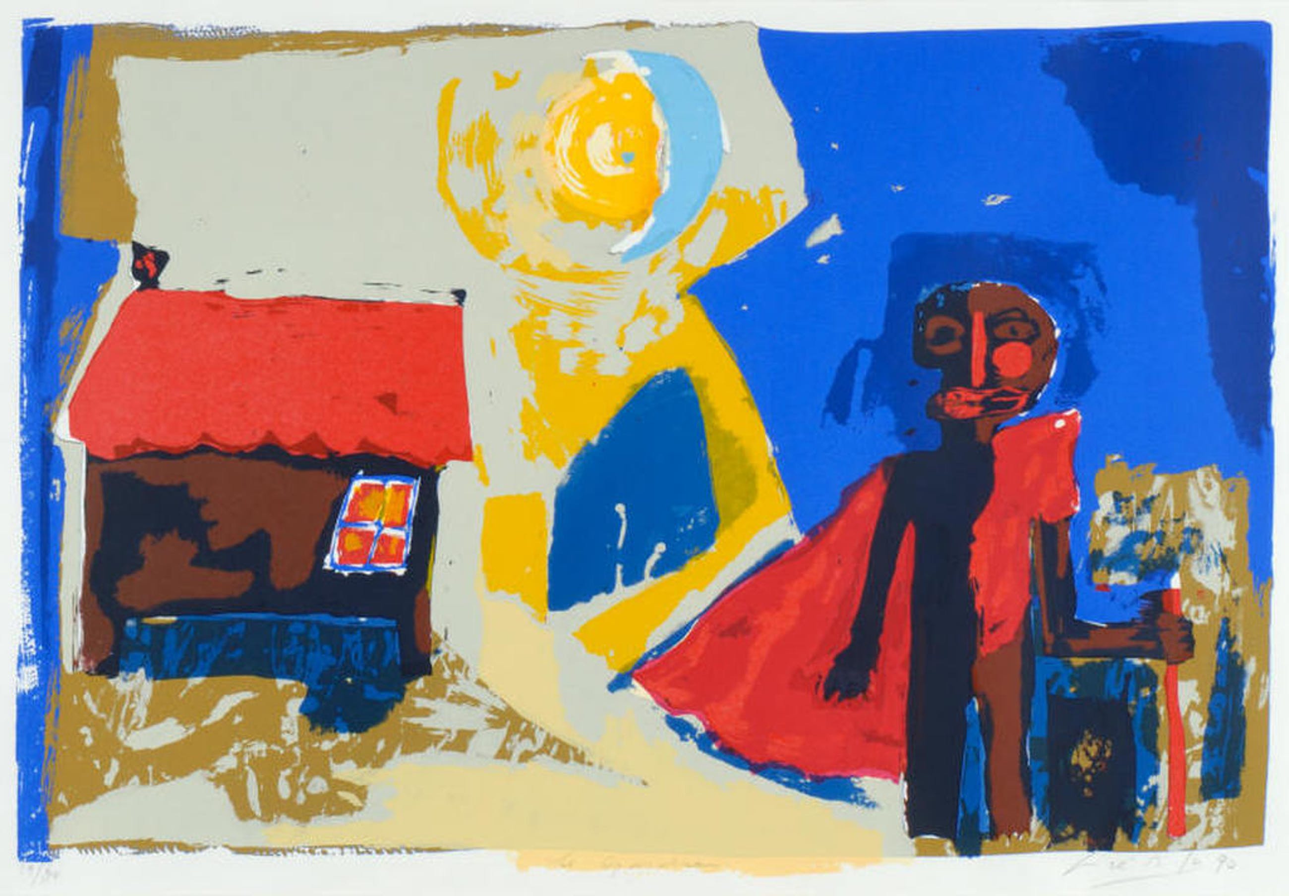 Grote kleurrijke zeefdruk van John Lie A Fo, prentmaat 72 x 92 cm en met passe partout 80 x 110 cm. Verkeert in perfecte staat. Gedrukt in een oplage van 60 exemplaren, dit is nummer 20. Kan worden afgehaald met passe partout in onze galerie in Arkel of verzonden worden zonder passe partou tper aangetekende post in een stevige kartonnen verpakking.