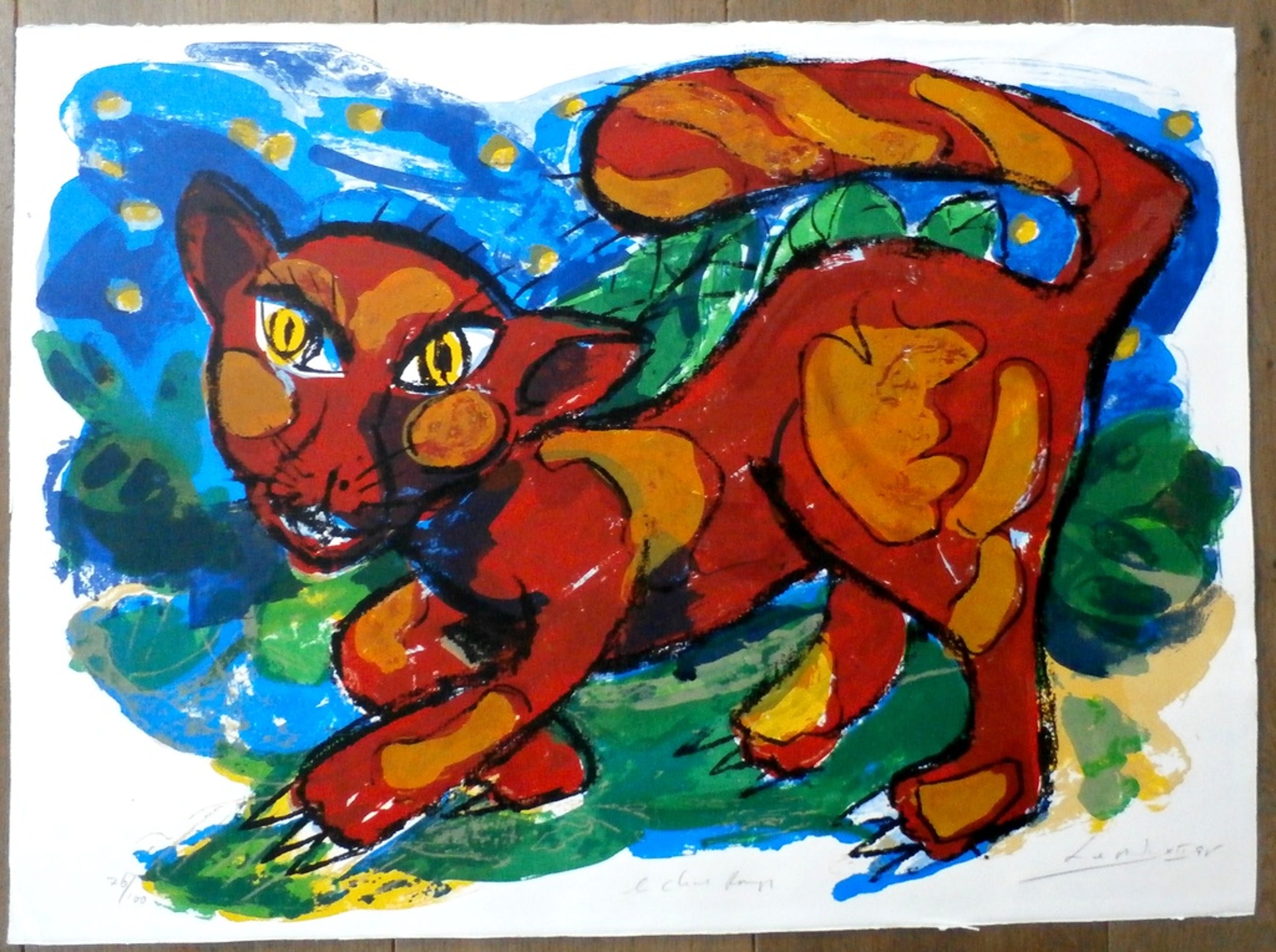 Zeefdruk van John Lie a Fo. Titel: Le chat rouge. Jaar: 1995. Nummer: 76/100. Afmetingen: H60 x b80 cm. Het werk is rechtsonder door de kunstenaar, met potlood, gesigneerd.