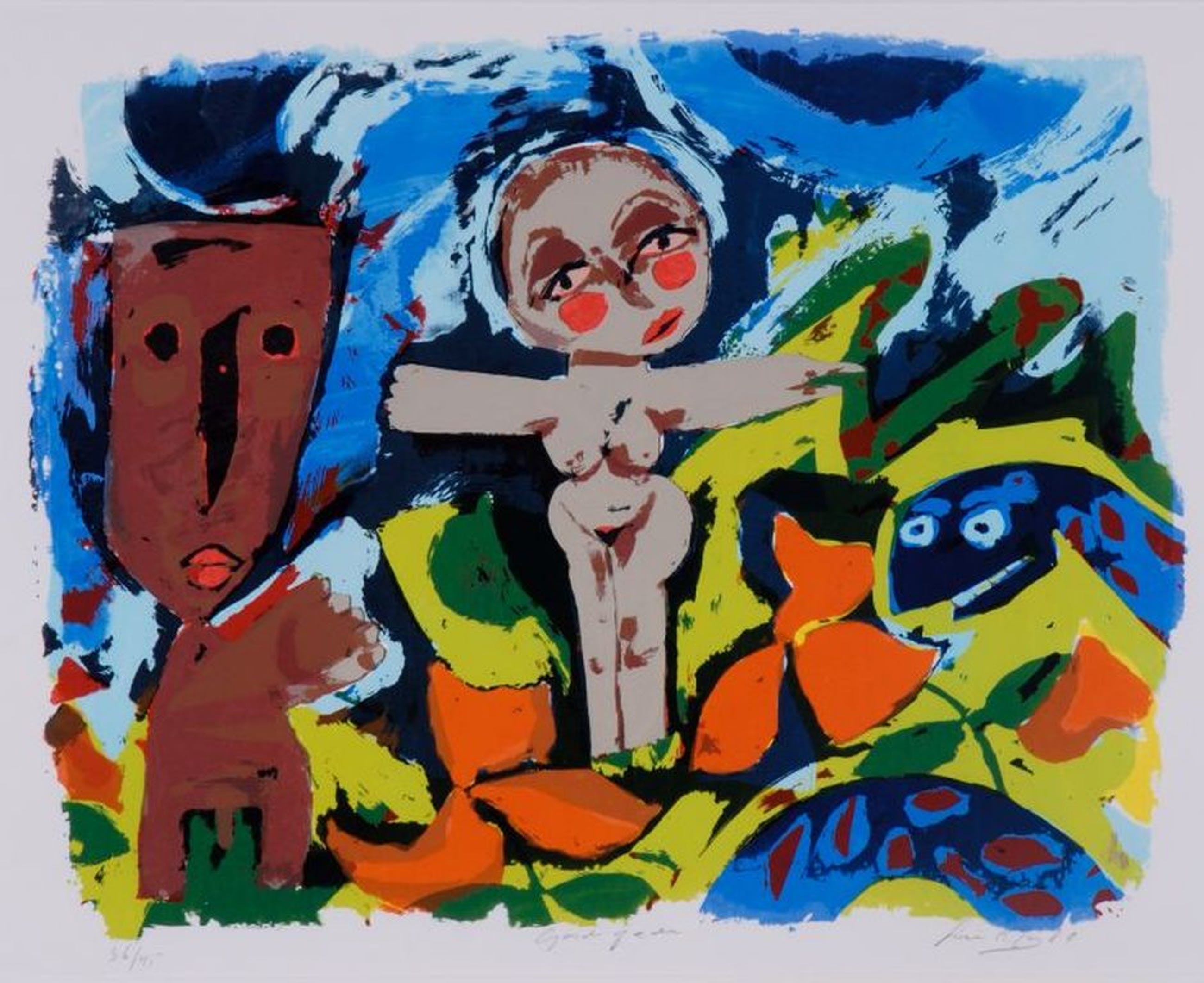 Gesigneerde en genummerde zeefdruk van John Lie a Fo, Kra uit 1989. Formaat 64 x 79 cm. Afgedrukt in een oplage van 45 exemplaren is dit nummer 36. De zeefdruk met passe-partout ( formaat 70 x 90 cm) kan worden opgehaald in onze galerie in Arkel of zonder passe-partout aangetekend worden verzonden. In verband met onze grote collectie John lie a Fo kan de nummering op de foto afwijken van het beschreven werk.