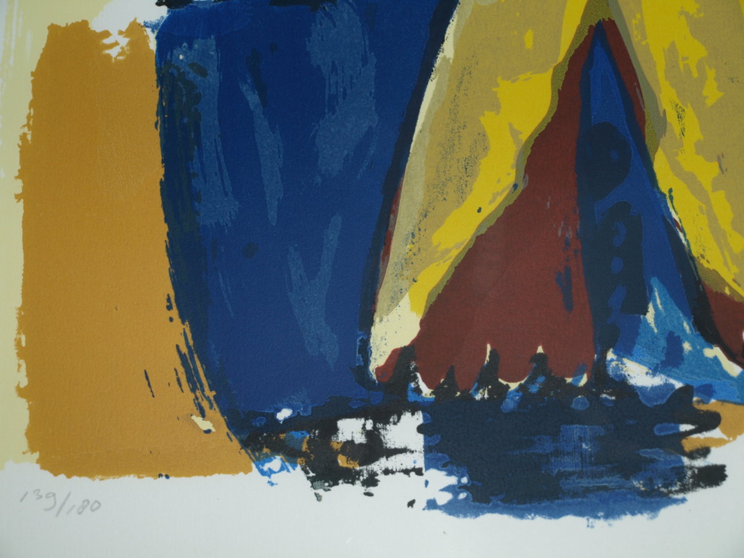 Conditie: De zeefdruk is in zeer goede staat. De glasplaat heeft een klein krasje in de rechterbenedenhoek (onder de signatuur).